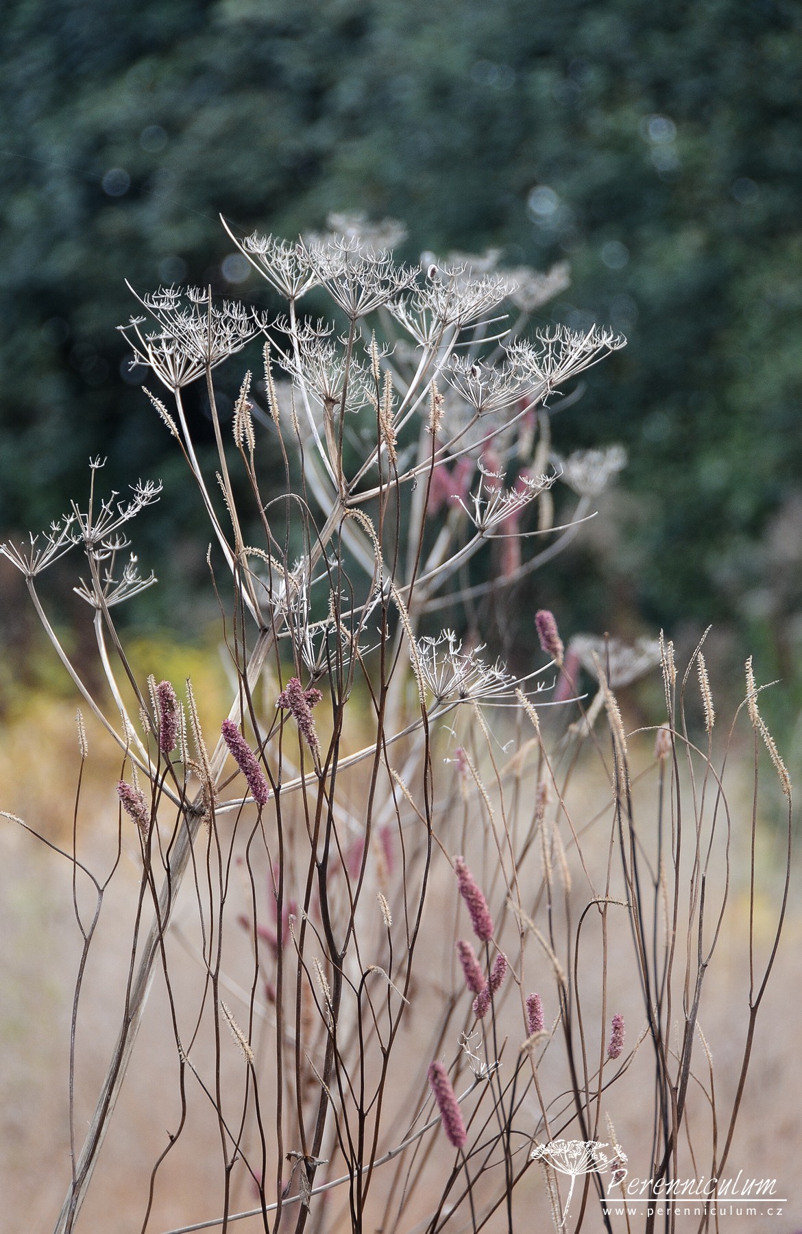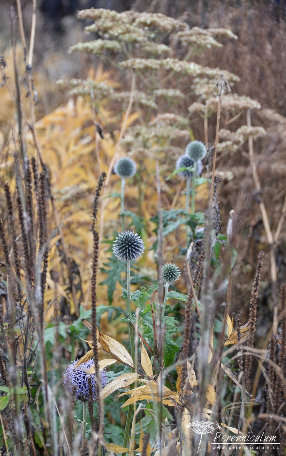 Na dlouhé cestě do Holandska jsme se stavili v lázeňském Gräflicher Park poblíž německého Bad Driburgu, kde Oudolf navrhl trvalkovou kompozici. Měkké podzimní paprsky svítili skrz zlatavé trávy a uschlé hnědé květenství trvalek, dokvétaly poslední rozchodníky a celý obrázek byl přesně jak z Oudolfových knih. Celému dojmu přispěl i rozlehlý park s krásnými vzrostlými stromy, které hrály všemi podzimními barvami. Kontrastem k této zlatavé, podzimní scenérii byly jasně zelené trávníky soustředěné v kruzích uprostřed cesty probíhající mezi dvěma dlouhými záhony. Tyto zelené kruhy měly různou výškovou morfologii. Někdy jste si mohli vlézt do trávníkové misky a jindy zas na pahorek. Z každé, i když na první pohled malé, terénní úrovně se vám najednou naskytl jiný úhel pohledu. Díky ponechaným odkvetlým trvalkám bylo stále co obdivovat. Tvary a struktury totiž vyniknou mnohem víc, když se člověk nesoustředí na pestré barvy. No, posuďte sami.