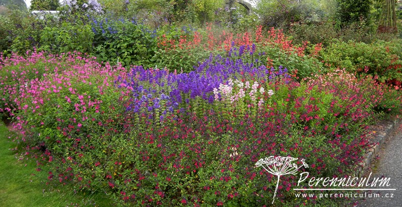 A do zahrady je opravdu z čeho vybírat. Rod Salvia zahrnuje přes 1000 různých druhů od letniček přes trvalky až po polokeře rostoucí na všech kontinentech. Většina druhů u nás nepřezimuje, ale používají se hojně jako letničky v barvách od jasně modré přes fialovou, růžovou až do jasně červené či čistě bílé. Za škálou barev nezaostává ani rozmanitost habitů, výšek, a tvarů květů resp. nápadných a různě tvarovaných listenů. Posuďte sami záhon složený pouze z druhů rodu Salvia.