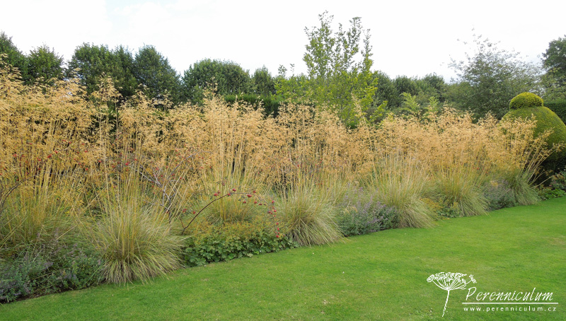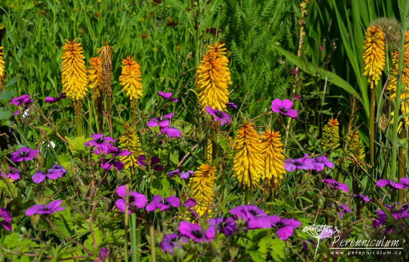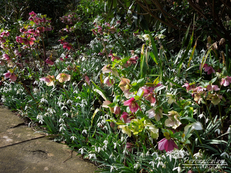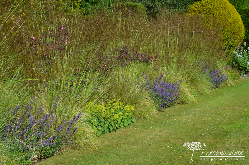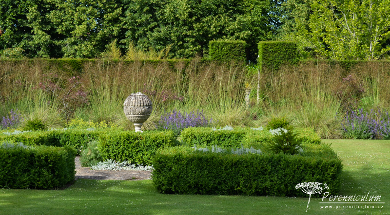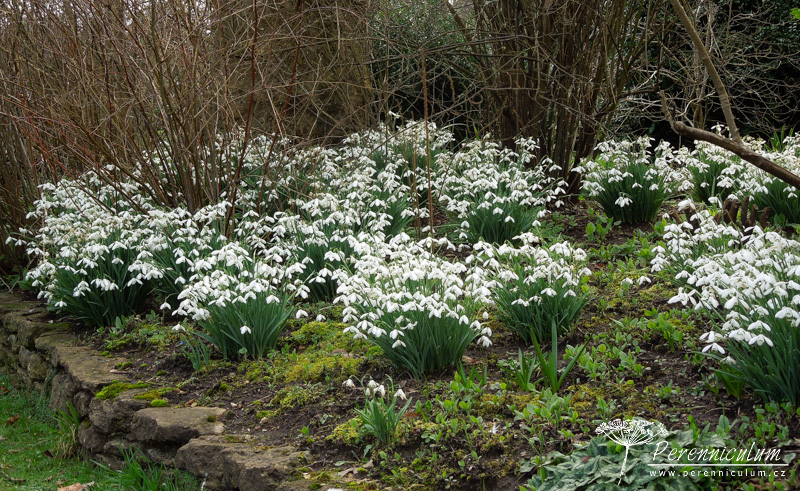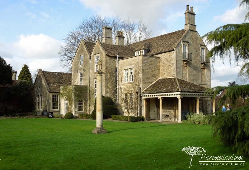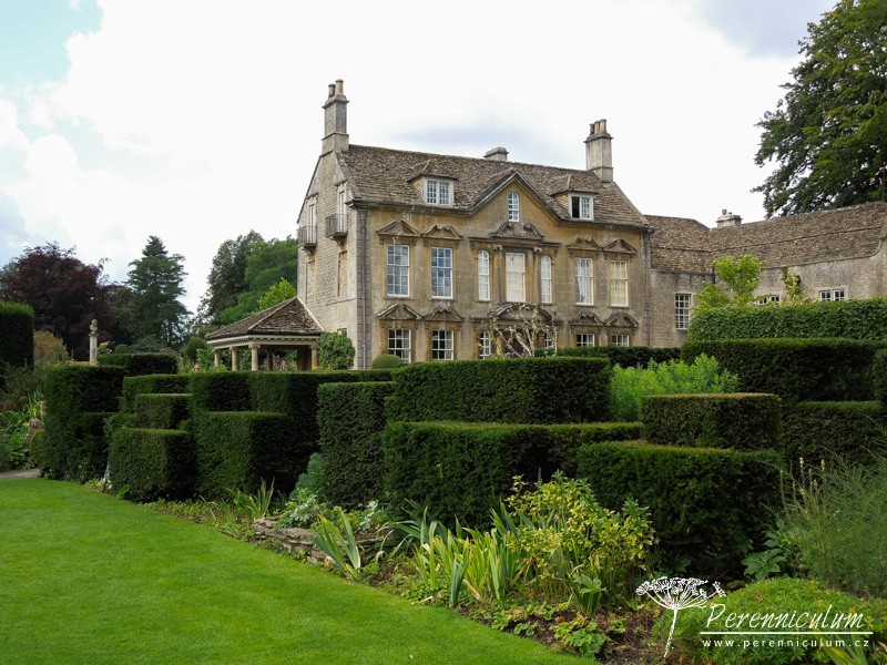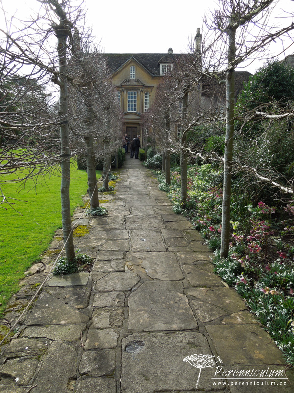 Spolu s čemeřicemi (Helleborus) a šafrány (Crocus) vykvétají brzy na jaře i různé kultivary sněženek (Galanthus). Detail podsadby lipové aleje - mezi vyššími čemeřicemi (Helleborus) září bílé květy sněženek (Galanthus). Dům z místního kamene výborně zapadá do okolního prostředí. Nízko sečený trávník s mladým cedrem podtrhává jeho jednoduchost a eleganci. Na údržbu poměrně náročná zahrada zahrnuje několik stříhaných živých plotů. Dramatické pozadí tomuto trvalkovému záhonu dodávají různě vysoké "kvádry" tisu. Cestičku od branky k domu lemuje alej lip tvarovaných do špalíru a podsázených jarními efemery - čemeřicemi, sněženkami, bramboříky. Zelený tunel vedoucí prostředkem užitkové zahrádky vznikl propletením vinné révy a tvarovanými jabloněmi a hrušněmi. "Kavylovou alej" během léta doplňují fialové květy šanty (Nepeta) a limetkově zelená Alchemilla mollis.Na podzim pak z rozevlátých zlatých klasů vykukují červené šípky či paličky bělotrnu (Echinops ritro).Podstatnou část zahrady The Courts tvoří jezírko osázené přírodními výsadbami, které napájí okrasný kamenný bazének s lekníny. Stinné zákoutí u vodní hladiny skýtá prostor pro odpočinek v horkých letních dnech.Blízko u domu se nachází ornamentální výsadby s nízkým střiženým plůtkem.Na závěr jedna velmi povedená kombinace barev - zelenožluté listy Geranium 'Ann Folkard' výborně podtrhují zlatožluté květy Kniphofie zatímco sytě purpurové květy s téměř černými středy dodávají kompozici kontrast.