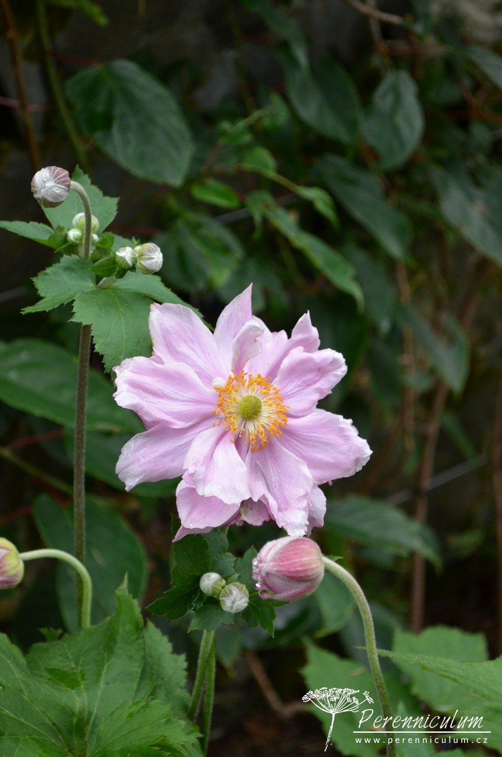 Jedná se o velmi vitální, bujně rostoucí trvalku s výraznými trojlaločnatými, tmavě zelenými listy s jemnými, bílými chloupky na spodní straně (znak zděděný po Anemone vitifolia). Vzpřímený dlouhý tenký stonek se na vrcholu krátce větví a nese až 20 sterilních květů. Květy měří běžně až 8 cm v průměru a jsou složené ze 6 až 15 okvětních plátků v odstínech od bílé do sytě růžové.