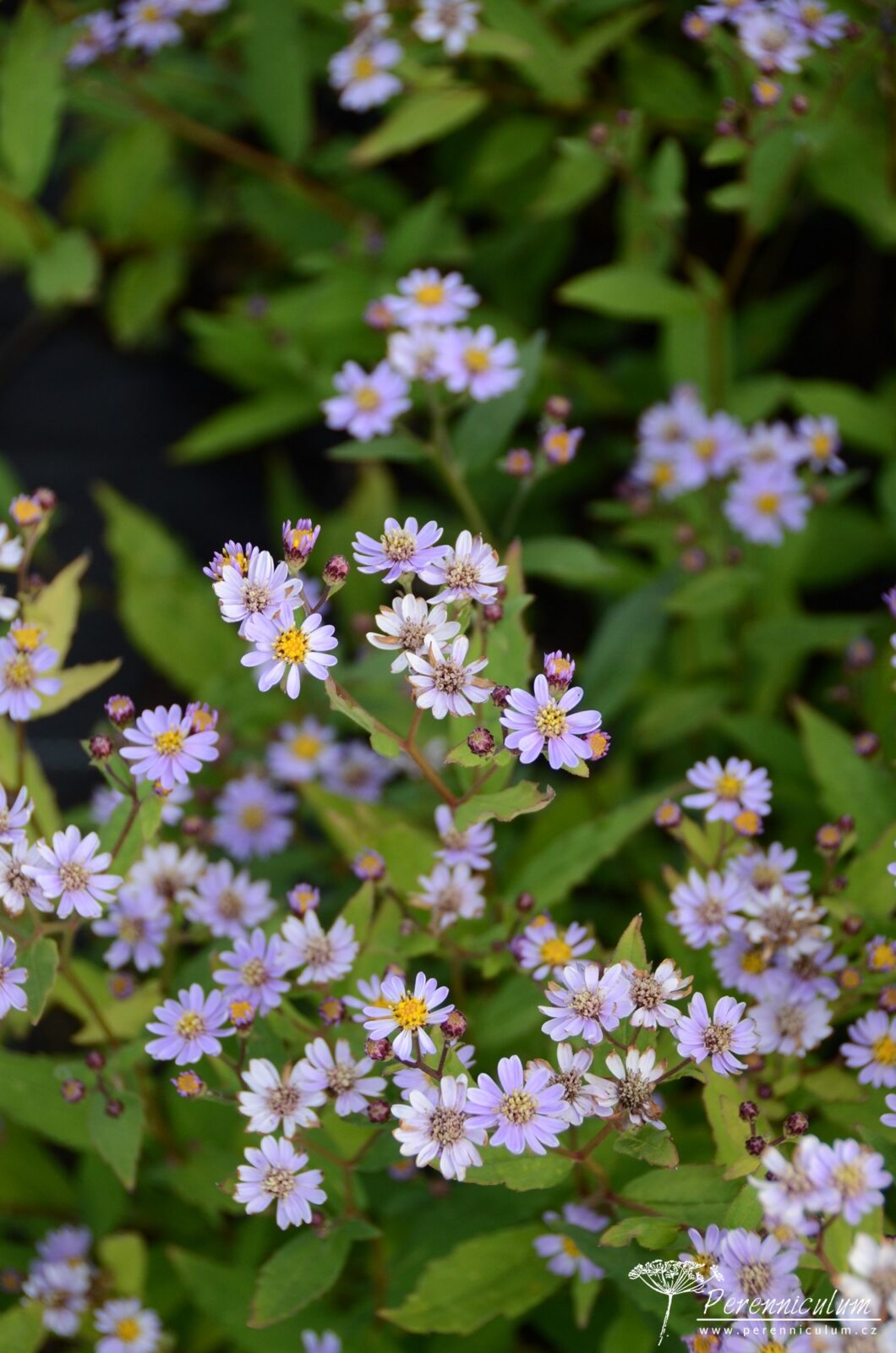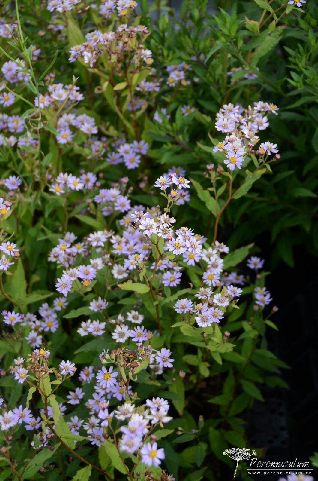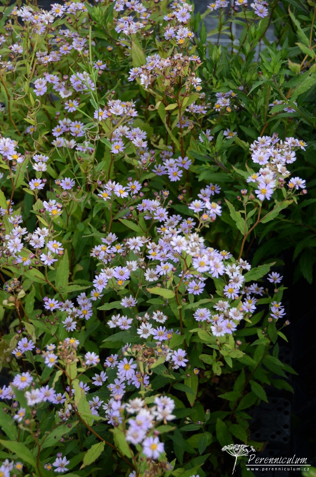 Aster ageratoides pochází z východní Asie, Sibiře, Mongolska, jihovýchodní Číny a Japonska. V domovině čistý druh dorůstá 30 až 100 cm výšky a větví se až v horních partiích. Tuhé, vzpřímené stonky jsou v zemi ukotveny dlouhými oddenky, díky nimž se šíří a tvoří husté půdopokryvné koberce. Lodyžní lístky jsou tmavě sytě zelené, lysé, po okraji zubaté, a přisedají k lodyze, nemají řapík. Bílé, lehce nafialovělé květy se žlutým středem kvetou koncem léta a začátkem podzimu.