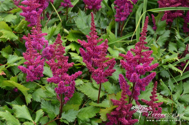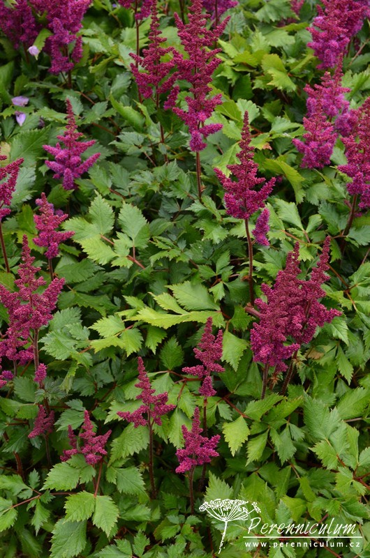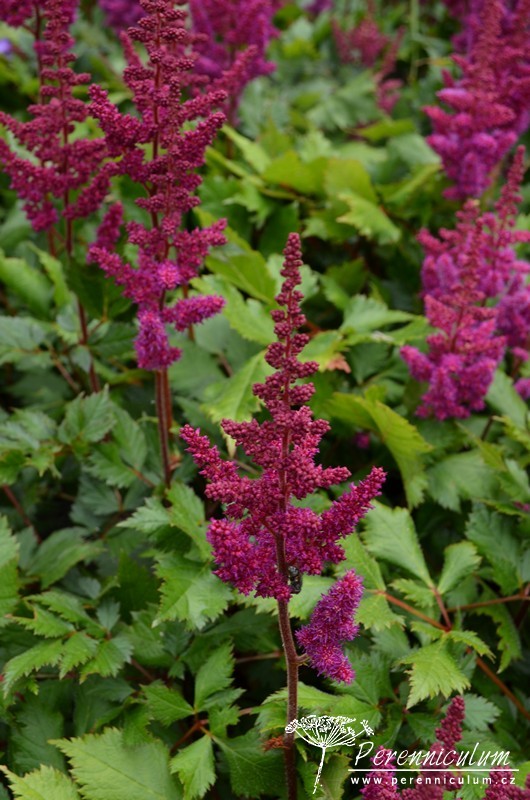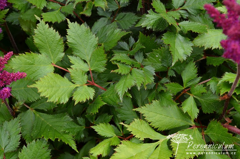 Astilbe chinensis pochází z východní Číny, Mongolska a Korei, kde obvykle roste ve vlhkých lesích či podél přistíněných potoků. Jedná se o poměrně variabilní druh, který silně odnožuje, rozrůstá se. Listy jsou dělené, dlouze řapíkaté, lístky jsou krátce řapíkaté, kopinaté, ostře dvojitě pilovité, sytě zelené. Nejen řapíky, ale také vzpřímené stonky tyčící se nad masou listů, jsou zabarvené do vínova či tmavě hněda v závislosti na stanovišti. Astilbe chinensis se velmi dobře pozná podle toho, že celá rostlina je rezavě chlupatá.