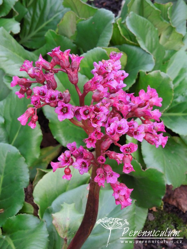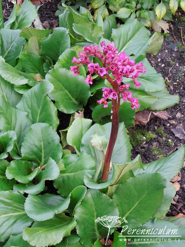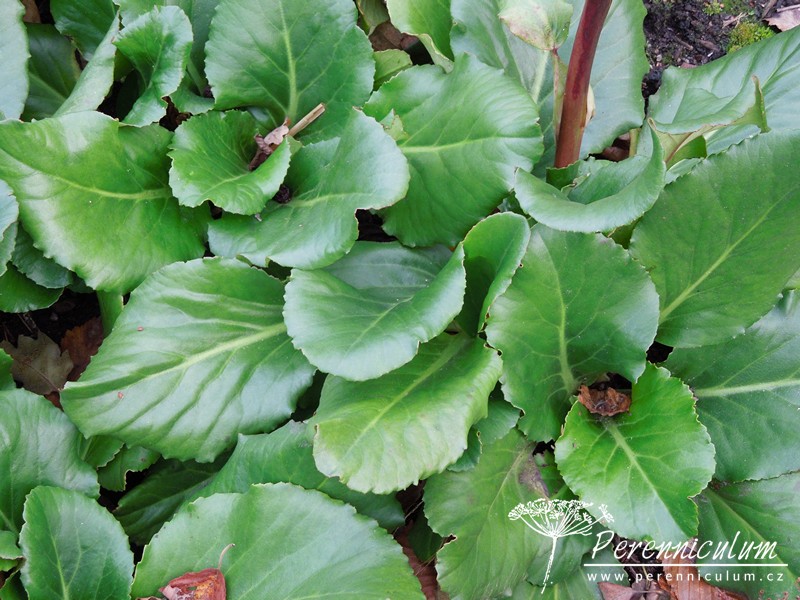 Vytváří nízké trsy stálezelených, kožovitých, lesklých, tmavě zelených listů, které se rozšiřují nad či těsně pod zemí plazivými oddenky vytvářející dlouhověké kolonie rostlin. Kulaté až široce elipsovité listy měří až 20 cm a na podzim se výrazně barví do tmavě purpurova. Na tlustých, masitých stoncích vykvétají koncem jara desítky menších zvonkovitých růžovopurpurových květů.