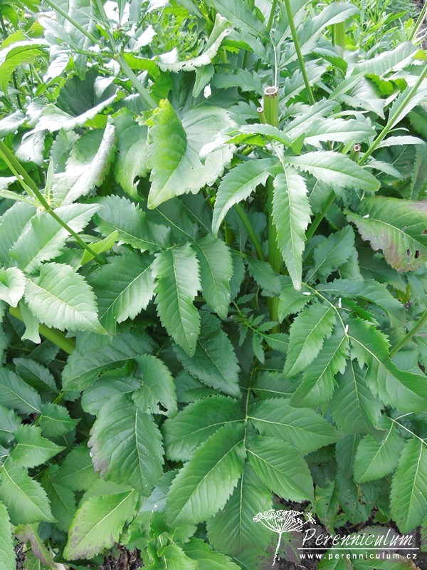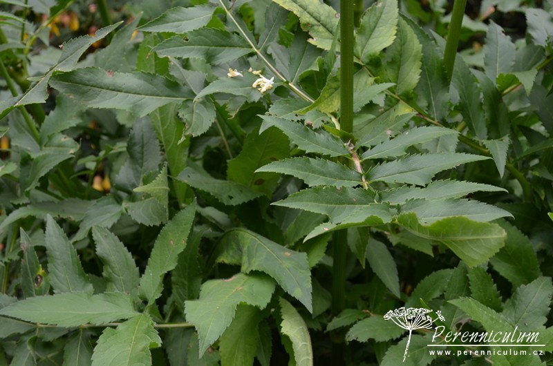 Hlavatka obrovská je vskutku obrovská trvalka, která může v přírodě dosahovat výšky až přes tři metry, v kultuře pak běžně dorůstá 2 až 2,5 metru. Až půl metru dlouhé listy jsou dělené. Hrubě zubaté, kopinaté, svěže zelené lístky vyrůstají vstřícně. Pevné, otevřeně větvené stonky jsou v horní polovině neolistěné a nesou světle pastelově žlutá květenství se zelenavým středem ještě neotevřených poupat. Strboul, jak se typ květenství nazývá, měří v průměru až 6 cm.