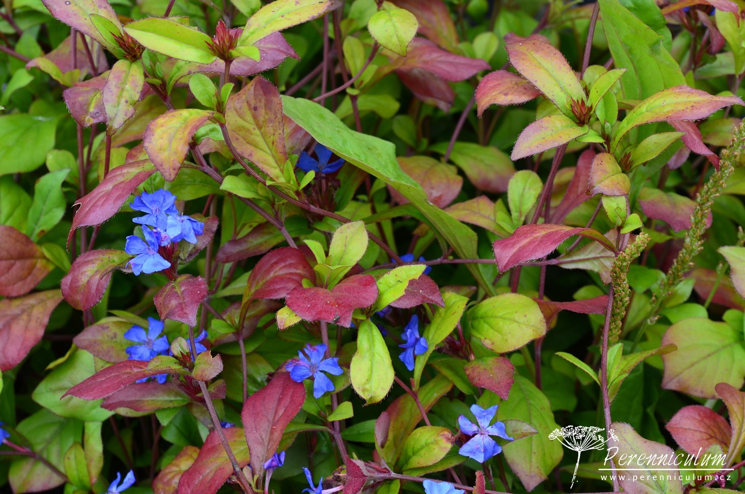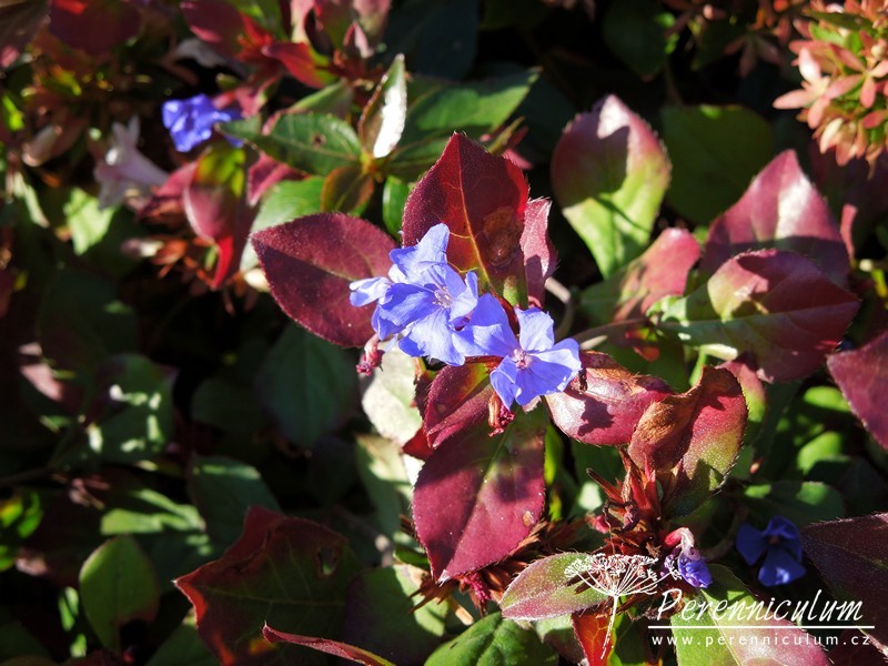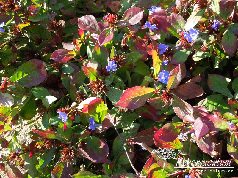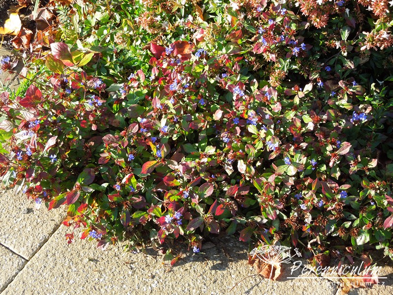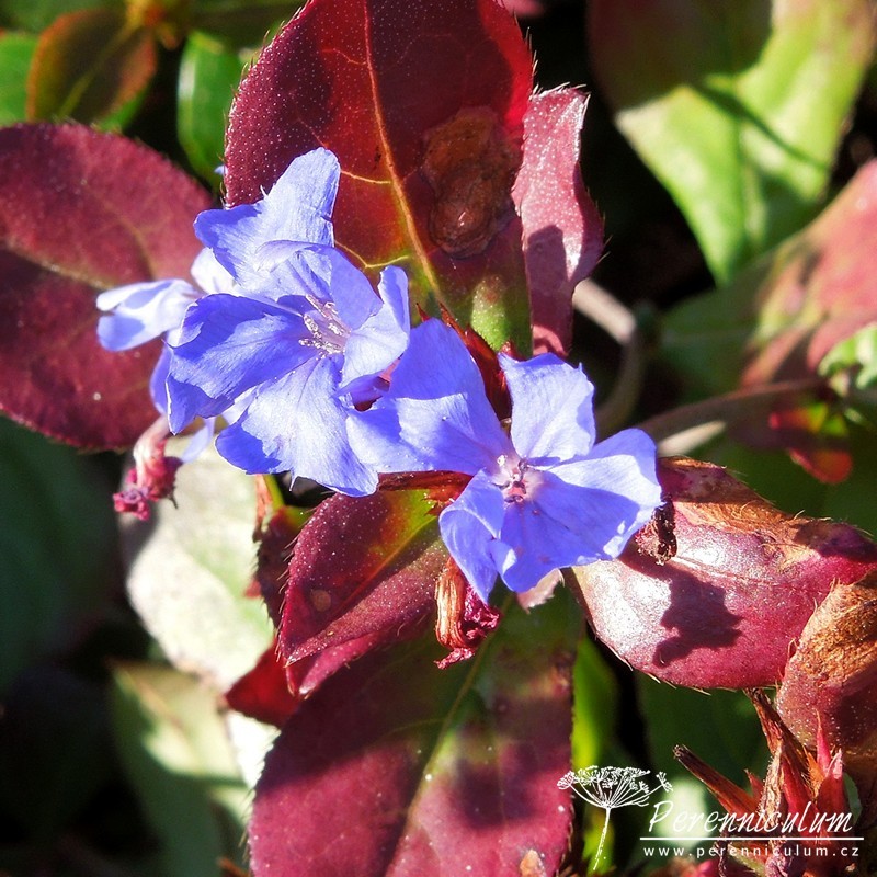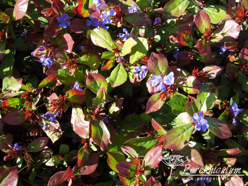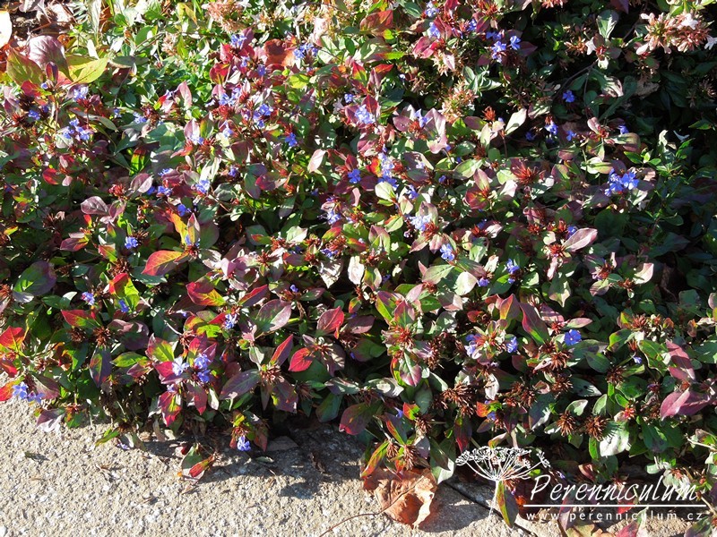 Ceratostigma plumbaginoides pochází ze severní a centrální části Číny, kde roste na otevřených slunných pláních. Díky vitálním plazivým oddenkům se rostlina velmi aktivně rozšiřuje a brzy vytváří souvislý půdokryvný porost. Purpurové lodyhy dosahují výšky okolo 35 cm a nesou sytě zelené vejčité zašpičatělé listy, které se na podzim barví do výrazně červenopurporova. Báze často dřevnatí. Raší později na jaře (přelom dubna a května). Lodyhy jsou zakončeny hlávkou složenou až z 30 květů, které měří zhruba 2,5 cm v průměru a jejich azurově modrá barva výborně kontrastuje s červenavým podzimním zbarvením listů. Kvete od září do října.