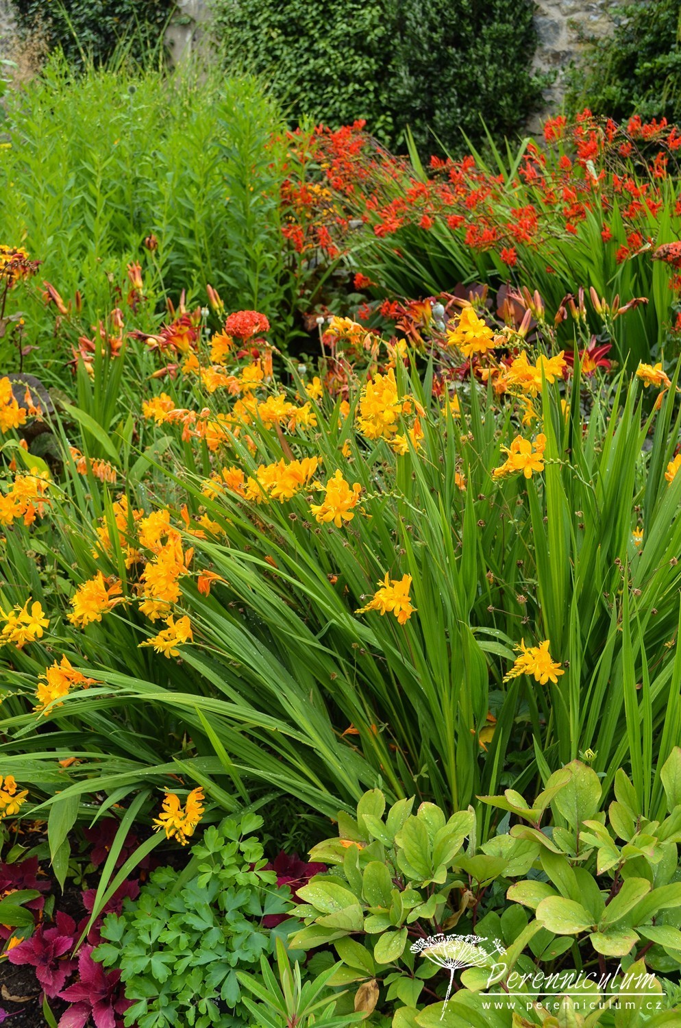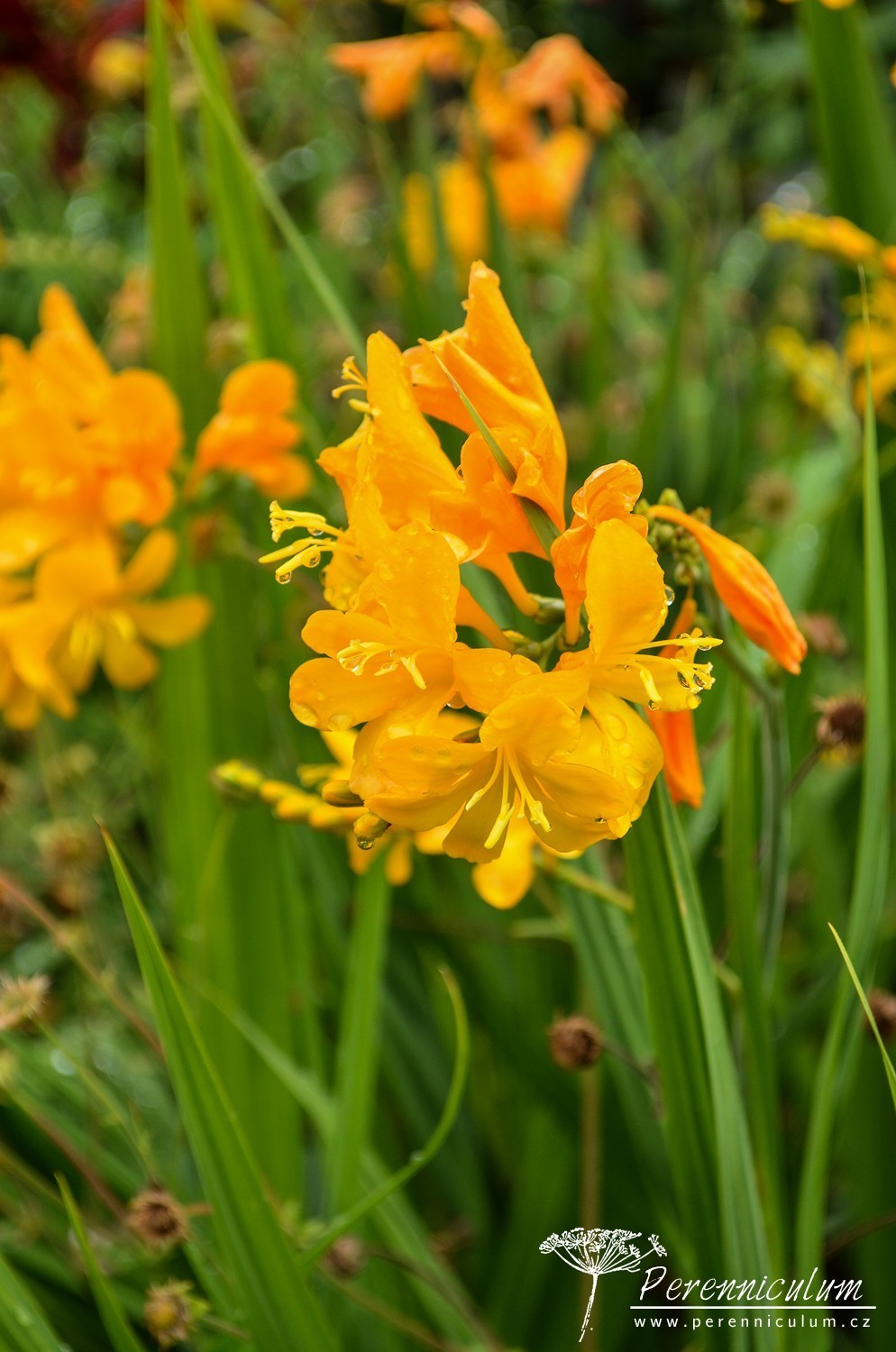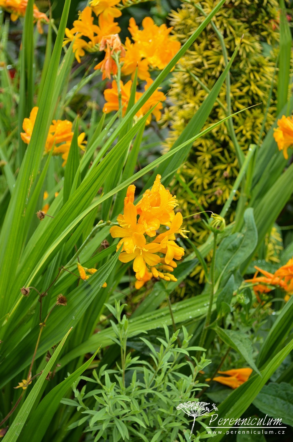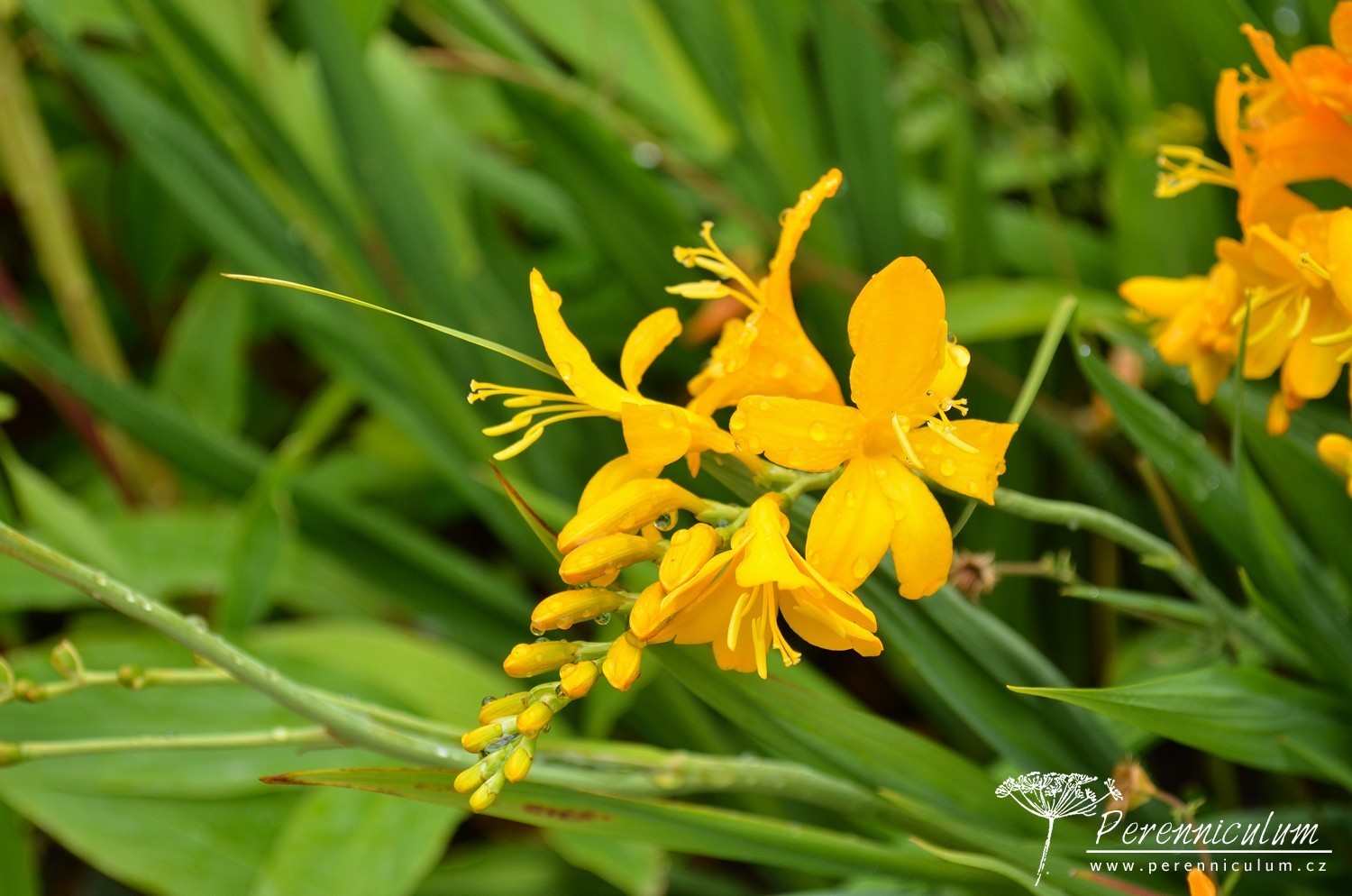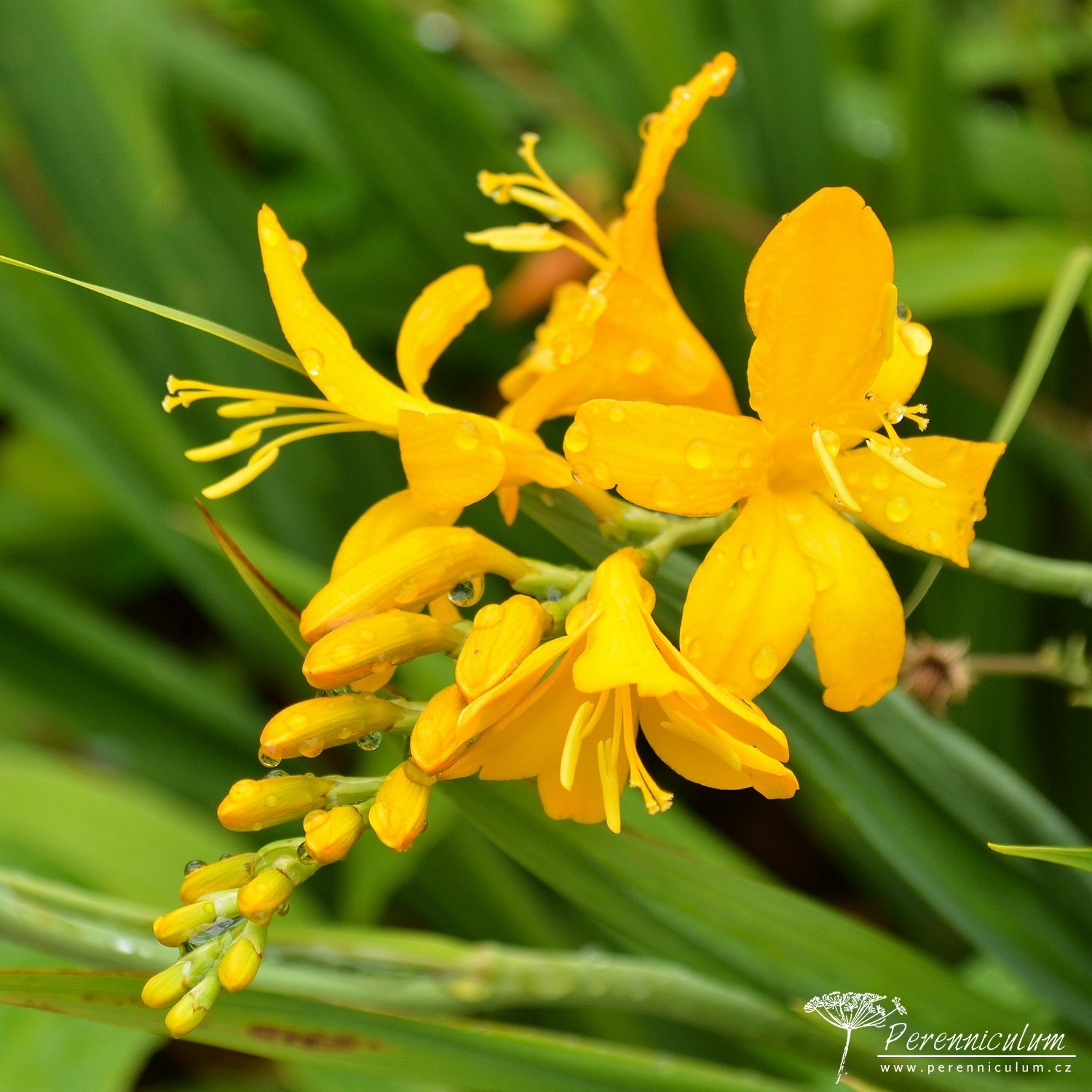 Crocosmia 'Walberton Yellow' vytváří podzemní zásobní hlízu, ze které vyrůstá hustý trs mečovitých, úzkých, sytě zelených listů. Nové podzemní hlízky přirůstají směrem k povrchu a starší se zanořují hlouběji. Na rozvětvených květních stoncích vykvétají těsně nad trsem listů obloukovitě skloněná květenství. Klasovité květenství nese až 20 drobných, sytě zlatožlutých květů uspořádaných ve dvou řadách. Crocosmia 'Walberton Yellow' je menší, kompaktnější kultivar, v květu dosahuje výšky jen 75 cm. Proto se hodí do menších zahrad.