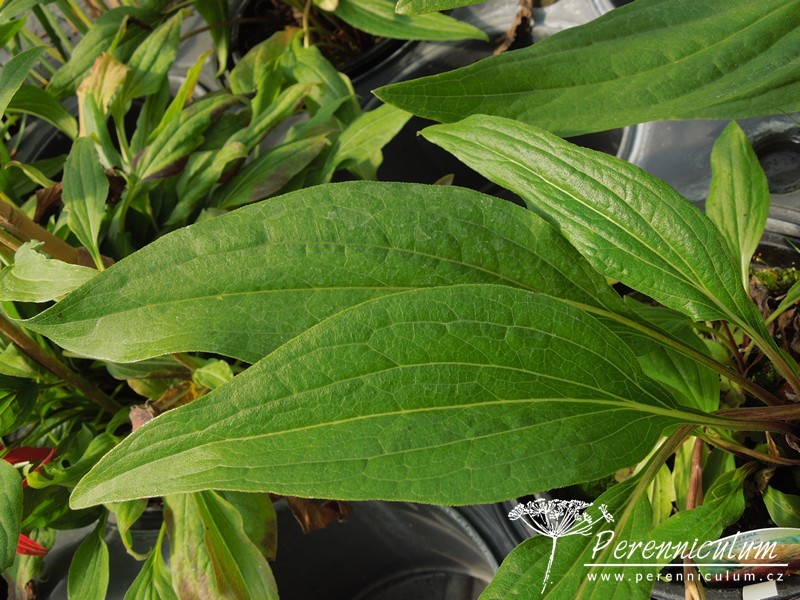 Vzpřímené, tuhé, nevětvené stonky dosahují výšky do jednoho metru výjimečně i více a každý nese jedno v průměru až 12 cm široké květenství. Kvete od konce července do září, někdy až října. Pevné stonky dělají z třapatkovky výbornou květinu k řezu, ve váze vydrží až 8 dní. Bazální listy jsou oválné s dlouhou špičkou, široké, drsně chlupaté, ostře zubaté a dlouze řapíkaté. Lodyžní listy jsou užší a menší.