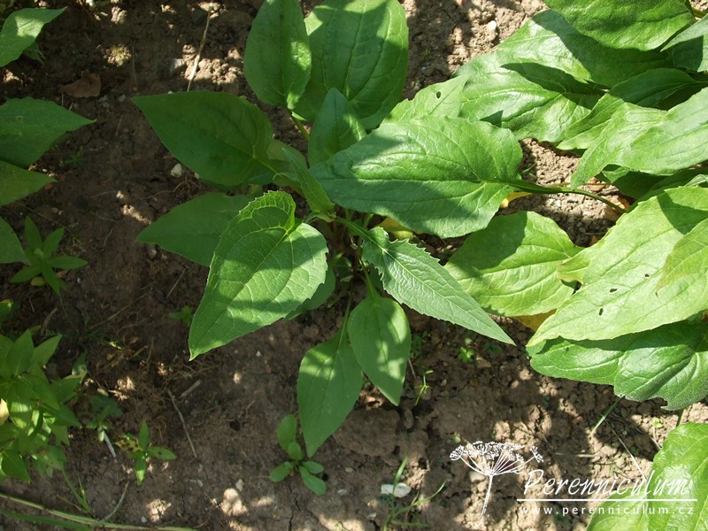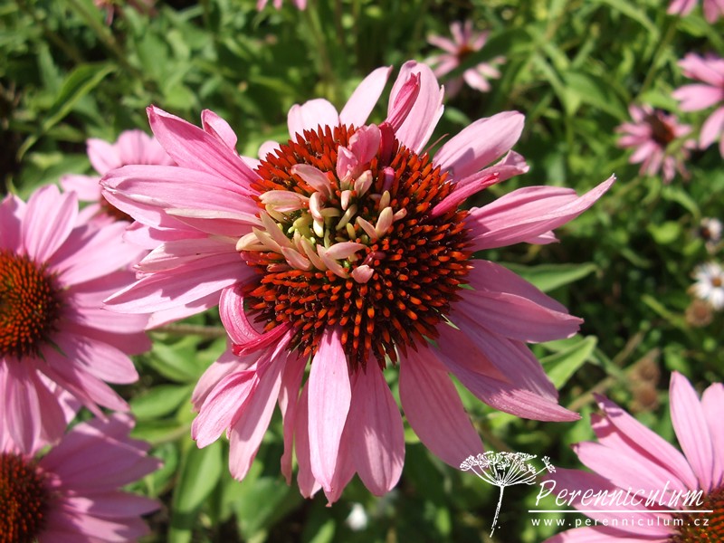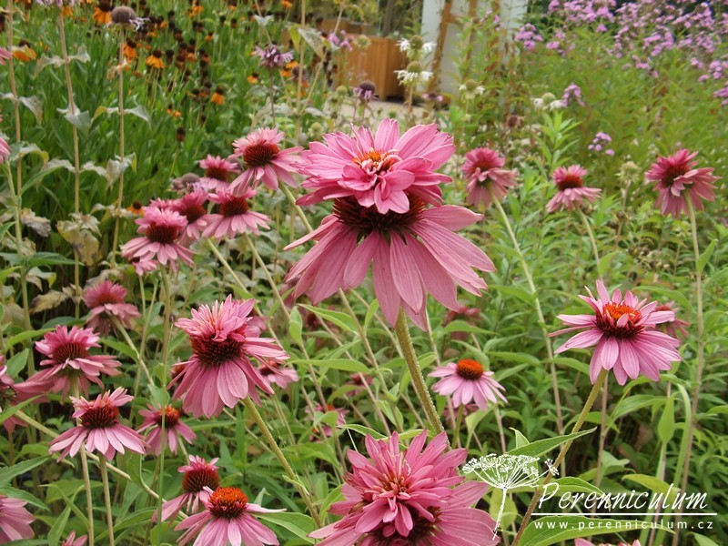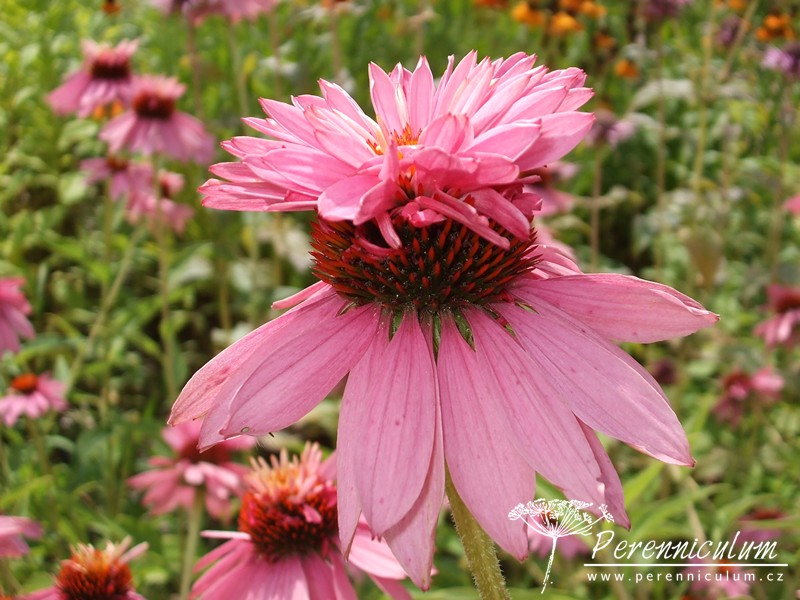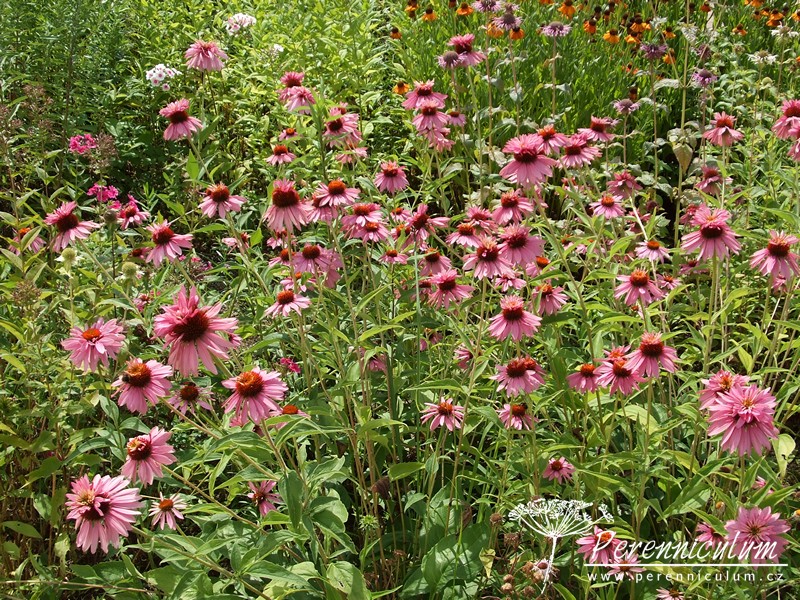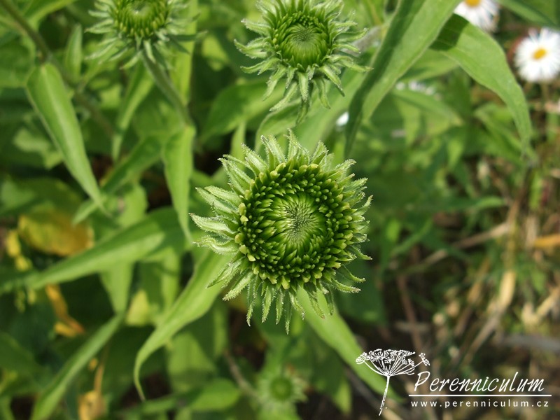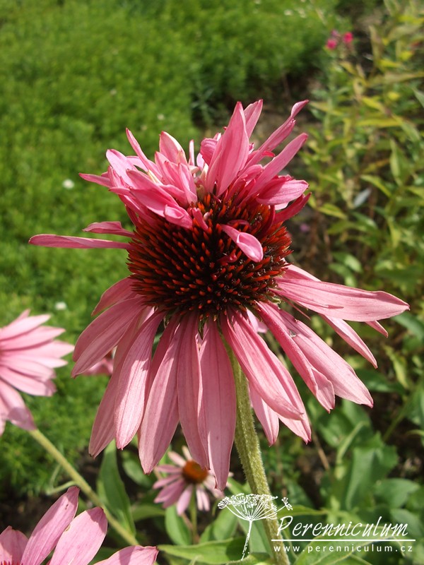 Echinacea purpurea pochází z východu USA, kde běžně roste v prériích a suchých světlých lesích. Statné trsy se pomalu rozrůstají díky krátkým výběžkům. Vzpřímené, tuhé, nevětvené stonky dosahují v přírodě až 120 cm výšky a každý nese jedno v průměru až 12 cm široké květenství. Terč je homolovitý, oranžovohnědý, jemně pichlavý, obklopený růžovým paprskem. Kvete od konce července do září, někdy až října. Bazální listy jsou oválné s dlouhou špičkou, široké, drsně chlupaté, ostře zubaté a dlouze řapíkaté. Lodyžní listy jsou užší a menší.