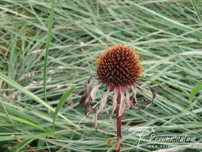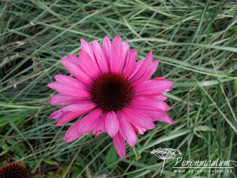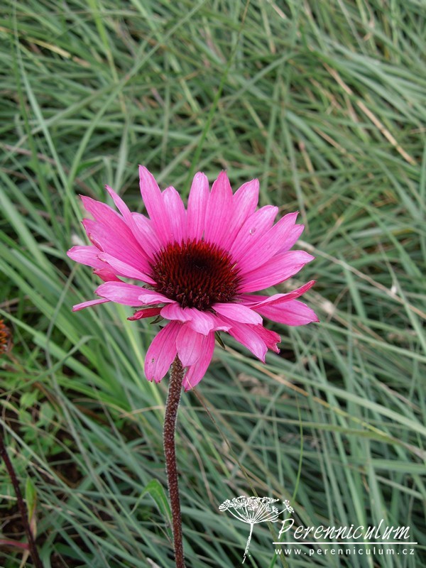 Echinacea purpurea pochází z východu USA, kde běžně roste v prériích a suchých světlých lesích. Statné trsy se pomalu rozrůstají díky krátkým výběžkům. Vzpřímené, tuhé, nevětvené stonky dosahují v přírodě až 120 cm výšky a každý nese jedno v průměru až 12 cm široké květenství. Terč je homolovitý, oranžovohnědý, jemně pichlavý, obklopený růžovým paprskem. Kvete od konce července do září, někdy až října. Bazální listy jsou oválné s dlouhou špičkou, široké, drsně chlupaté, ostře zubaté a dlouze řapíkaté. Lodyžní listy jsou užší a menší.