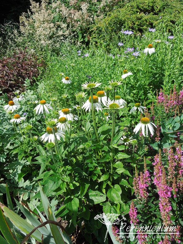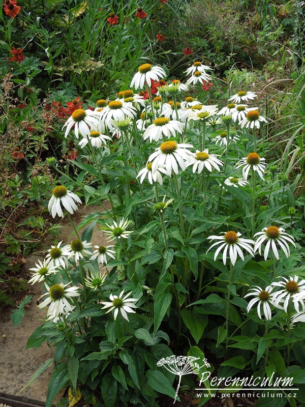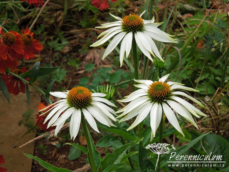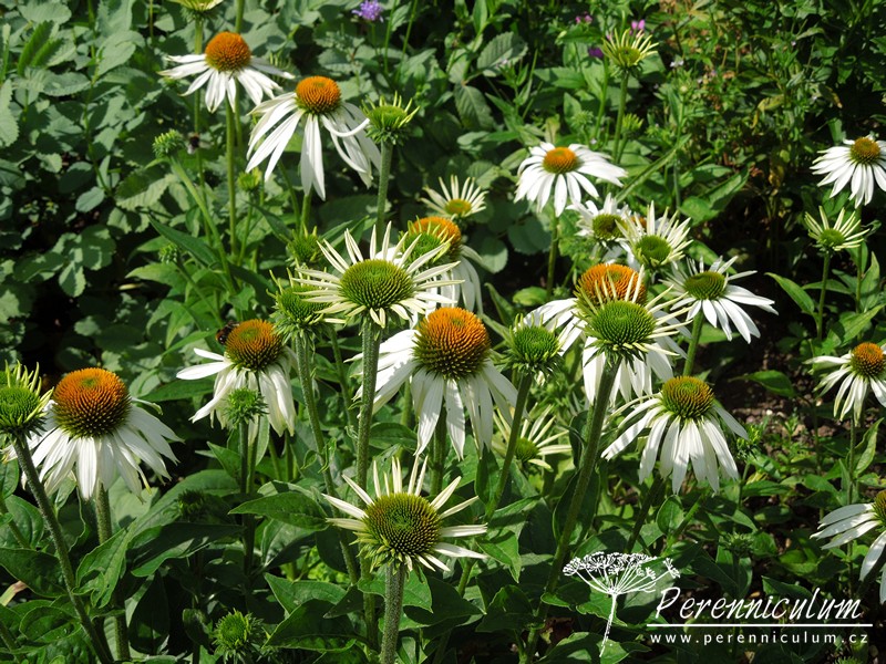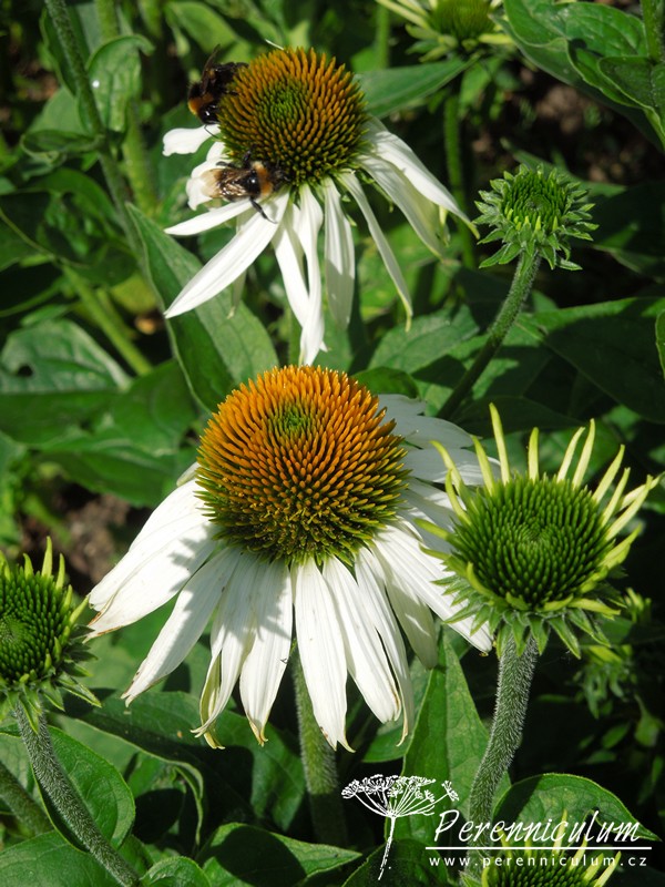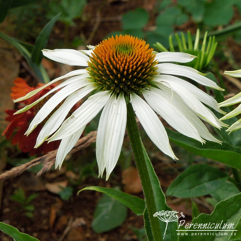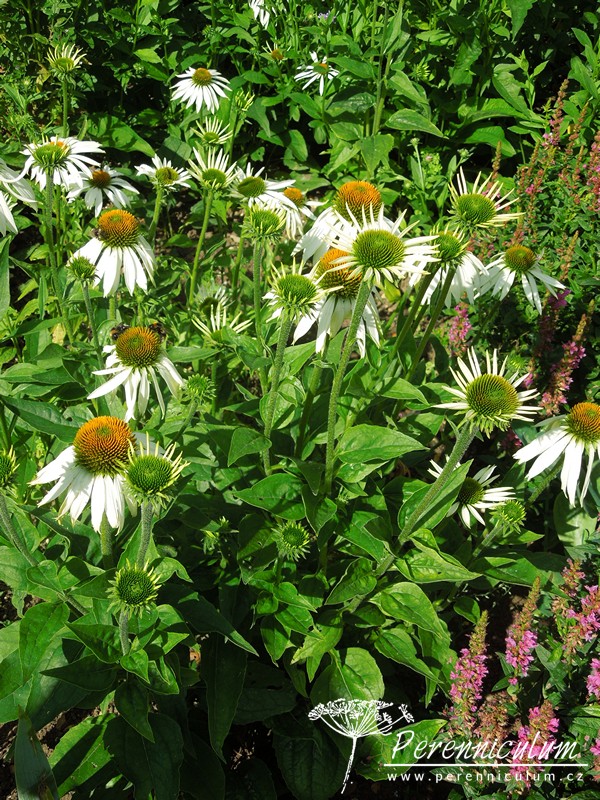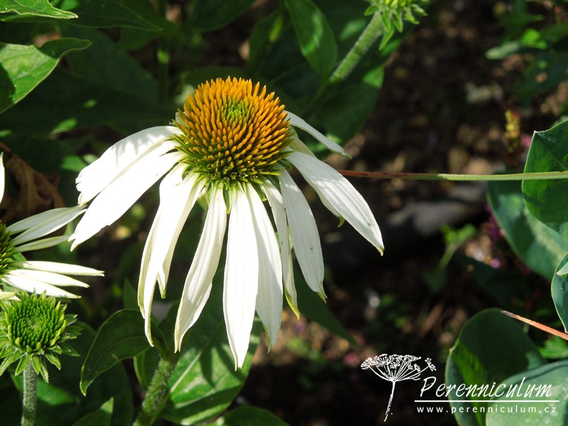 'White Swan' je nízký kultivar dosahující výšky okolo 70 cm. Kvete slonovinově bílými květenstvími s hnědooranžovými středy. Květy paprsku jsou mírně svěšené (ohýbají se zpět ke stonku, nedrží horizontálně).