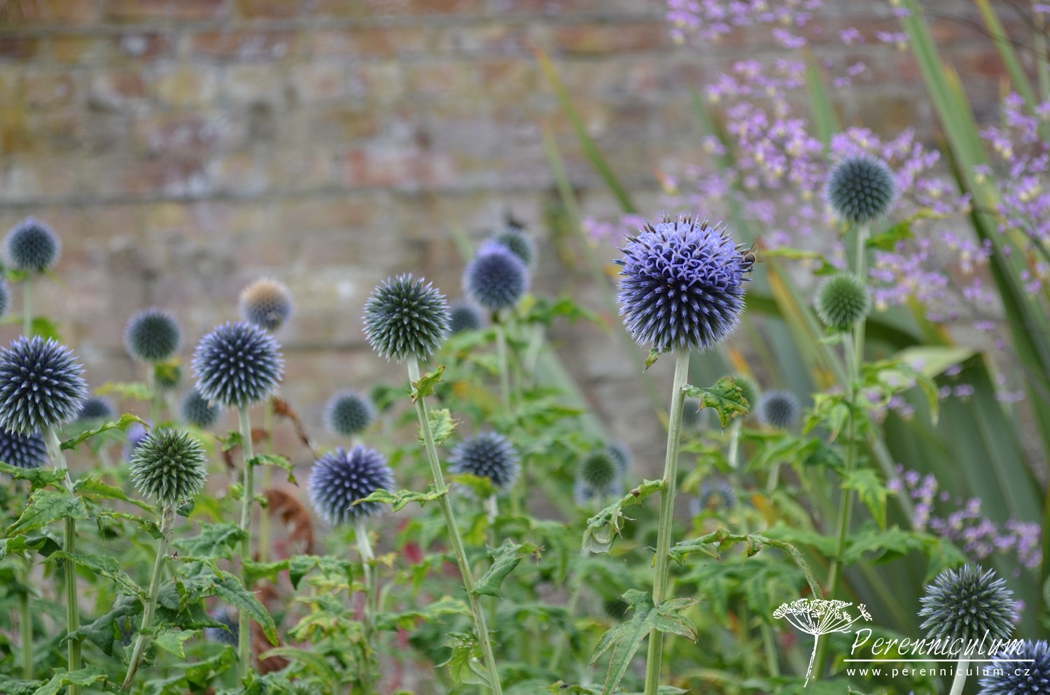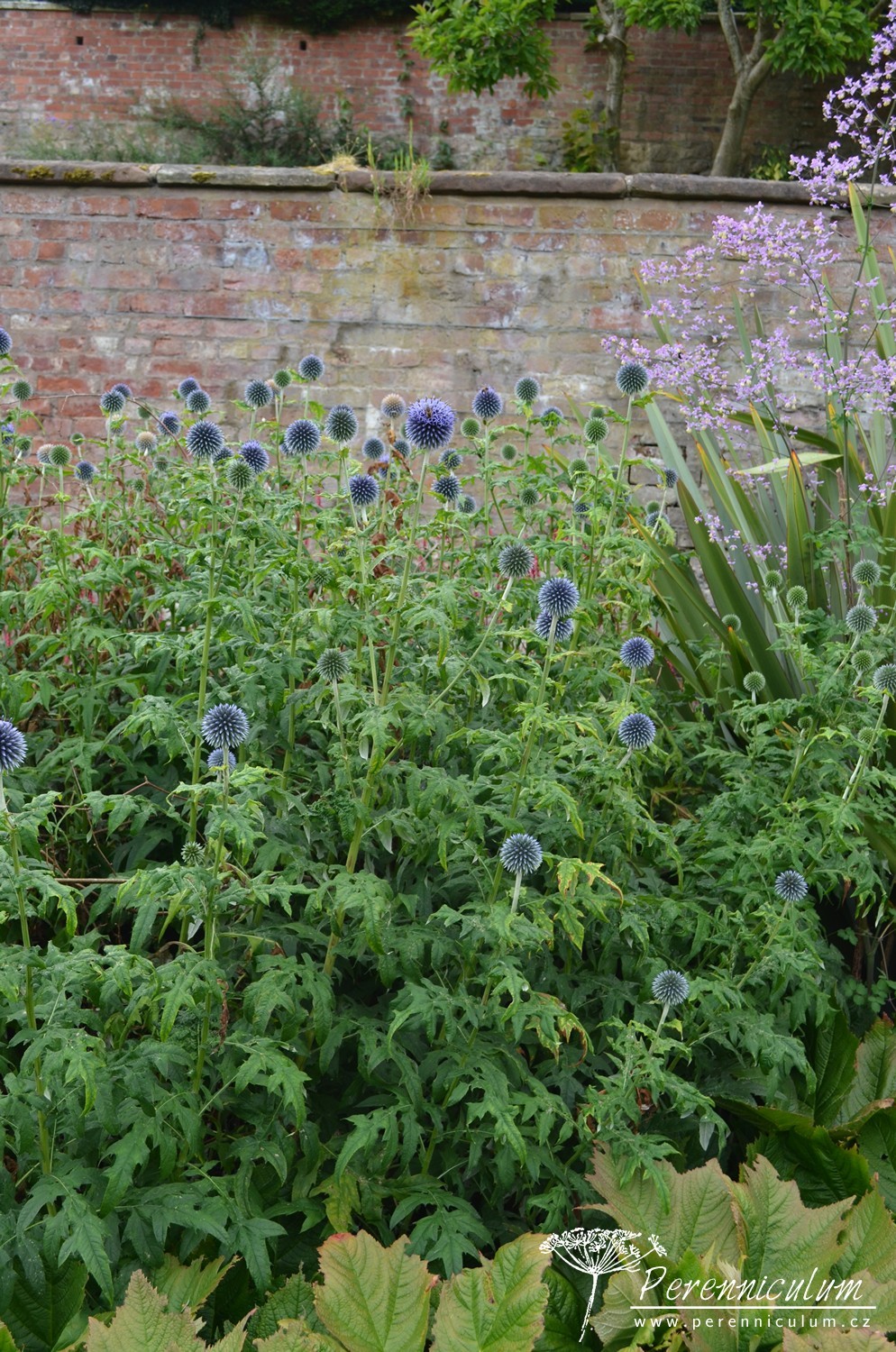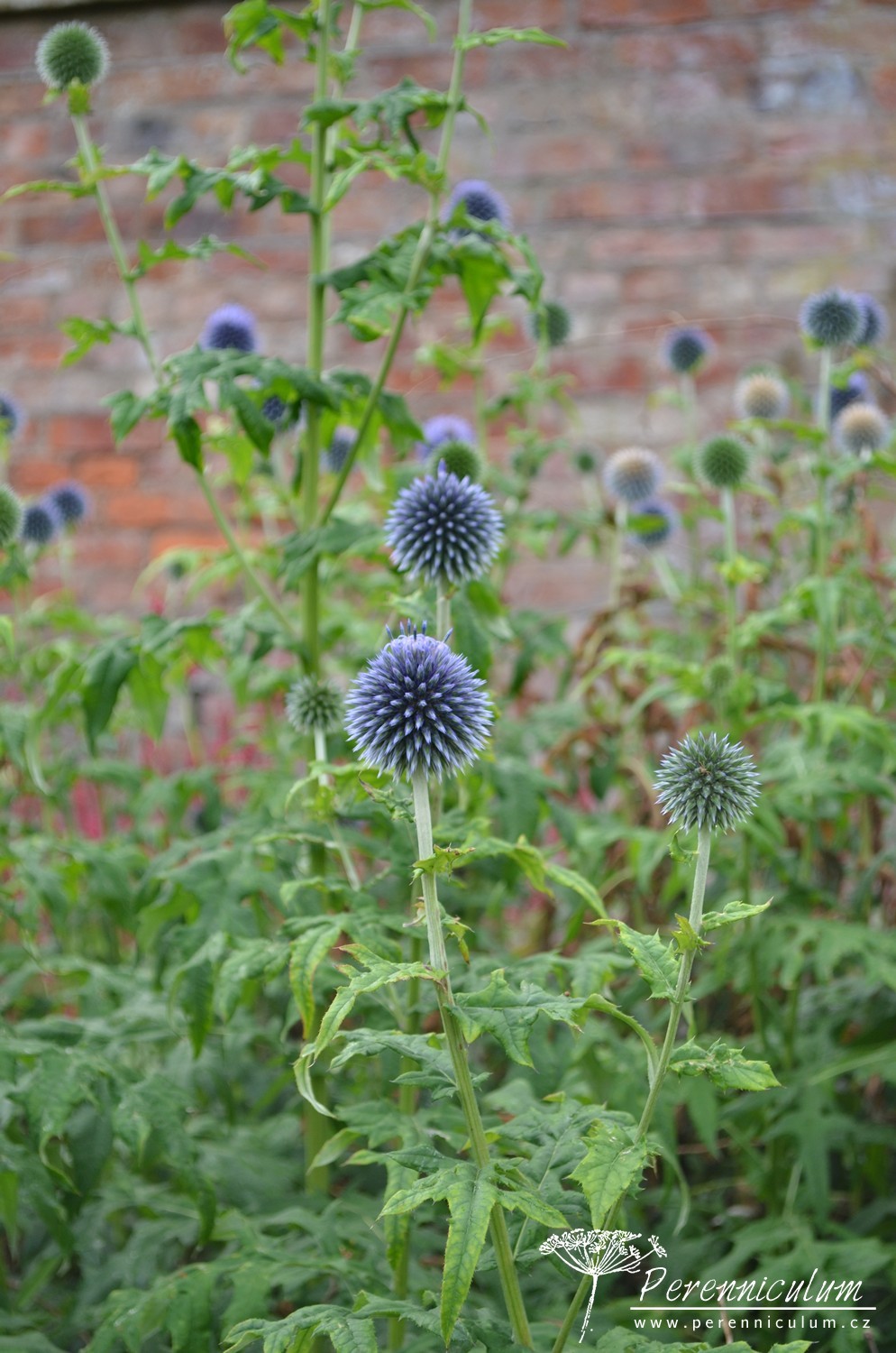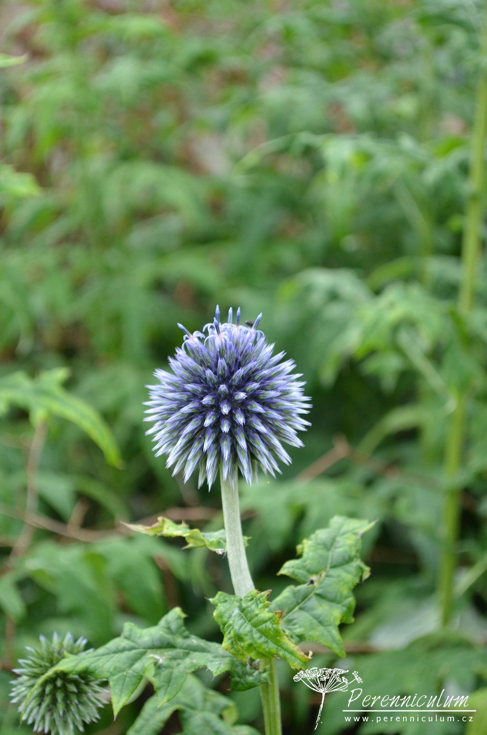 Robustní trvalka dorůstá až 1,5 metrové výšky. Stonky jsou tlusté, lehce šedě ochlupené a koncem sezóny dřevnatí. Listy jsou na svrchní straně šedo- až sivozelené, na spodní straně pak světle šedé až bílé, chlupaté. Peřenosečné listy vyrůstají na krátkém řapíku a jejich okraje jsou špičatě zubaté a obrvené. Na rozvětvených stoncích vykvétají od července velká (2,5 - 5 cm), kulatá, šedomodrá květenství. Remontuje ještě na konci srpna a v září. Usychající plodenství jsou na podzim a brzy v zimě dekorativní, brzy se však rozpadají, nevydrží do jara.