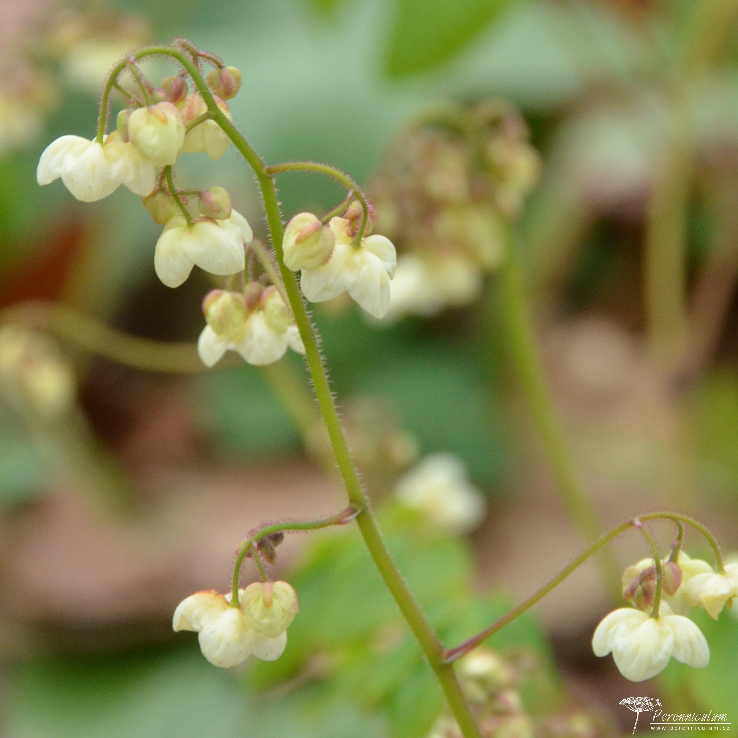 Epimedium pubigerum vytváří poměrně kompaktní bochánky, které se rozšiřují krátkými oddenky. List je složený většinou z 5 nebo 9 oválných až kulatých lístků, které jsou řídce zubaté po okraji, zpočátku světle zelné, později tmavnou a mají lesklý kožovitý povrch, přičemž si stále zachovávají chloupkatý rub. V mírných klimatech jsou stálezelené, v klimatech s tuhými zimami často na podzim zbarví do bronzova a postupně během zimy degradují. Proto je dobré staré listy na konci zimy ostříhat. Nové listy raší světle zelené s purpurovým nádechem. Květní lodyhy nesou 1 list a řídký hrozen zhruba 30 květů vysoko nad shlukem listů. Je jedním z nejvyšších škornic, květenství dosahuje až 65 cm. Květy jsou malé, cca 1 cm v průměru. Květ má krémově bílé vnější okvětní plátky a zářivě žluté, zakrnělé a téměř schované vnitřní plátky. Kvete v dubnu až květnu.