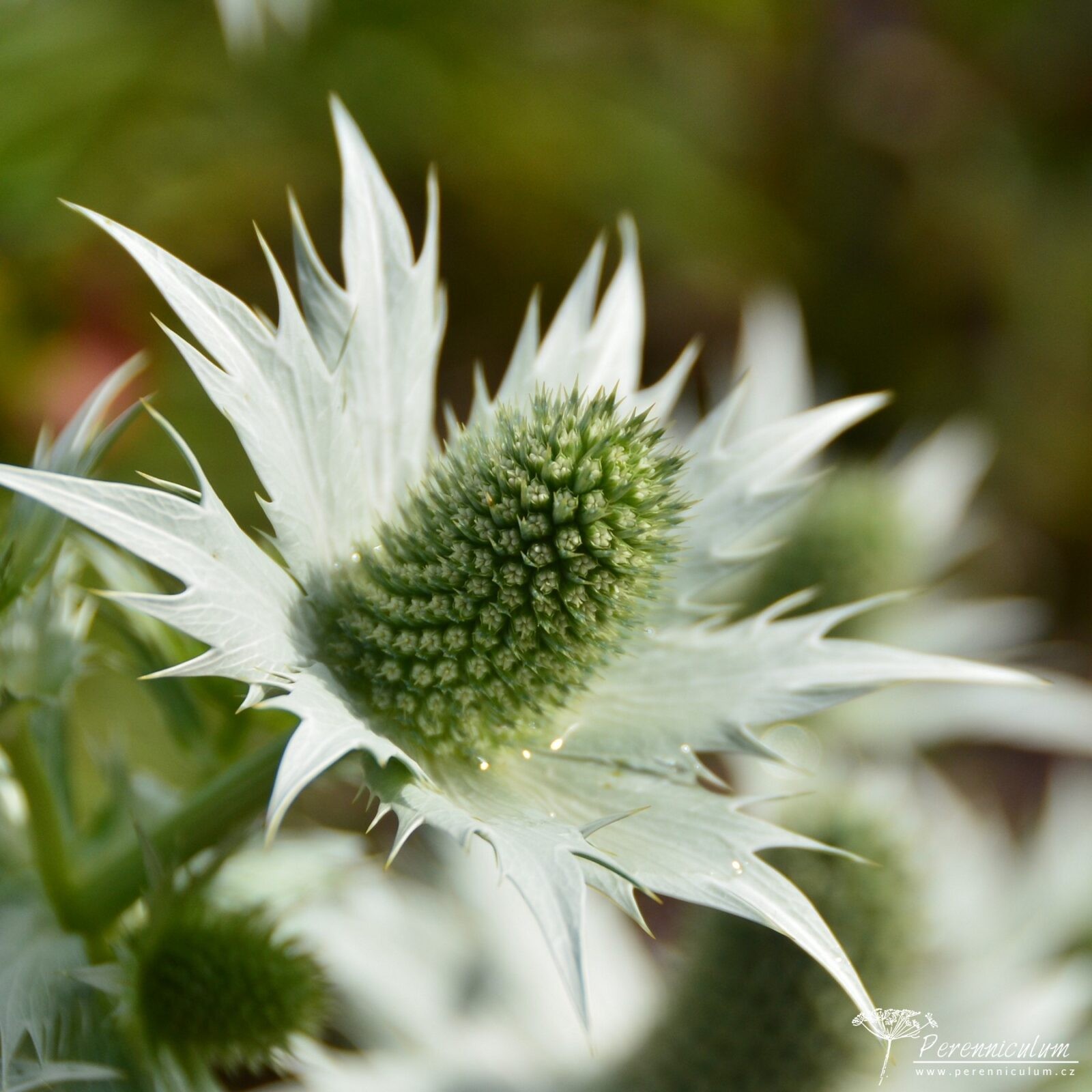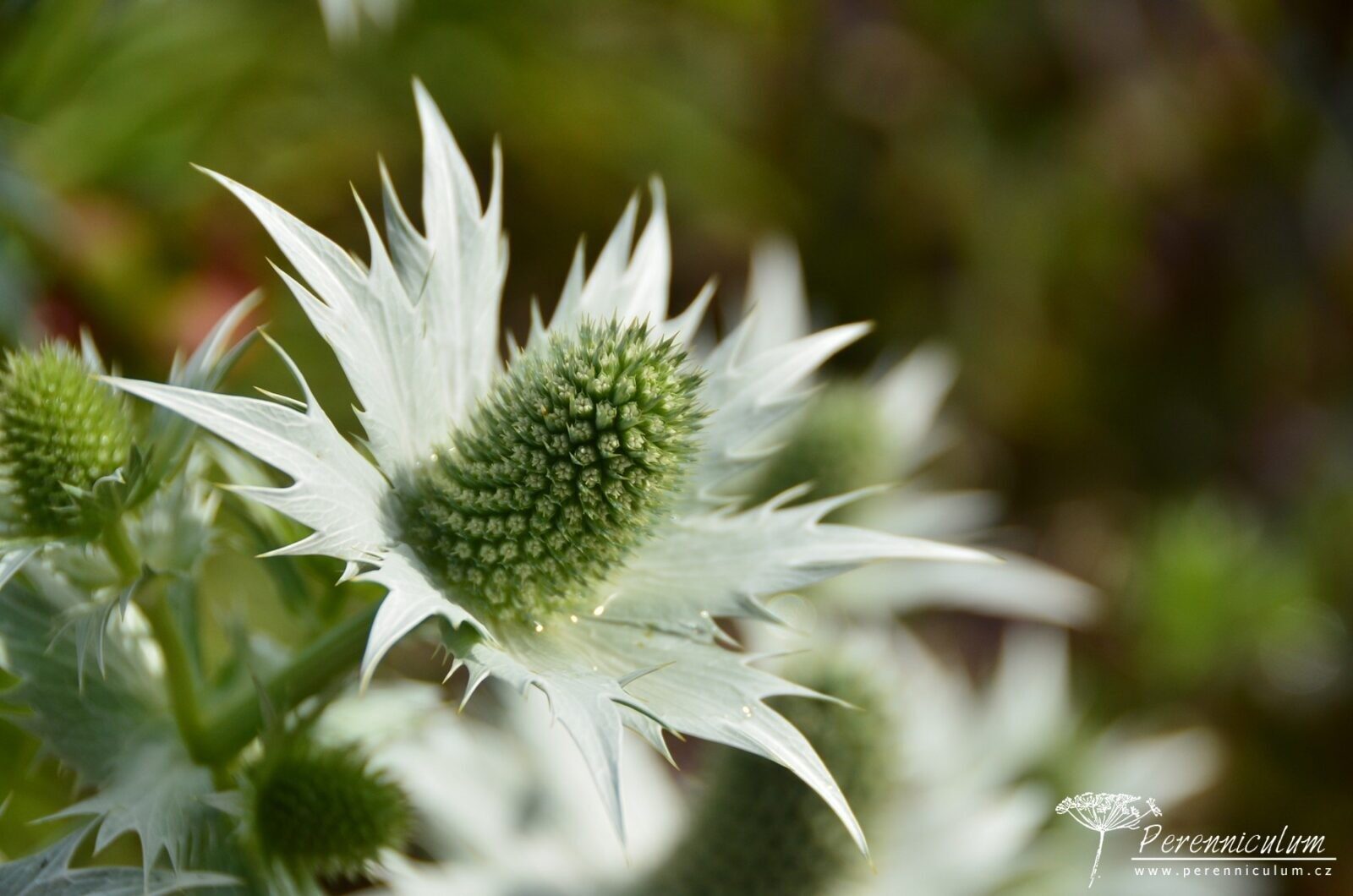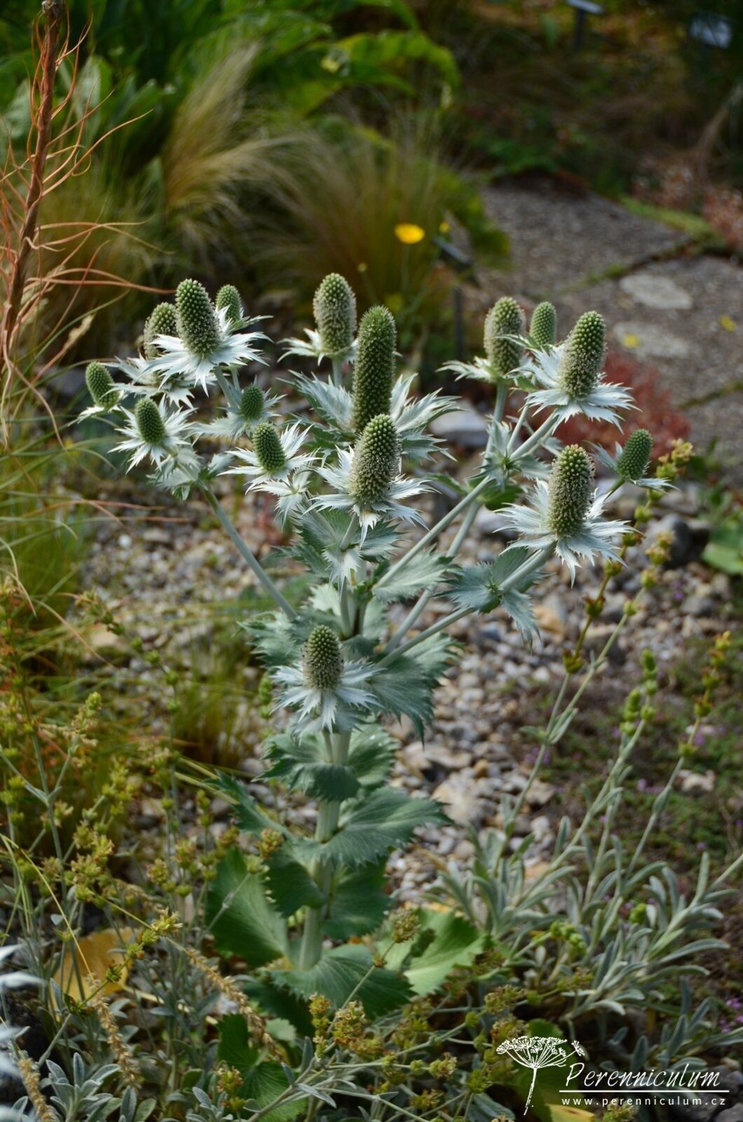 Eryngium giganteum je robustní dvouletka nebo krátkověká trvalka, která vytváří přízemní růžici ostnitých, bodlákovitých listů. Na olistěných stříbrných stoncích nese homolovitá květenství malých modrých kvítků, které jsou zvýrazněny stříbřitě šedými zákrovy. Dekorativní listy, listeny a plodenství zůstávají pěkné i přes zimu, při ponechání šišticovitých plodenství se Eryngium giganteum velice aktivně přesévá a vydrží tak v záhonu mnoho let.