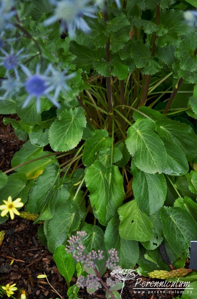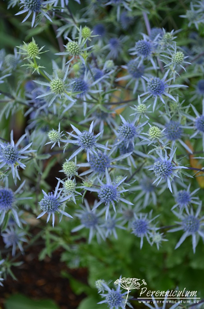 Poměrně variabilní druh vytváří masivní dlouhý kořen ukotvující přízemní růžici až 10 cm velkých, oválných, kožovitých, na bázi srdčitých, zubatých, lesklých, sytě zelených listů. Přímá lodyha dosahuje v zahradách až jednoho metru, v hodní třetině se bohatě větví v sivomodré vrcholičnaté květenství. Jednotlivé hlávky jsou kulovité, stříbrnomodré, malé (cca 1 -2 cm v průměru). Pod hlávkou nápadně trčí sivomodré, čárkovité, ostnité listeny, zákrov.