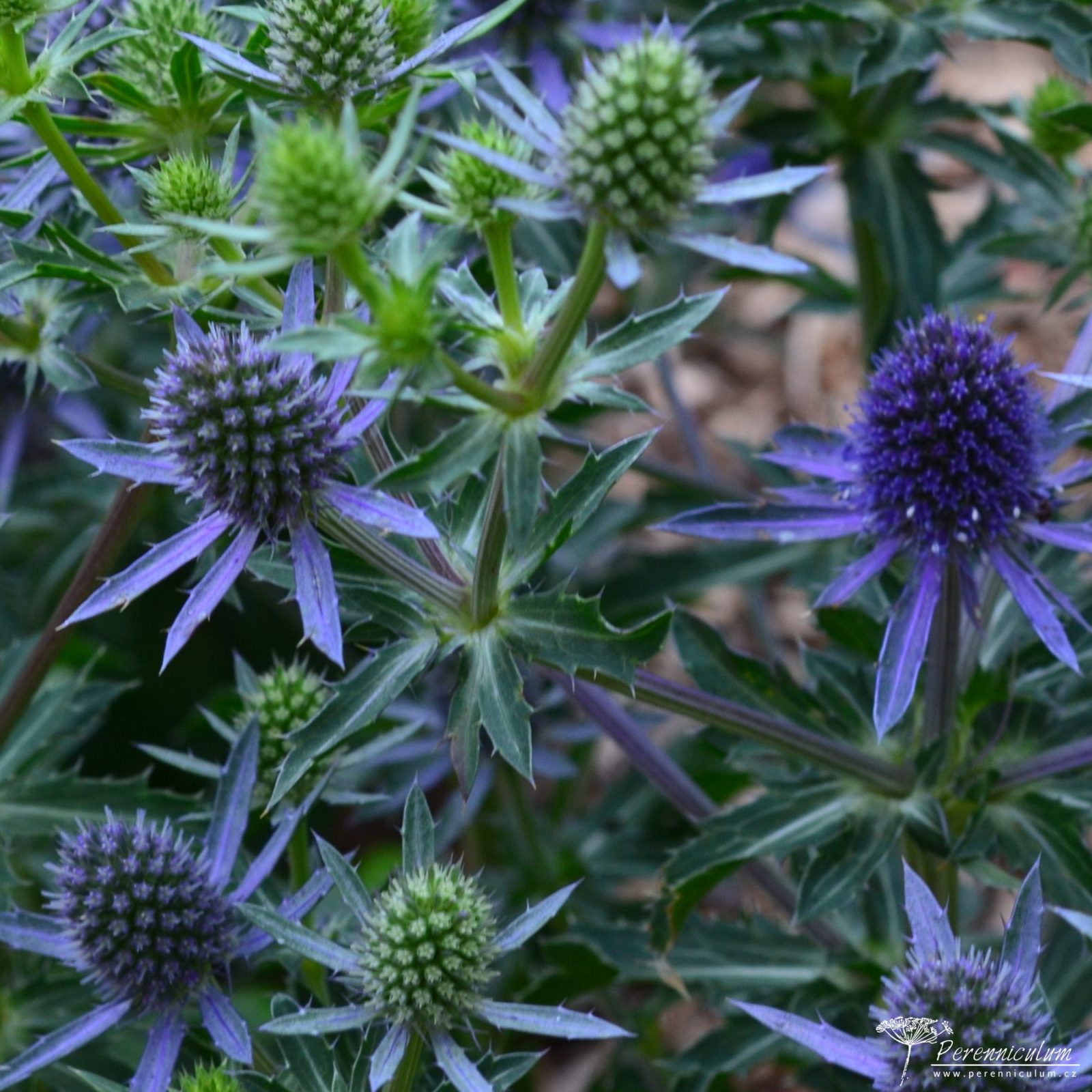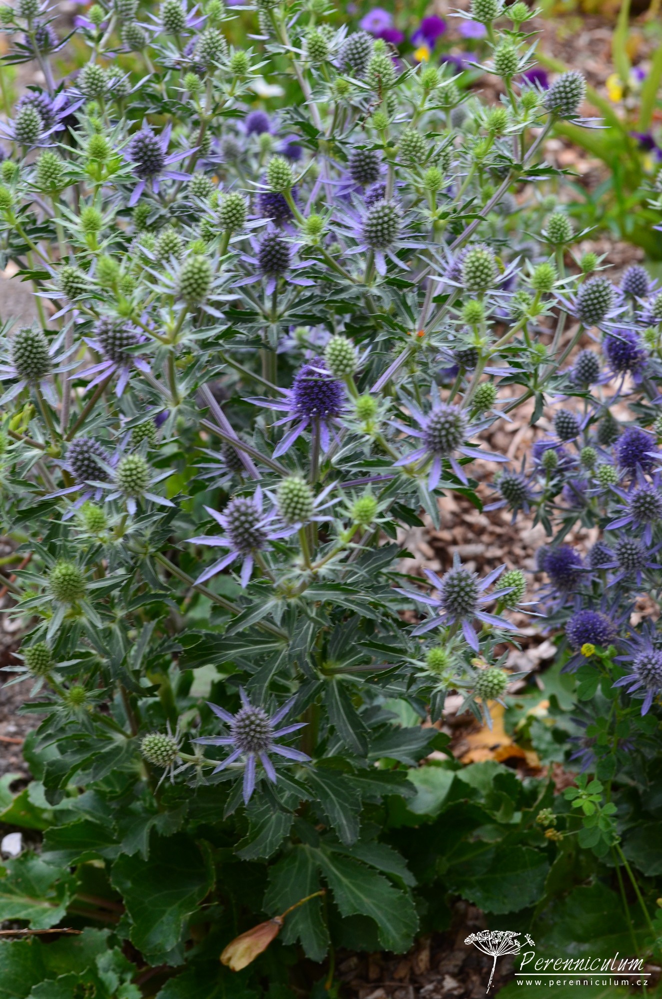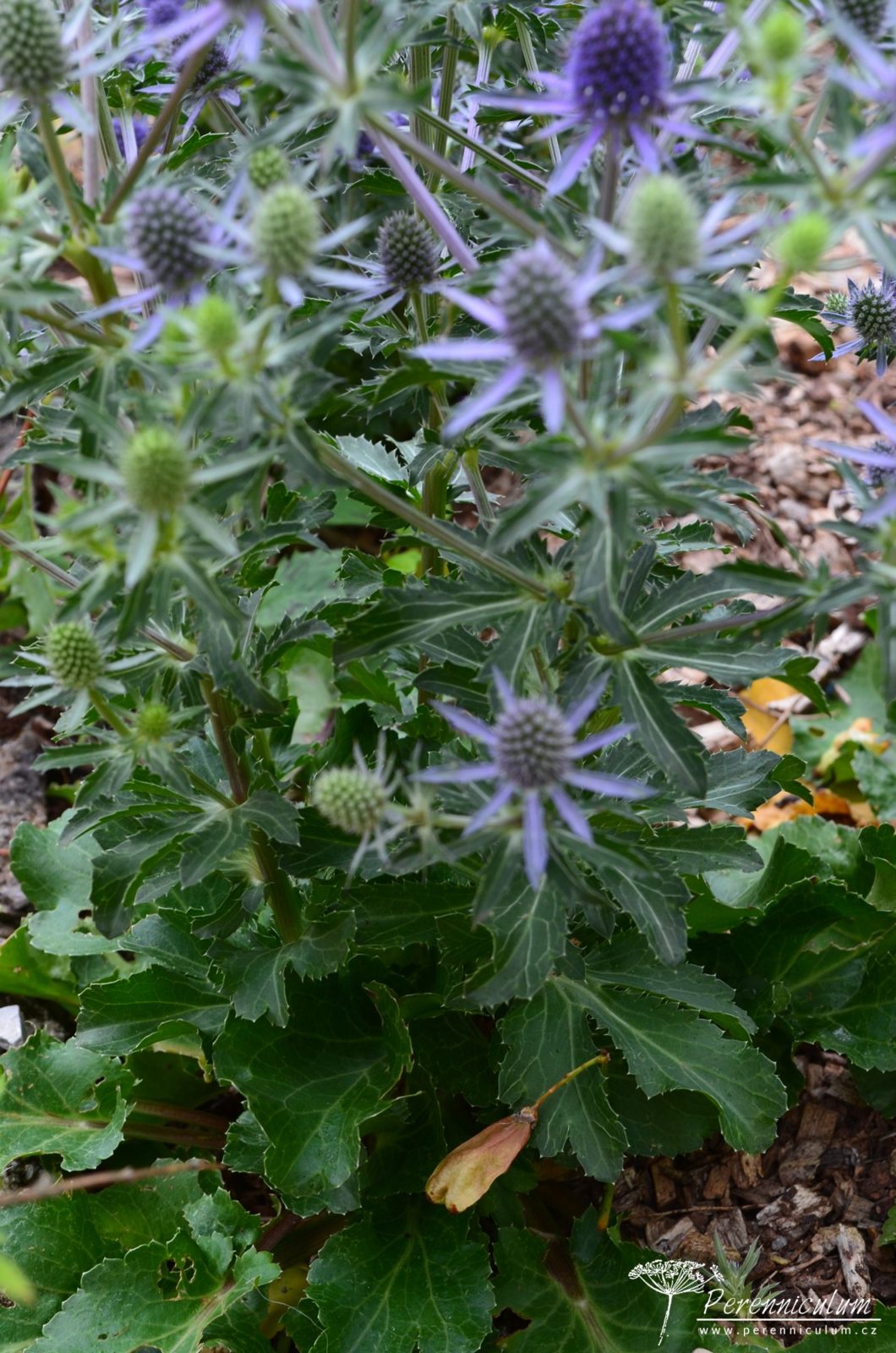 Poměrně variabilní druh vytváří masivní dlouhý kořen ukotvující přízemní růžici až 10 cm velkých, oválných, kožovitých, na bázi srdčitých, zubatých, lesklých, sytě zelených listů. Přímá lodyha dosahuje v zahradách až jednoho metru, v hodní třetině se bohatě větví v sivomodré vrcholičnaté květenství. Jednotlivé hlávky jsou kulovité, stříbrnomodré, malé (cca 1 -2 cm v průměru). Pod hlávkou nápadně trčí sivomodré, čárkovité, ostnité listeny, zákrov.