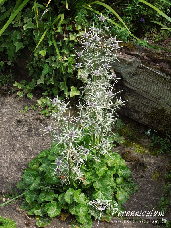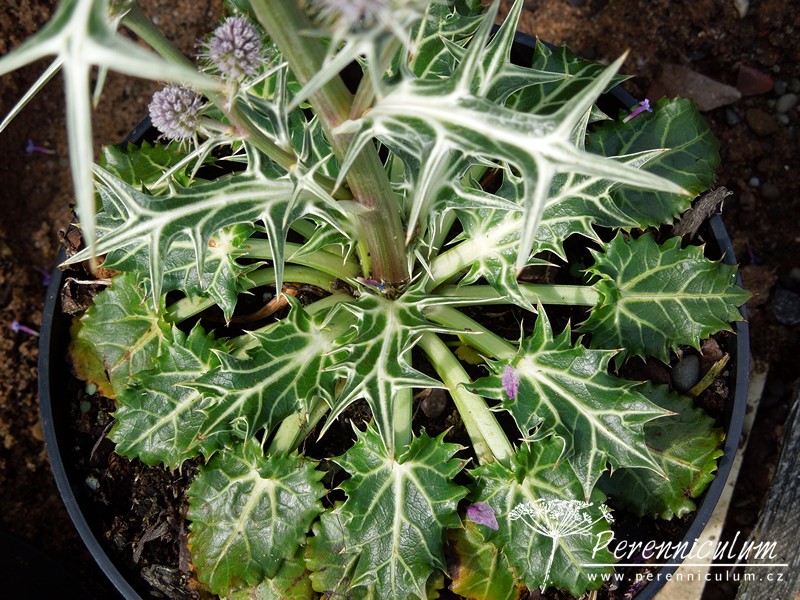 Rostlina tvoří přízemní růžici listů, ze které vyrůstá přímá, v horní části větvená lodyha. Listy jsou kožovité, tmavě zelené se stříbrným až bílým mramorováním podél žilek, oválné až srdčité, asi 5 cm dlouhé, vroubkované. Tuhá lodyha dosahuje výšky až 45 cm a v paždí každé větve je úzký, stříbrný listen s pichlavou terminální a až dvěma laterálními špičkami. Od začátku července se na bohatě větveném stonku objevují malá (2 cm), kulatá až vejcovitá, modrostříbrná květenství se špičatými, stříbrnobílými zákrovy.