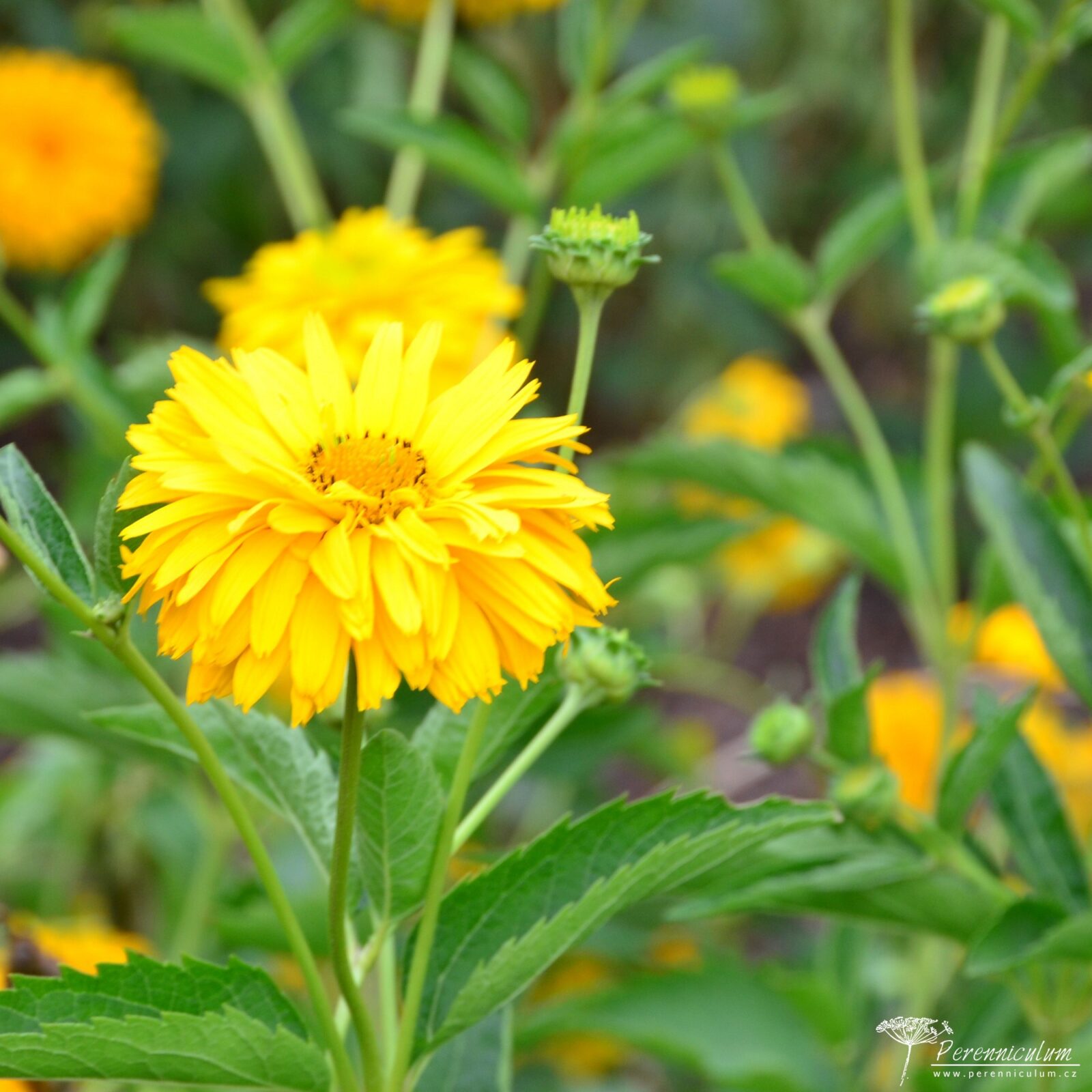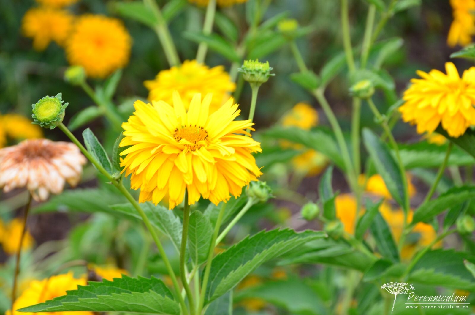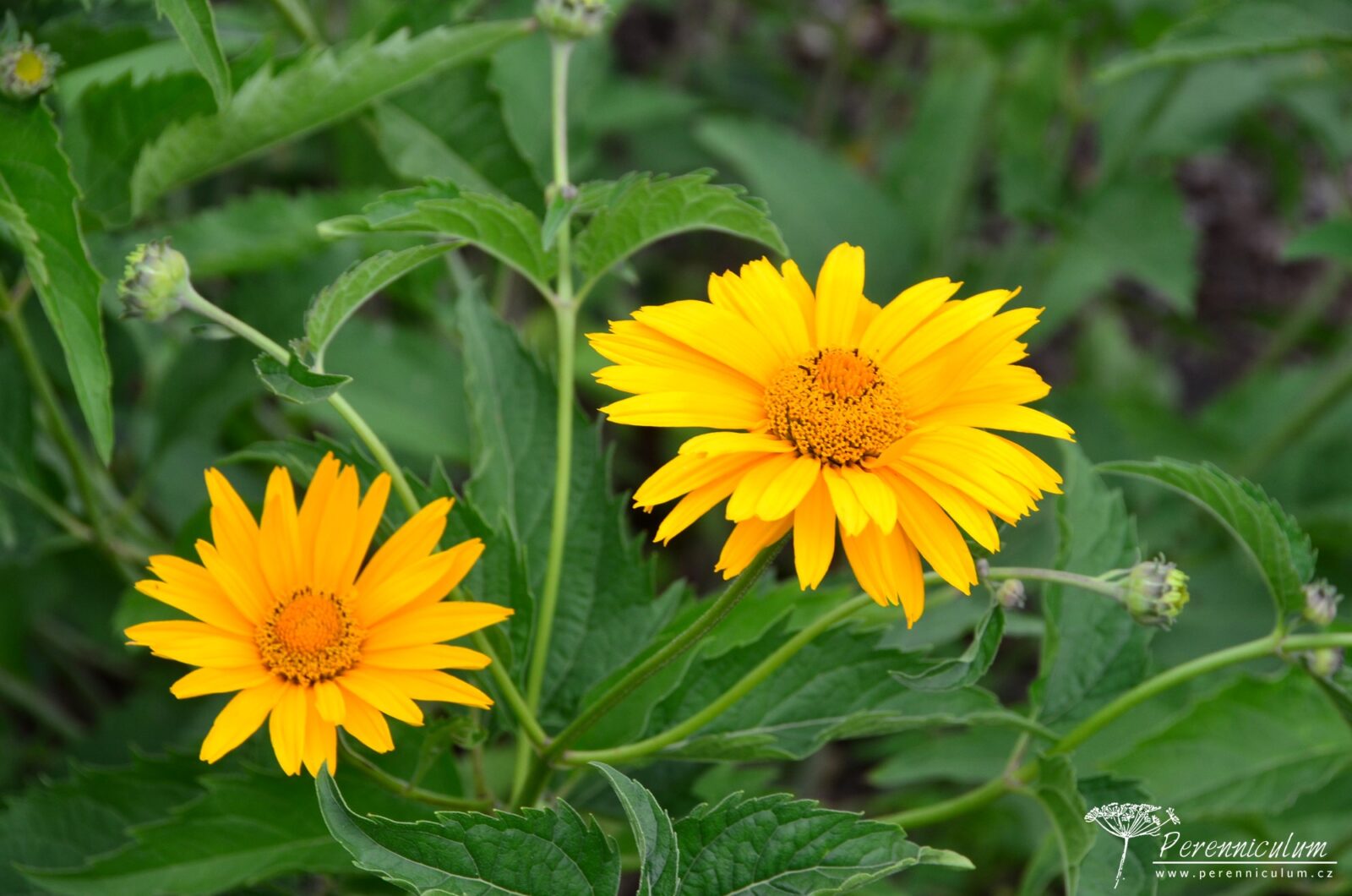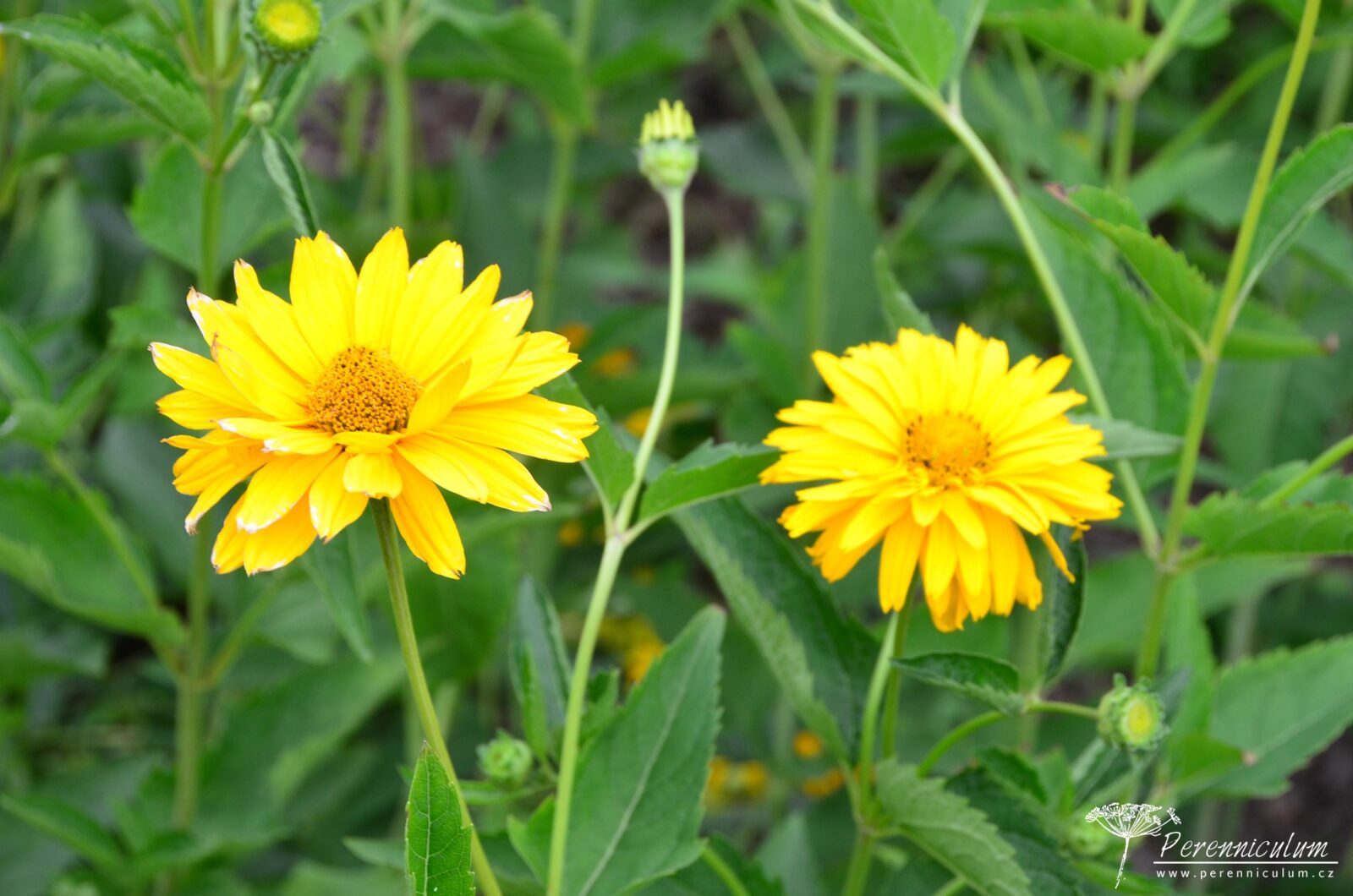 var. scabra se od var. helianthoides, která je v zahradách méně používána, rozezná díky drsně chlupatým stonkům a listům.