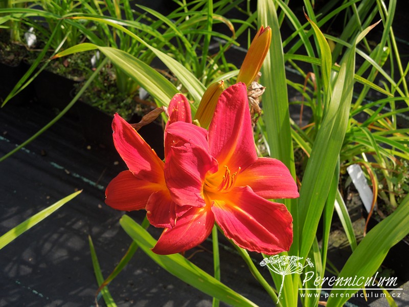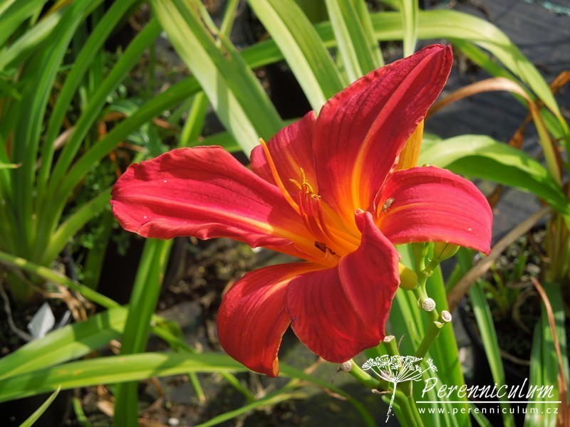 'Buzz Bomb' upoutává svými až 13 cm širokými, zářivě červenooranžovými květy se žlutými jícnem. Nakvétá od začátku července, poměrně dlouhou dobu kvetení prodlužuje pozdní remont. Listy na zimu zatahují. Jedná se o diploidní kultivar vyšlechtěný v roce 1961.