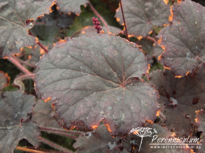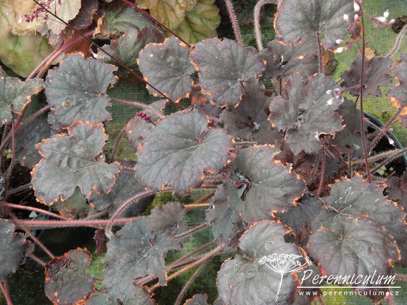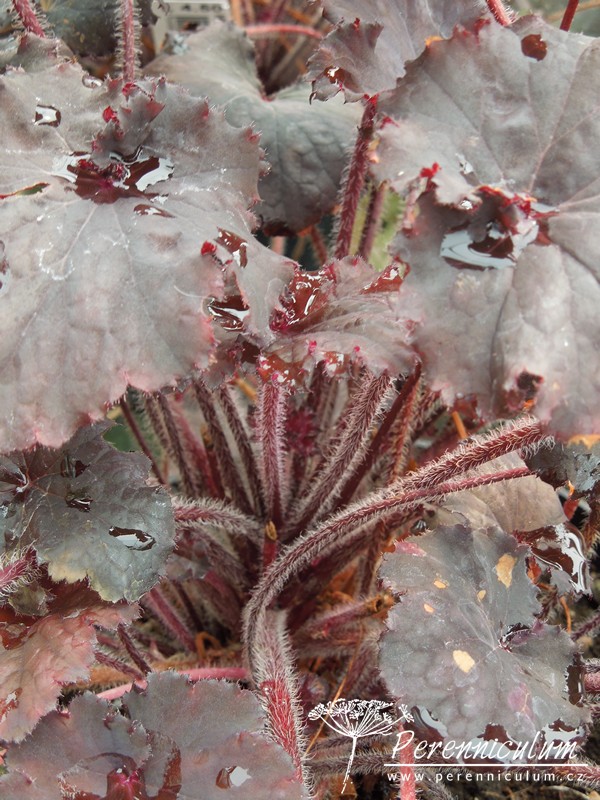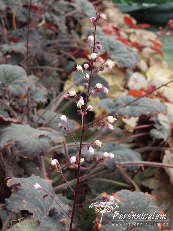 'Binoche' vyniká svými matnými, tmavě purpurovými až černopurpurovými listy. Jejich jemné ochlupení dodává rostlině šedavý povlak a umocňuje matnost. Okraje listů jsou zkadeřené. Na fotografii jsou listy na okrajích popáleny sluncem (rezavé skvrnky). Z růžových poupat vykvétají ve výšce až 40 cm čistě bílé, drobné květy, které efektně kontrastují s tmavými listy. Na trh uvedena v roce 2010 belgickým šlechtitelem Dirkem Scheysem. Některými autory je 'Binoche' uváděn jako hybrid Heuchera villosa.