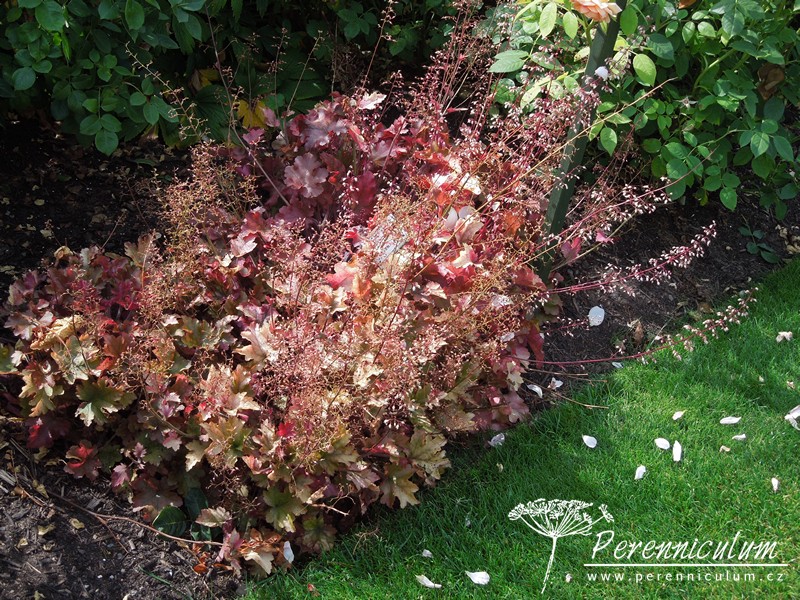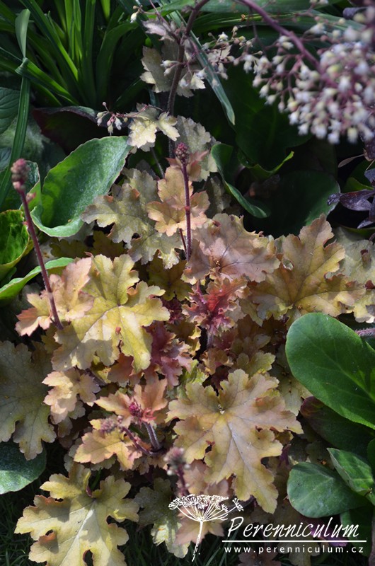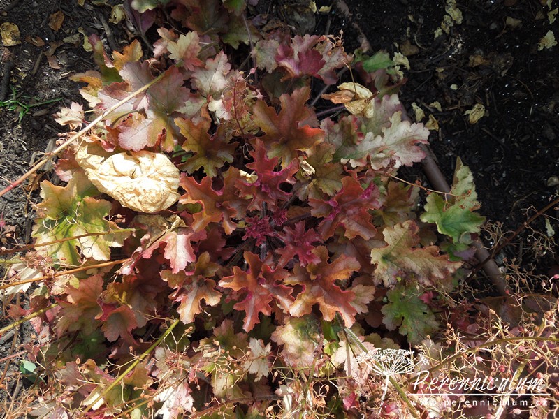 'Marmalade' vytváří široké trsy měřící až 40 cm v průměru, dosahující výšky okolo standardních 20 cm. V květu měří až 40 cm. Je větší a vitálnější než podobný kultivar 'Amber Waves'. Z mladých, červenopurpurových listů se vyvíjí až 8 cm dlouhé, po okrajích zvlněné, bronzově oranžové listy s tmavším, lehce purpurovým rubem. Květy jsou malé, hnědočervené. Pochází z americké dílny Terra Nova Nurseries v Oregonu, jejíž zakladatel Dan Heims stál na počátku šlechtitelského boomu dlužich.