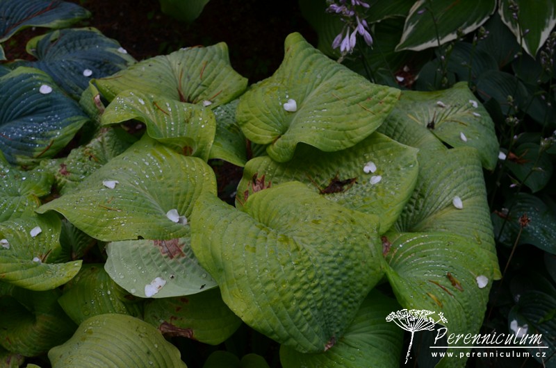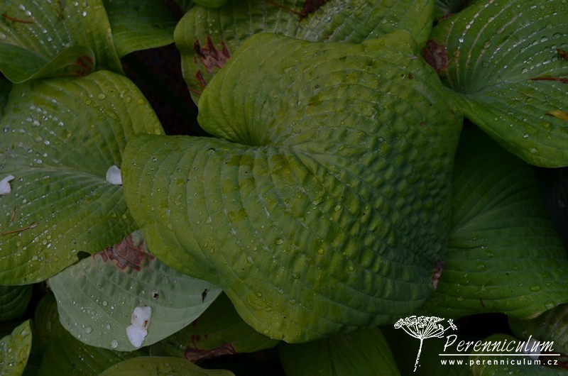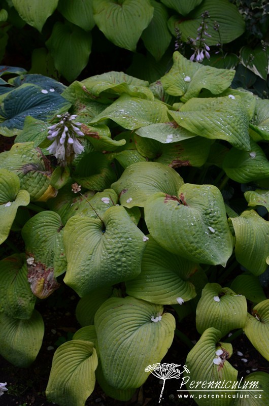 'Golden Sunburst' má velké, tuhé, hluboce rýhované, široce elipčité až kulaté listy, které raší limetkově žlutoželené a během sezóny barví až do zlatožluta. Rub listů je sivozelený až našedlý. Listy často trpí popálením od jarního slunce, což se později projeví nevzhlednými hnědými skvrnami. Světle lila až téměř bílé květy se objevují koncem června jen lehce nad trsem listů.