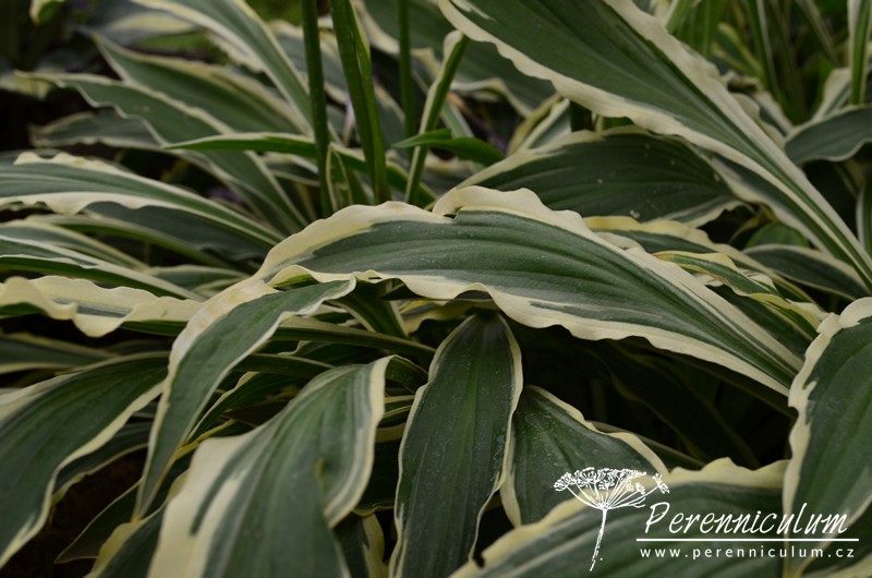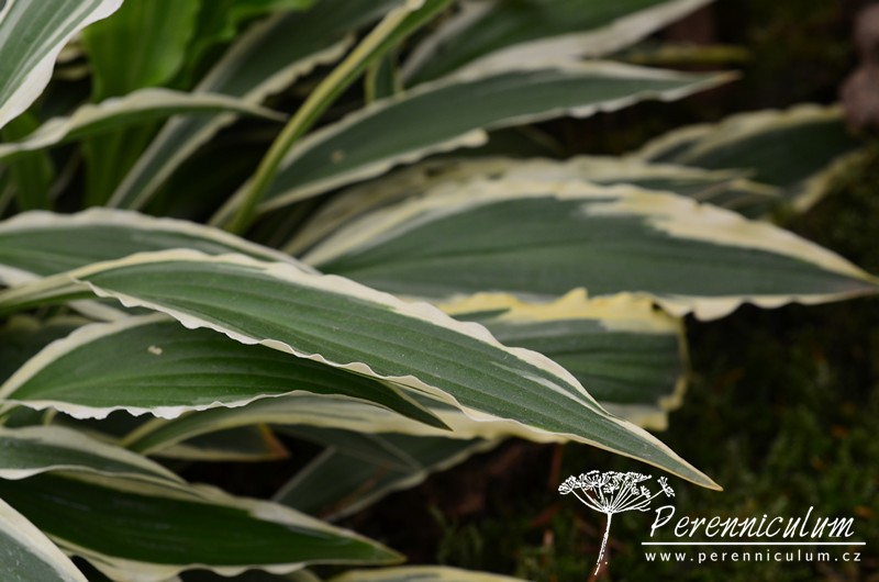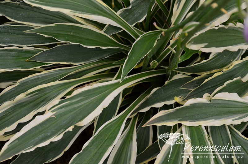'Stiletto' je bujný kultivar, který se ochotně rozrůstá díky svým podzemním výběžkům, a proto se hodí třeba jako obruba záhonů. Nad zemí vytváří okolo 30 cm vysoké, kompaktní trsy velmi úzkých, dlouze protažených tmavě zelených listů se zvlněnými, čistě bílými okraji. Zvonkovité, světle levandulové květy s fialovými proužky a bílými okraji vyrůstají na zhruba 60 cm dlouhých stoncích. Kultivar byl vyšlechtěn známým šlechtitelem bohyšek, Paulem Adenem a na trh se dostal v roce 1987.