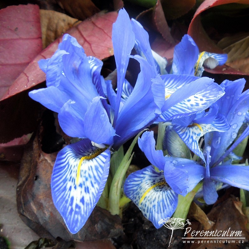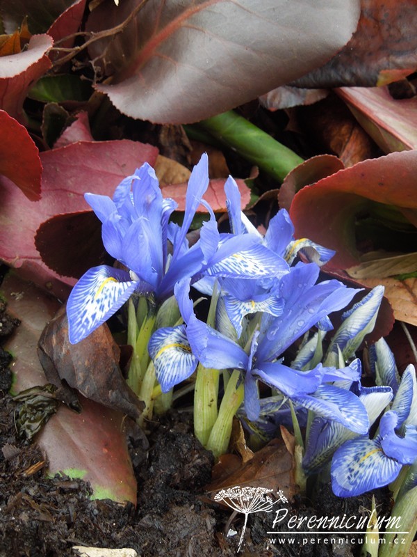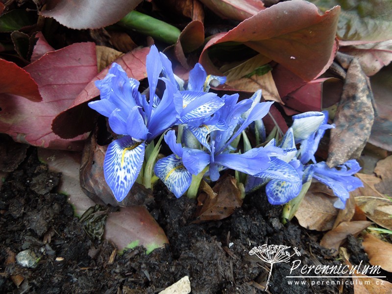 Ze zásobních cibulek vyrůstají na krátkých stoncích, těsně nad zemí světle modré květy bíle kropenaté na vnějších květních plátcích navíc zdobené výrazně zářivě zlatožlutými pruhy. V době květu se teprve prodírají listy skrz půdu, takže osamocené květy naplno vyniknou. Později na jaře listy dorůstají výšky až 40 cm. Iris histrioides kvete velmi brzy zjara, zpravidla už během února či března a také poměrně brzy zatahuje. Cibulky se doporučuje vysadit na podzim (září, říjen), dokud je půda teplá, aby stihly dobře zakořenit.