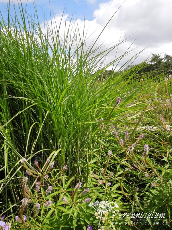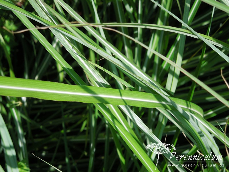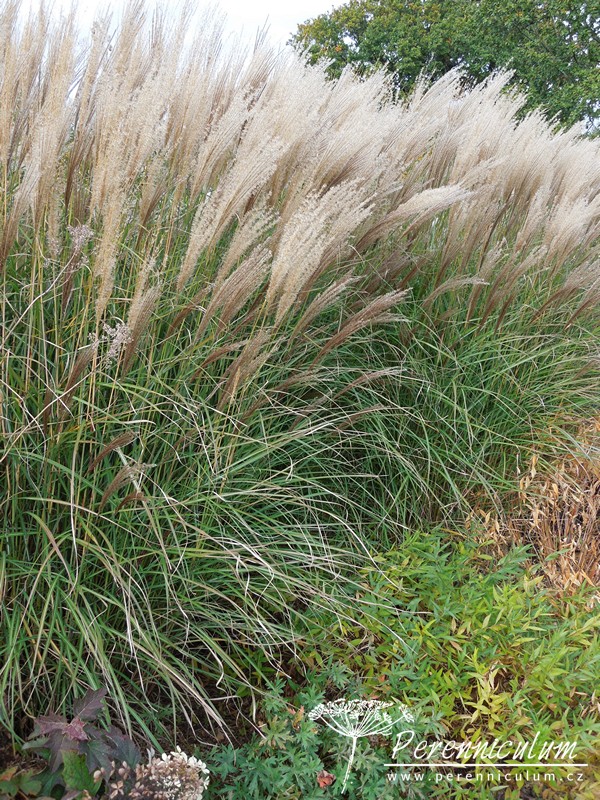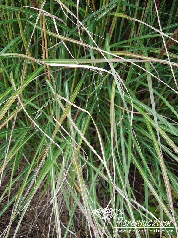 'Malepartus' byl vyšlechtěn známým německým odborníkem Ernstem Pagelsem v roce 1983 a dlouho byl považován za standard při poměřování novodobých kultivarů. Dodnes se tato odrůda hojně používá, ačkoli byla zřejmě překonána novými selekcemi. Vytváří až 2,1 m vysoké trsy poměrně širokých, obloukovitě převisajících, zelených listů s úzkým, bílým středním žebrem. Na podzim se listy barví do oranžovozlaté a později slámové. Vykvétá i v našich končinách koncem srpna vínovohnědými květy, které postupně odkvétají do stříbrnošedé. Trs může působit lehce rozcuchaně (nemá tak strohý habitus) díky některým naklánějícím se stonkům.