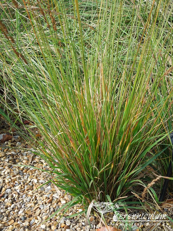 Molinia caerulea vytváří kompaktní trsy úzkých, na zimu odumírajících, zelených listů. Ukotvena je hustým svazkem houževnatých kořenů. Listy se na podzim barví do zlatých až oranžových odstínů. Koncem léta vykvétají na dlouhých, obloukovitě se sklánějících stoncích řídké klasy zelenobéžových kvítků s téměř černými tyčinkami.