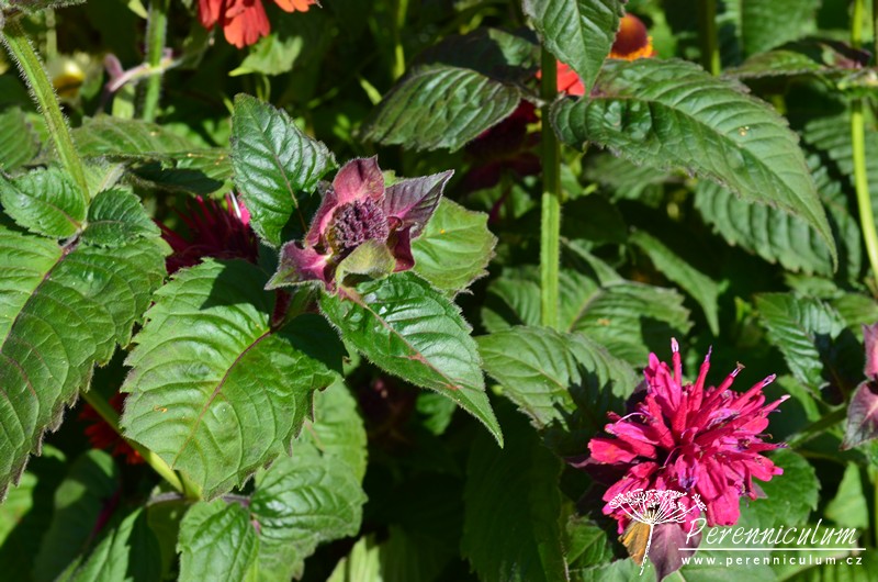 'Fireball' vykvétá tmavými, purpurově červenými květy, které jsou navíc podpořeny purpurovozelenými listeny. Kvete od července do konce léta. Jedná se o kompaktní kultivar dosahující výšky pouze do 60 cm. Výhodou je také vyšší rezistence k padlí než u starších odrůd. Kultivar 'Fireball' byl patentován v roce 2003.