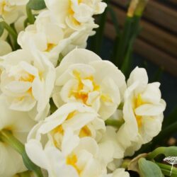 'Cheerfulness' nese většinou 3 až 4 květy na jednom stonku. Květy jsou plné, krémově bílé a vonné. Vnější okvětní plátky jsou zakulacené s mírně zvlněnými okraji a překrývají se víc než z poloviny. Vnitřní okvětní plátky jsou o polovinu kratší, zvlněné, hustě vyrůstající ze středu. Segmenty pakorunky jsou žloutkově žluté, vmezeřené mezi krémově bílé, středové petaly. Kvete později v sezóně narcisů. Dosahuje výšky okolo 40 cm. Kultivar 'Cheerfulness' byl vyšlechtěn v Holandsku a zaregistrován v roce 1923. Výborně se hodí k řezu do vázy, floristé jej milují a překvapivě dobře zplaňuje. Tenké listy nedělají tolik nepořádku, když zatahují.