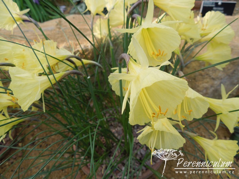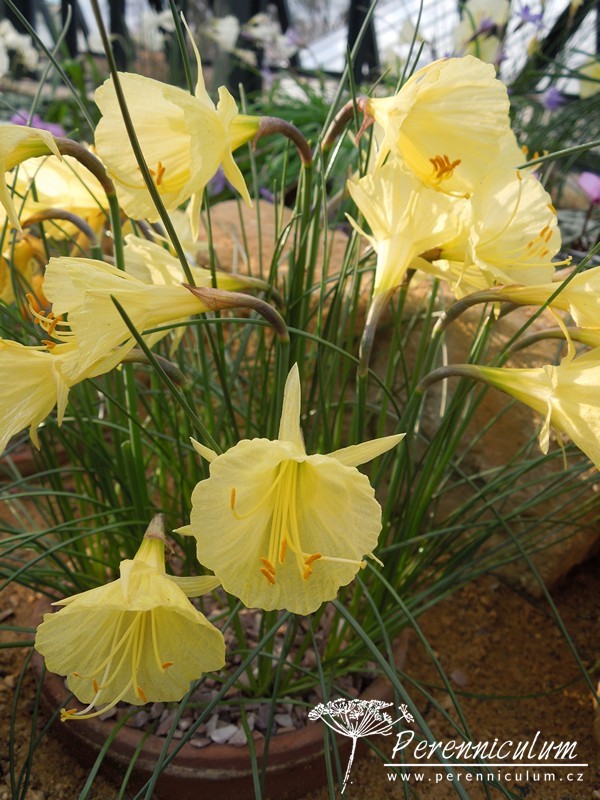 Narcissus romieuxii je podobný Narcissus bulbocodium, ale odlišuje se žlutými tyčinkami vyčnívajícími z květu. Květy mají velmi proměnlivou barvu od krémové přes světle citrónově žlutou až po zářivě žlutou. Květy jsou charakteristické svou velkou, široce otevřenou pakorunkou a úzkými, krátkými korunními plátky. Listy jsou tmavě zelené, velmi úzké až čárkovité.