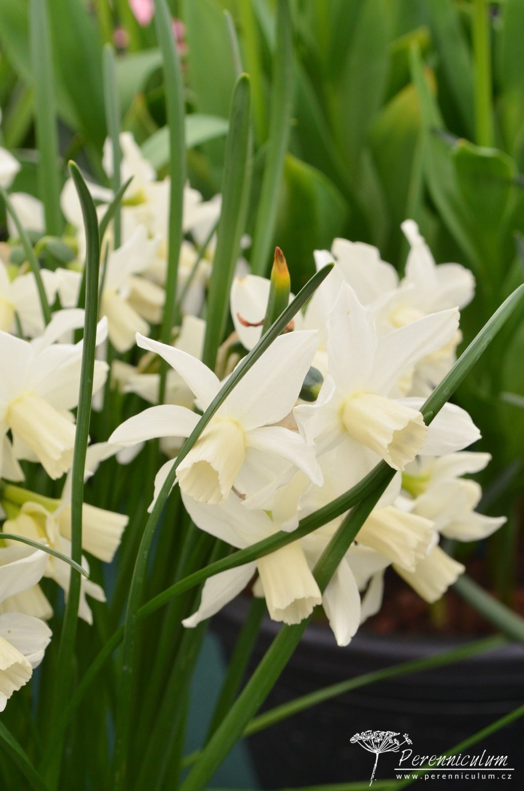 'Toto' je někdy označován jako bílý 'Tête-à-Tête', se kterým má podobné charakteristiky jako 1 až 3 květy na stonku, nízký vzrůst do 20 cm nebo tvar květu (úzce kopinacé okvětní plátky lehce zahnuté nazpět). Okvětní plátky kultivaru 'Toto' jsou však krémově bílé a trubkovitá pakorunka je zprvu světle žlutá, ale velmi rychle světlá do krémově žluté. Květy široké okolo 5 cm vykvétají poměrně brzy a dlouho vydrží ve váze. Rodiči jsou Narcissus jonquilla a kultivar 'Jenny'. Kultivar pochází z USA a na trh byl uveden v roce 1983.