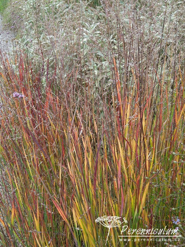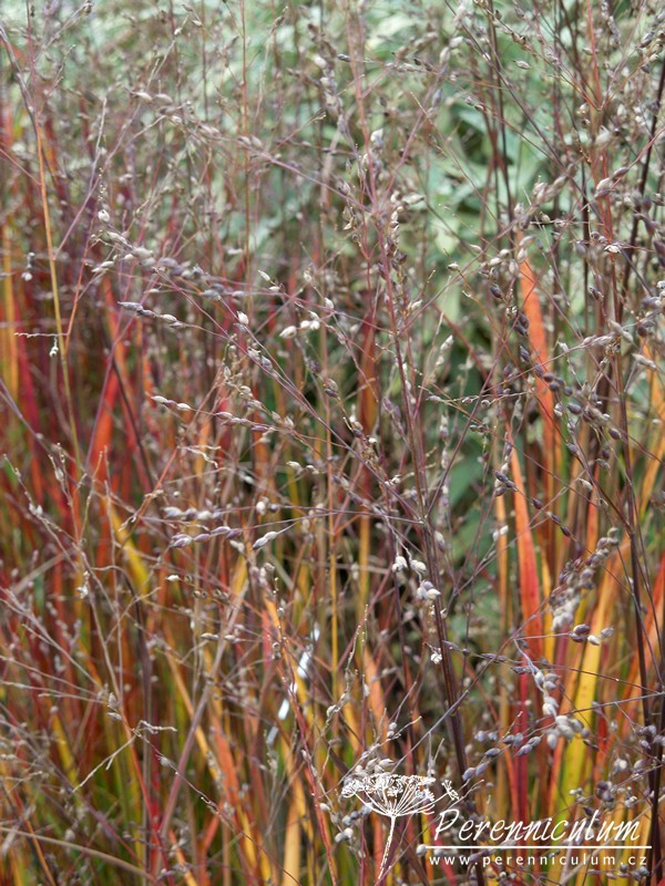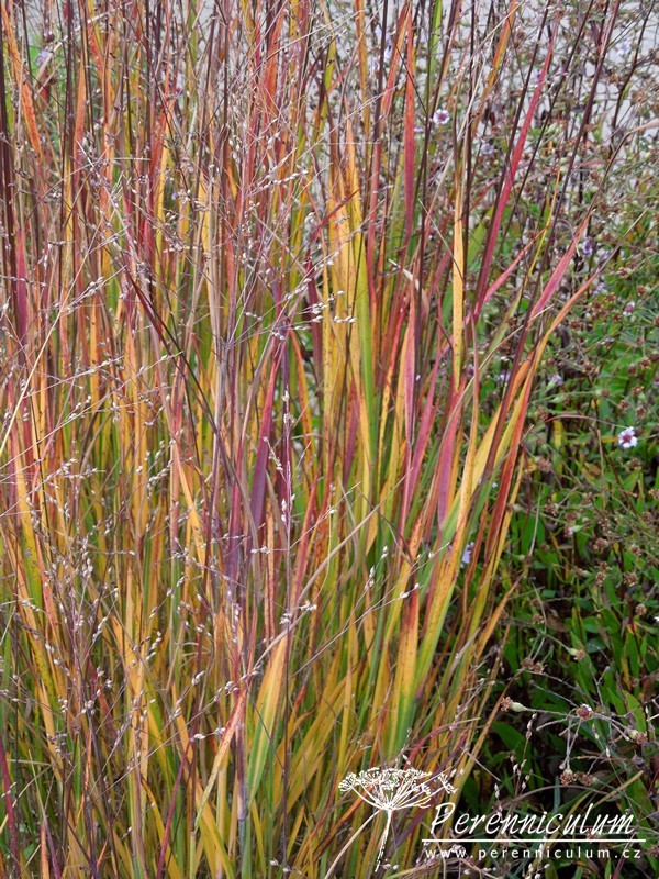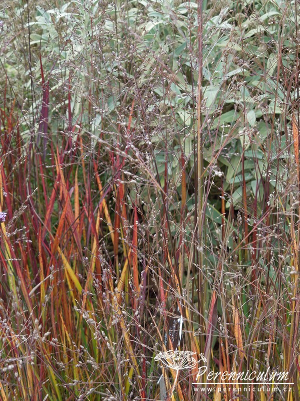 Od konce července se na modrozelených stoncích objevují laty purpurově hnědých kvítků rozkvétajících do bronzově béžové. Rostlina obvykle produkuje velké množství nadýchaných květenství, čímž vytvoří velký průhledný oblak nad trsem listů. U původního druhu se květenství a konce stonků lehce sklání, kultivary jsou však často šlechtěny pro vzpřímený, štíhlý tvar květenství. Špatně kvete v těžkých půdách.