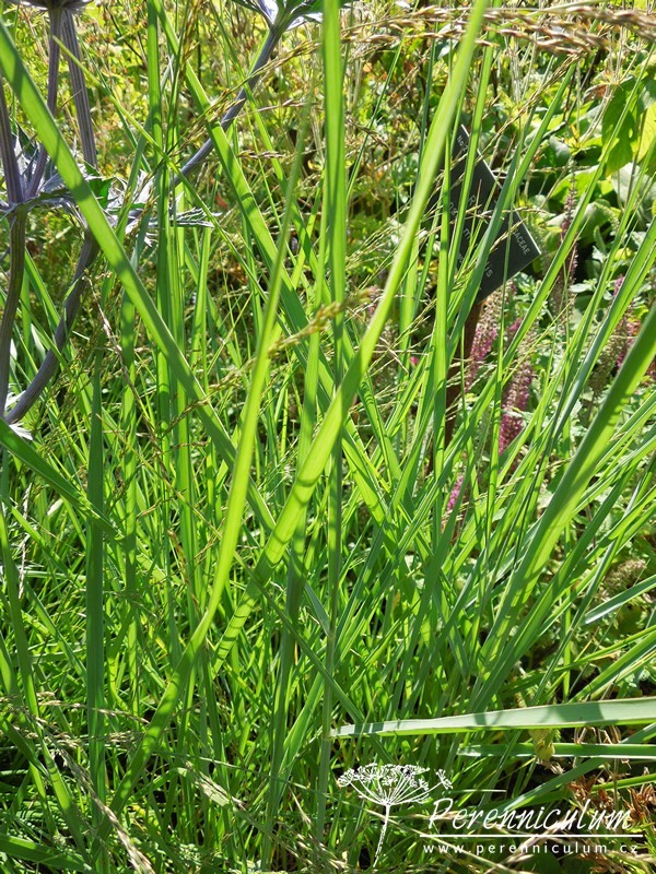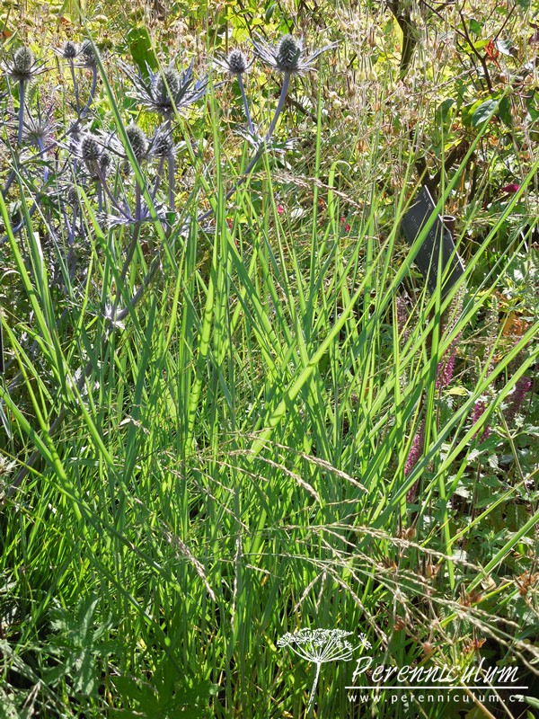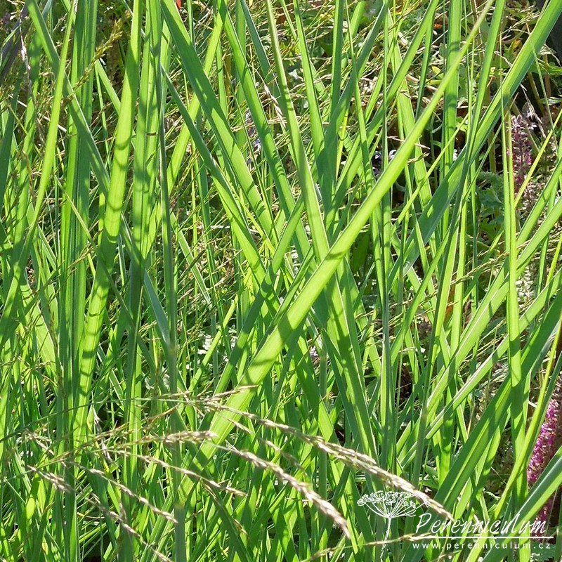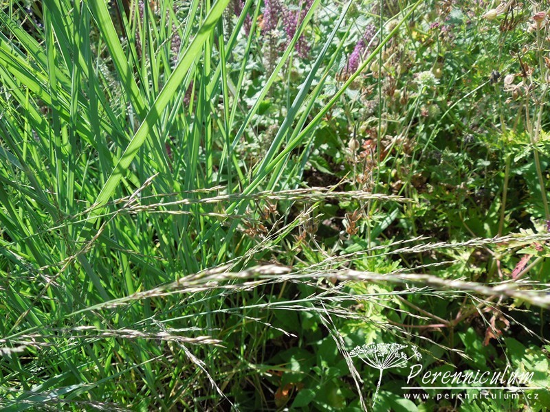 Od konce července se na modrozelených stoncích objevují laty purpurově hnědých kvítků rozkvétajících do bronzově béžové. Rostlina obvykle produkuje velké množství nadýchaných květenství, čímž vytvoří velký průhledný oblak nad trsem listů. U původního druhu se květenství a konce stonků lehce sklání, kultivary jsou však často šlechtěny pro vzpřímený, štíhlý tvar květenství. Špatně kvete v těžkých půdách.