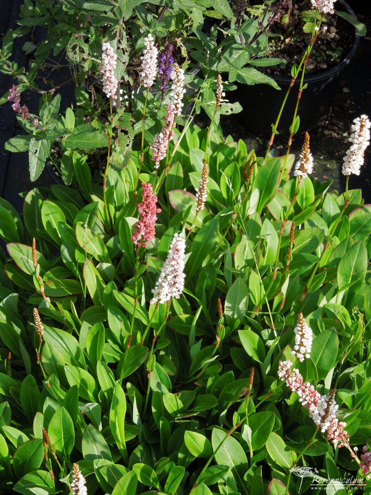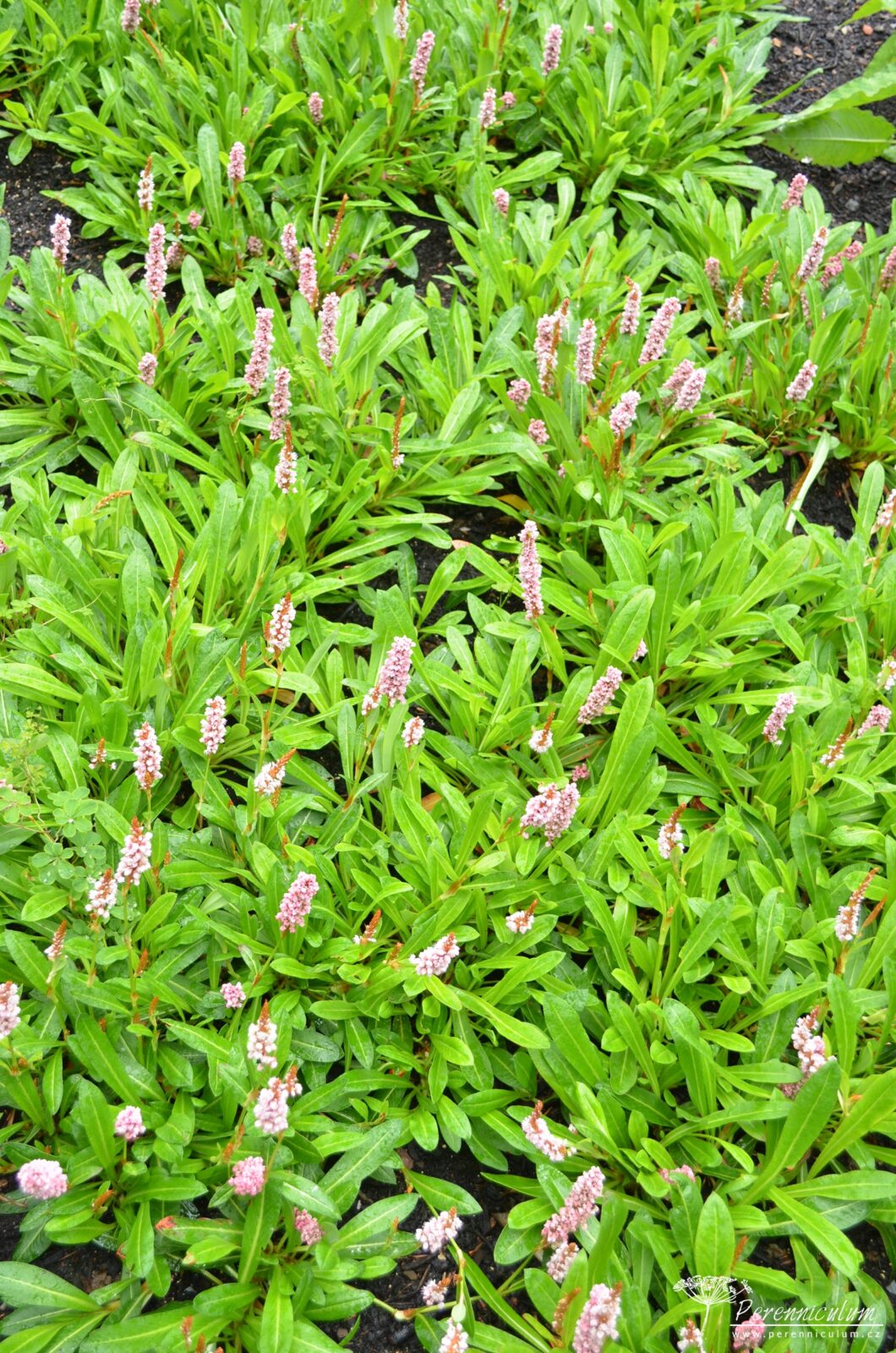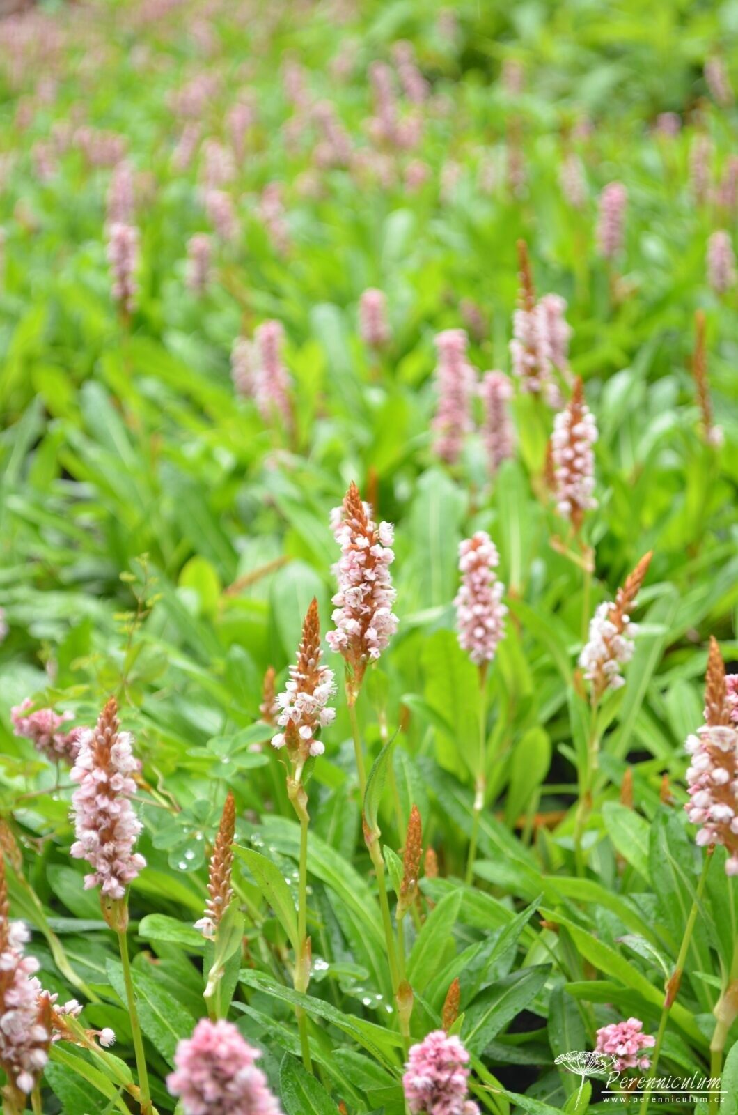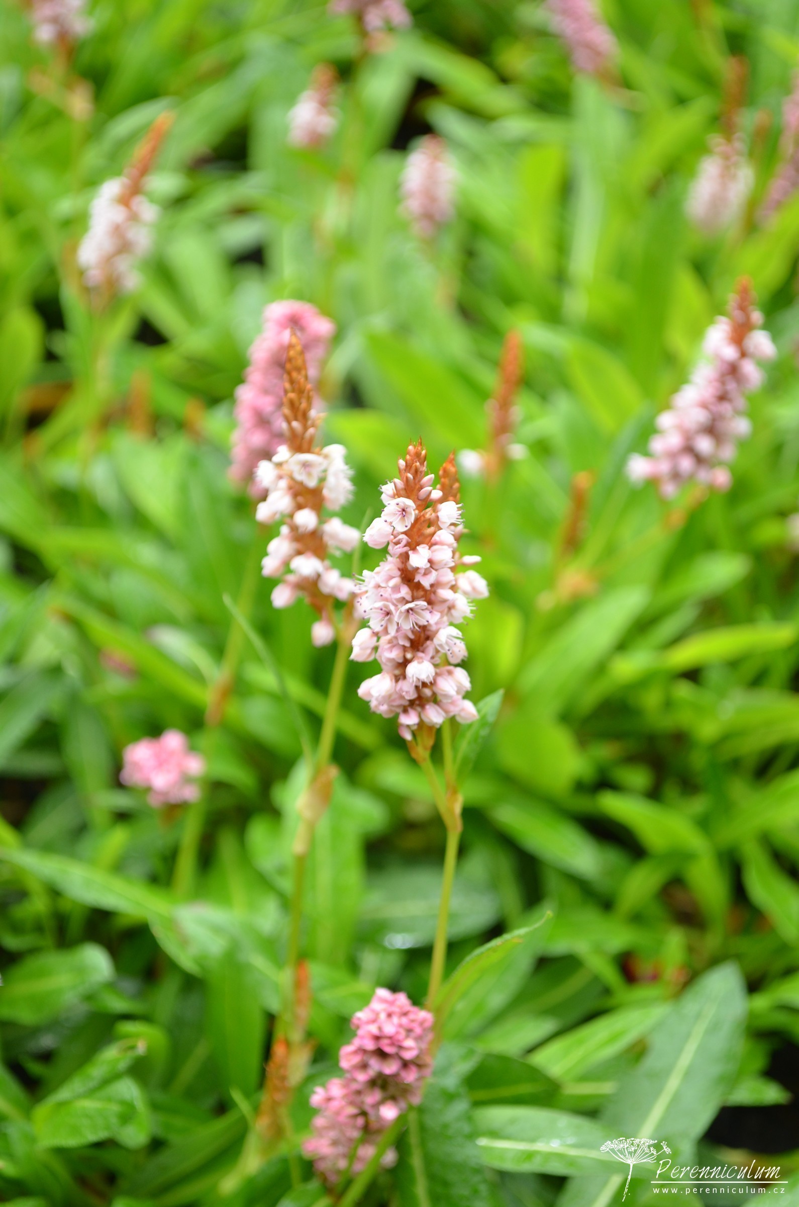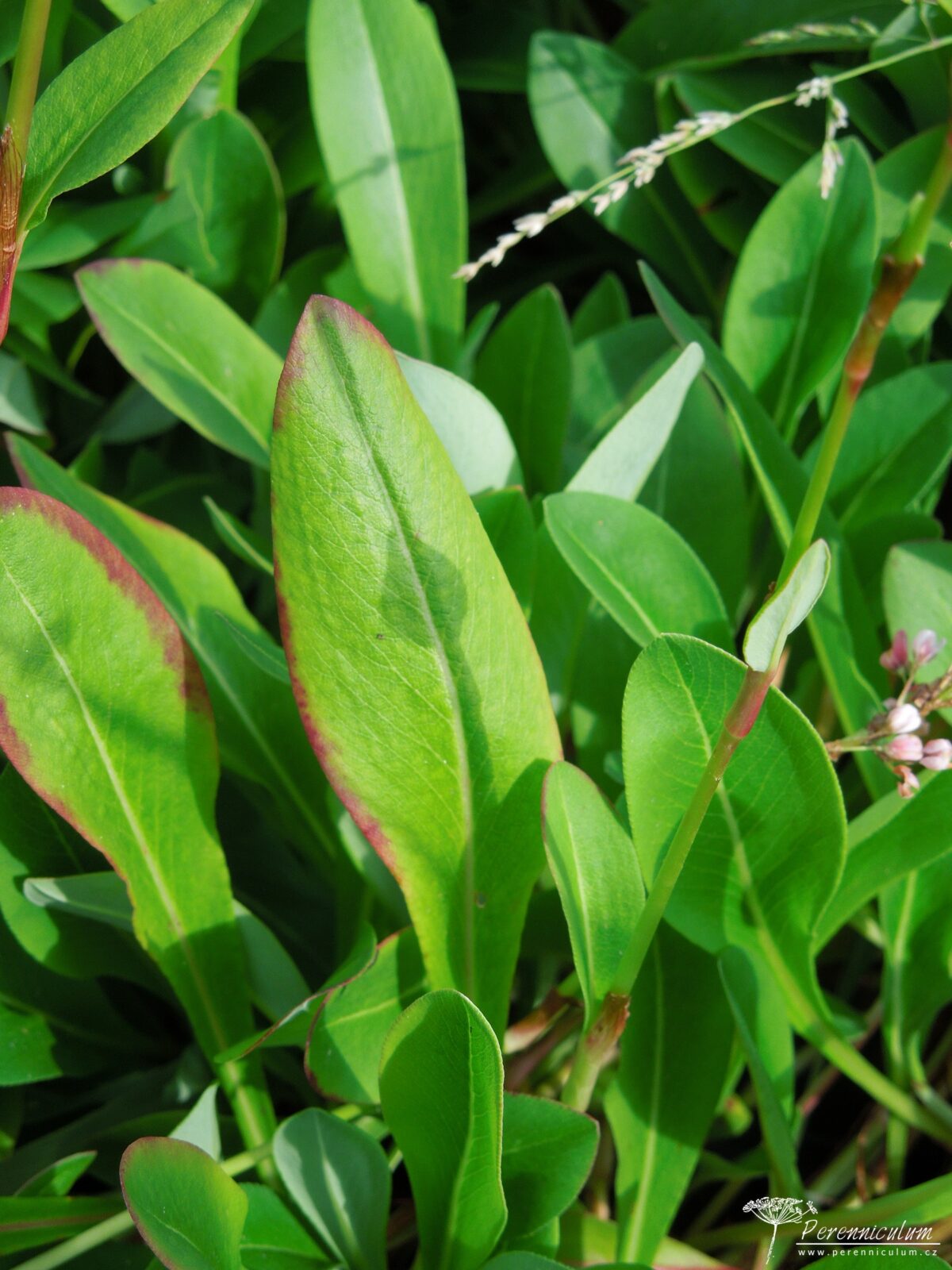 Úzké, kopinaté až elipčité, kožovité listy, které se na podzim barví do rezavě hnědé, vytváří hustý porost široký až 1 metr. V průběhu léta rozkvétají na přímých stoncích úzká, klasovitá, až 7 cm dlouhá, světle růžová květenství, která postupně s odkvétáním přebarvují až do karmínově červené. Stonky dosahují výšky až 25 cm.