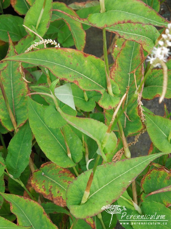 Persicaria amplexicaulis pochází z oblasti Himalájí až jihozápadní Číny, kde obvykle roste v křovinách a na horských loukách podél potoků v nadmořských výškách až 4800 m. Vytváří statné, polštářovité trsy svěže zelených listů z často dřevnatějících bází. Dlouze řapíkaté listy jsou až 25 cm dlouhé, oválné s dlouze špičatým koncem, srdčitou bází a lehce zvlněným okrajem. Nad masou listů se ční tenké, větvené, řídce olistěné stonky nesoucí vzpřímená, úzká, svíčkovitá květenství. 4 až 10 cm dlouhá květenství jsou složena z malých, nejčastěji sytě růžových kvítků.