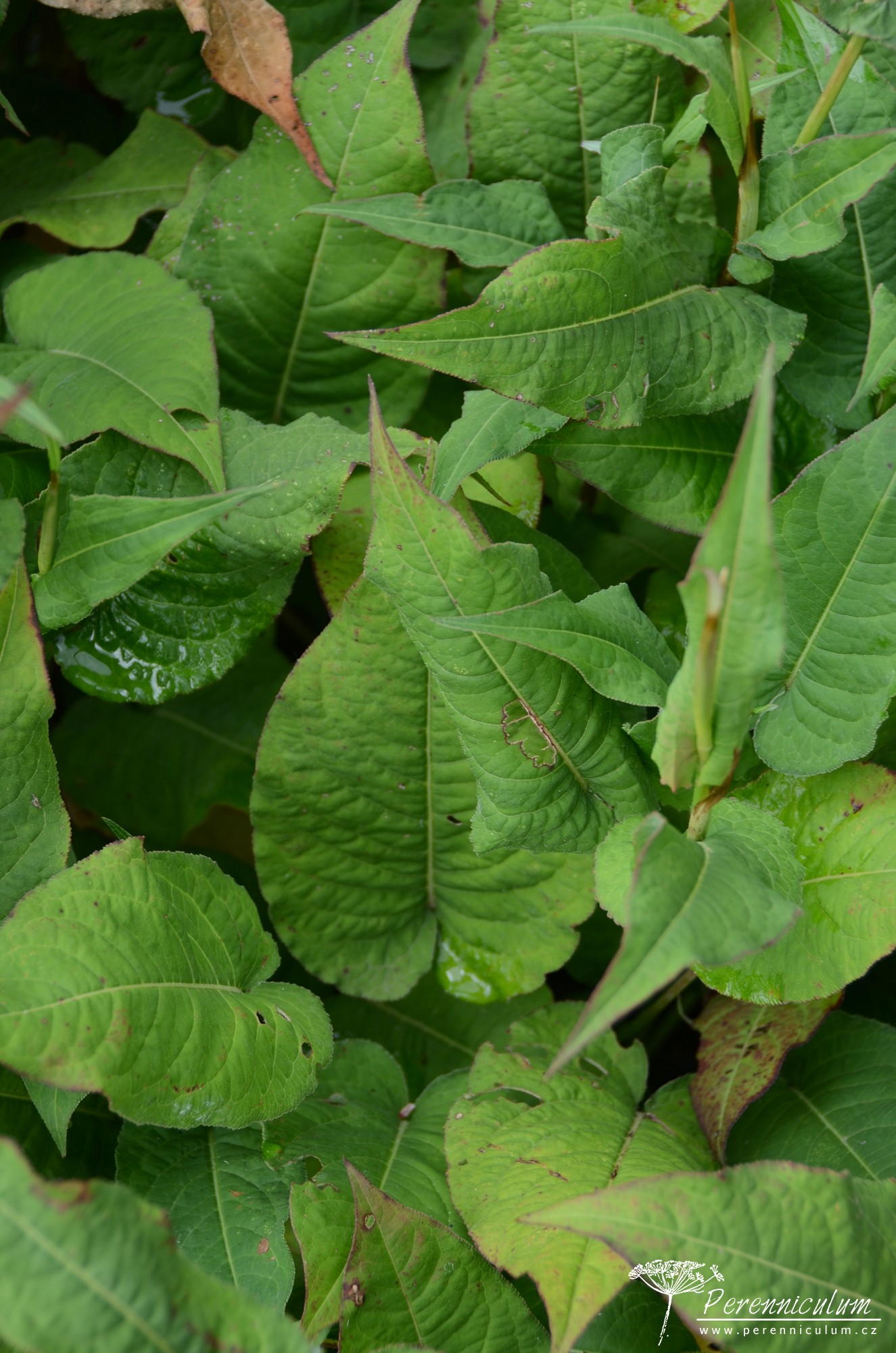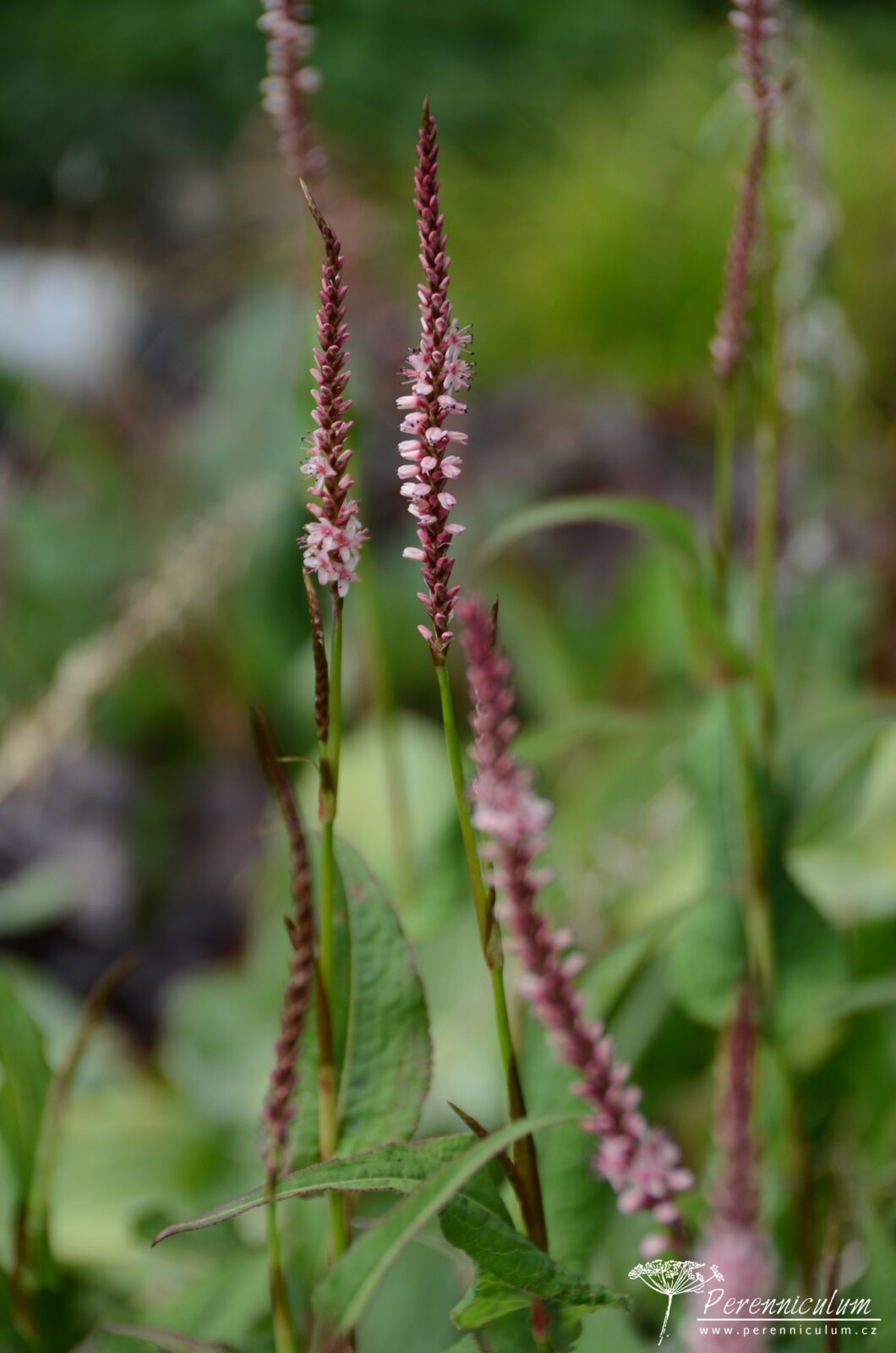 Persicaria amplexicaulis pochází z oblasti Himalájí až jihozápadní Číny, kde obvykle roste v křovinách a na horských loukách podél potoků v nadmořských výškách až 4800 m. Vytváří statné, polštářovité trsy svěže zelených listů z často dřevnatějících bází. Dlouze řapíkaté listy jsou až 25 cm dlouhé, oválné s dlouze špičatým koncem, srdčitou bází a lehce zvlněným okrajem. Nad masou listů se ční tenké, větvené, řídce olistěné stonky nesoucí vzpřímená, úzká, svíčkovitá květenství. 4 až 10 cm dlouhá květenství jsou složena z malých, nejčastěji sytě růžových kvítků.