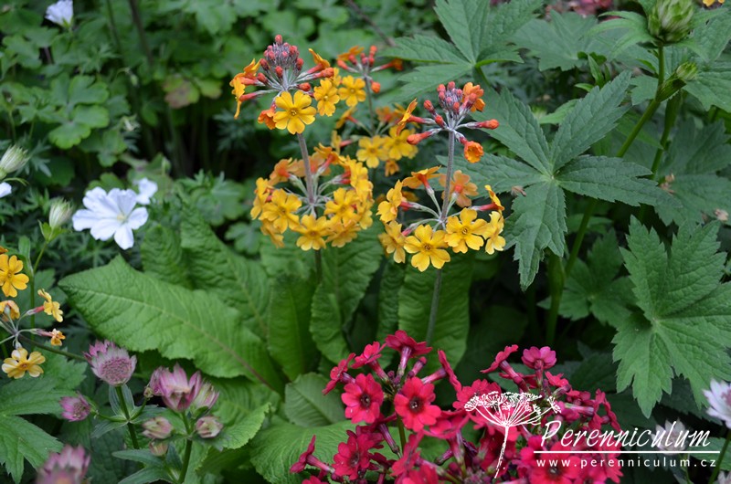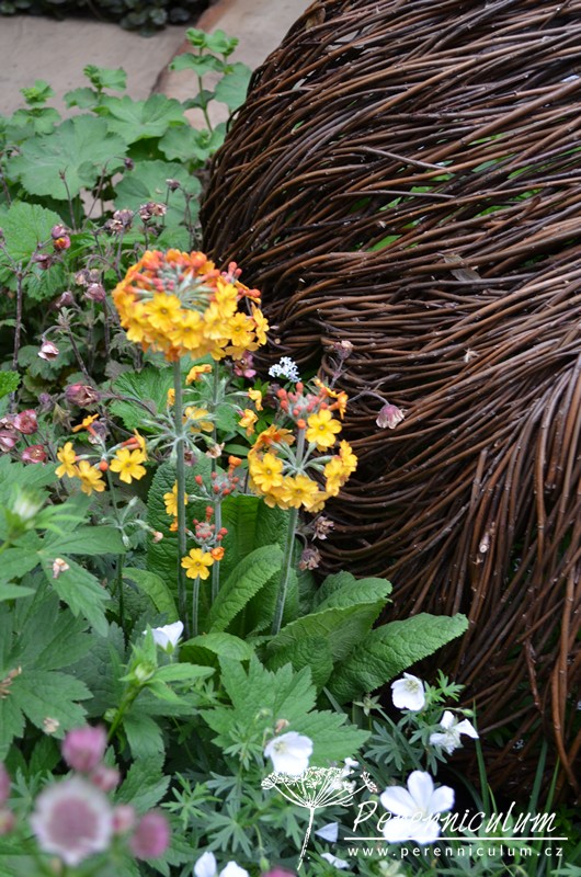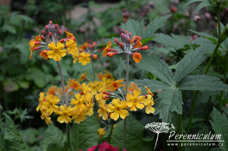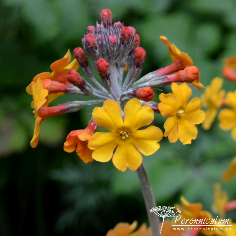 Primula bulleyana se řadí do skupiny tzv. patrovitých prvosenek, které se vyznačují svým etážovým květenstvím. Na vzpřímeném, rovném stonku vyrůstají květy v 5 až 7 přeslenech a nakvétají postupně odspoda nahoru. Z oranžových poupat se rozvíjí sytě oranžovožluté květy, zatímco květní stopky zůstávají hustě bíle pomoučené. Na bázi stonku vyrůstají v přízemní růžici svěže zelené, vrásčité, až 35 cm dlouhé listy s purpurovočervenými řapíky.