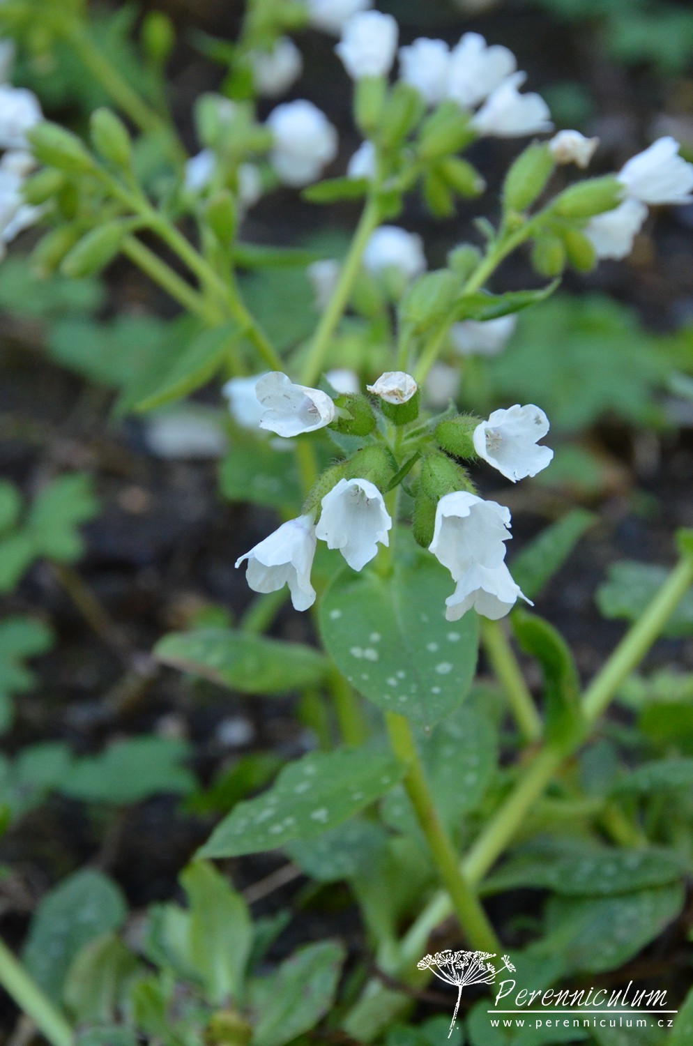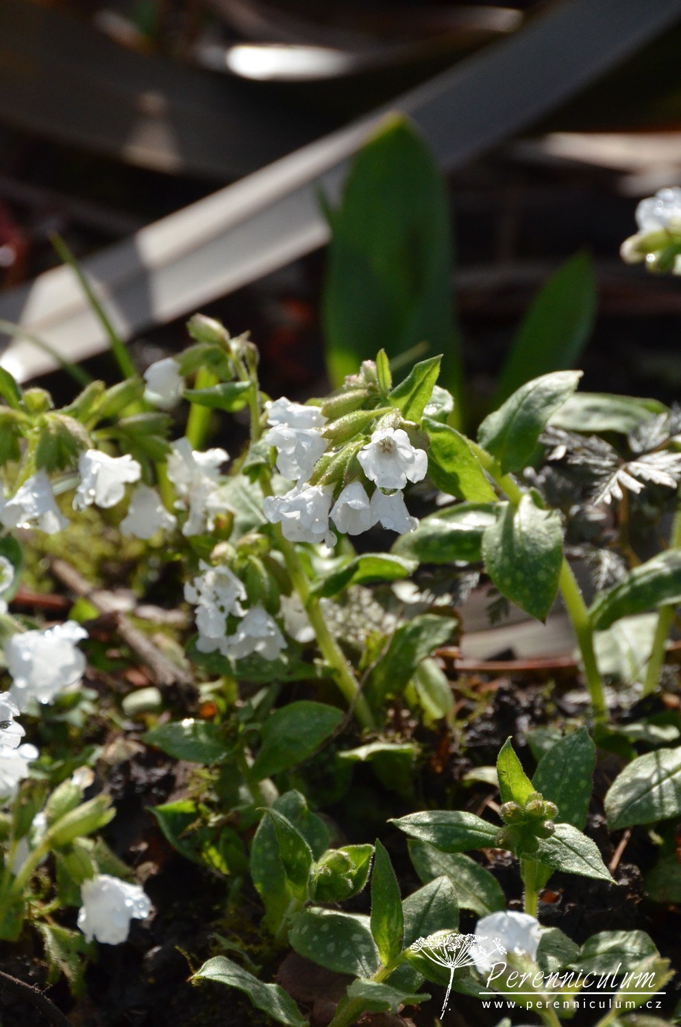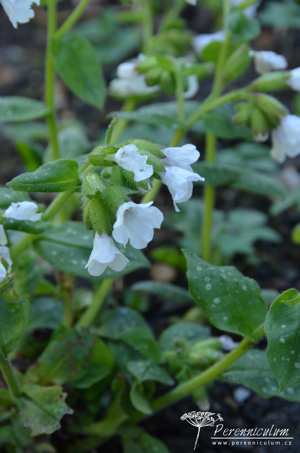 'Sissinghurst White', jak název napovídá, kvete čistě bílými květy. Listy jsou zelené s bílým mramorováním nebo tečkováním. Není tak bujně rostoucí jako modro- a růžovokvěté kultivary. Může být náchylný na padlí. Občas je zaměňován za podobně bíle kvetoucí P. officinalis 'White Wings', který má však růžové oko a neroste tak bujně. Kultivar byl množen a distribuován v zahradě Sissinghurst Castle, ale nepochází odsud.