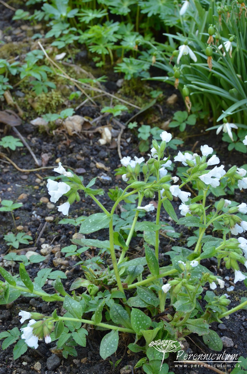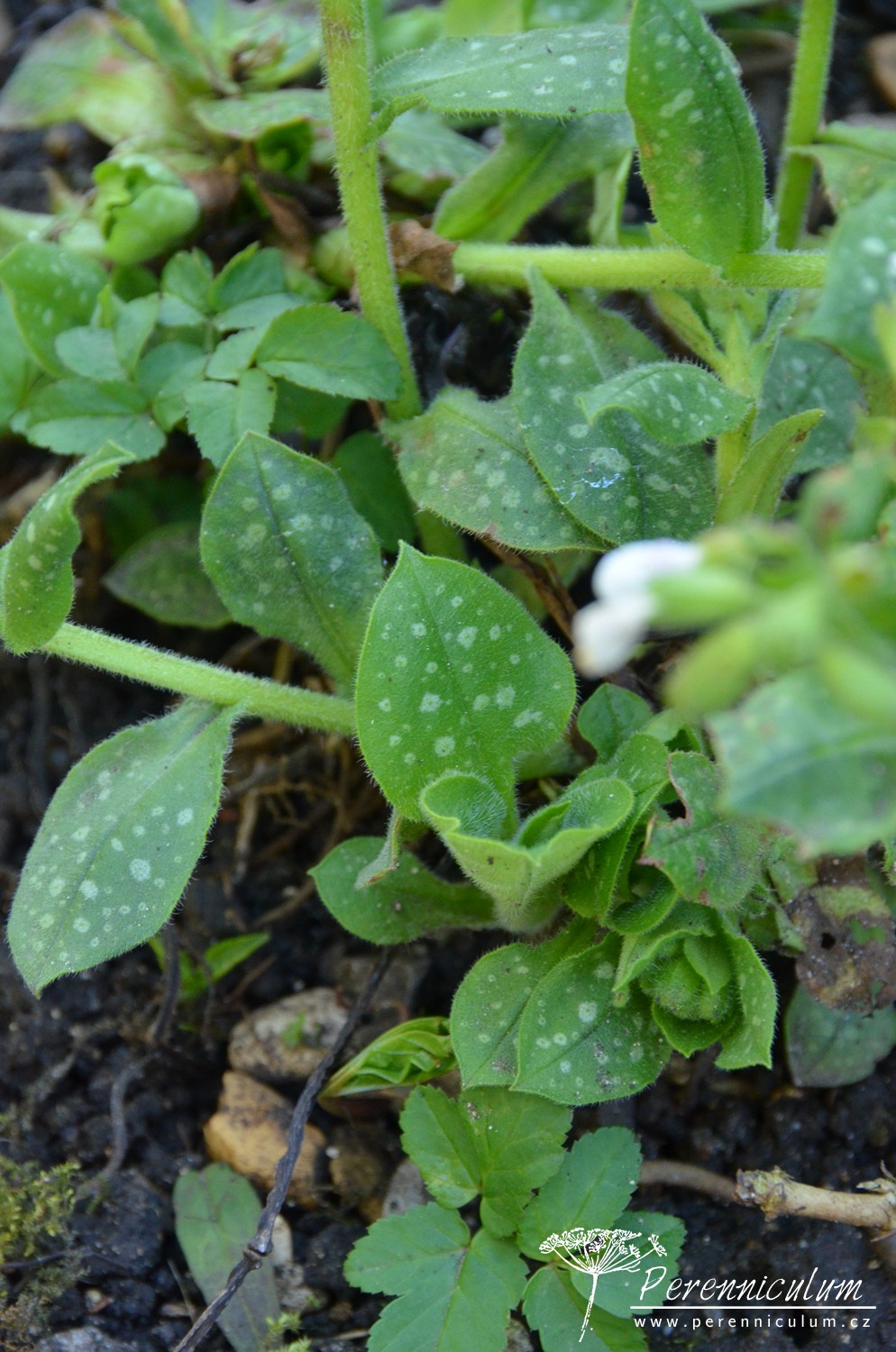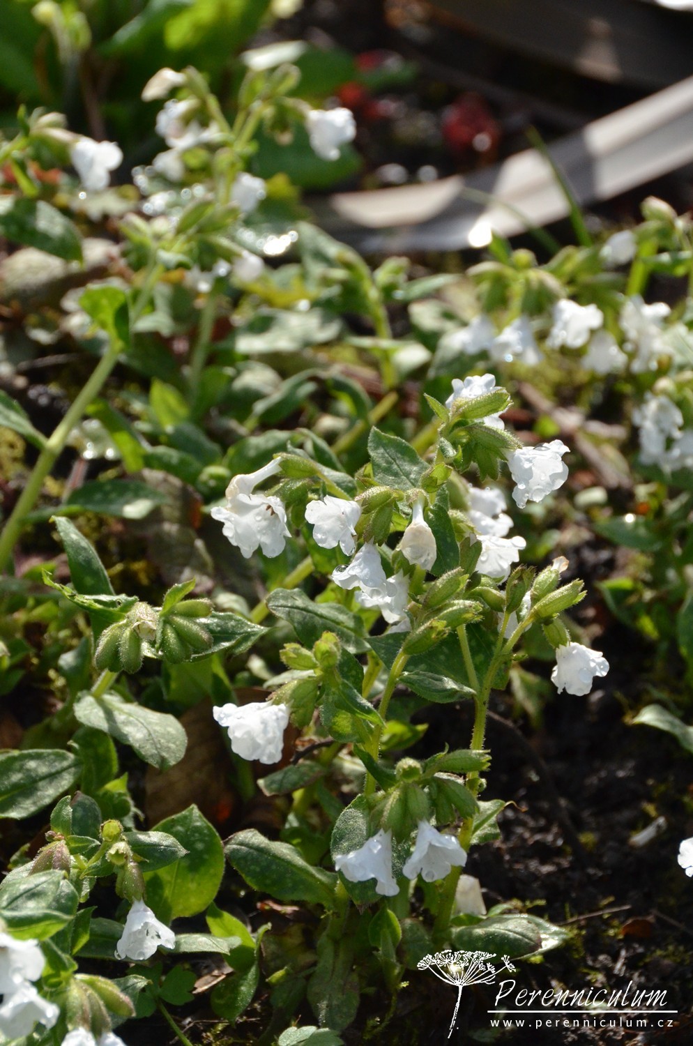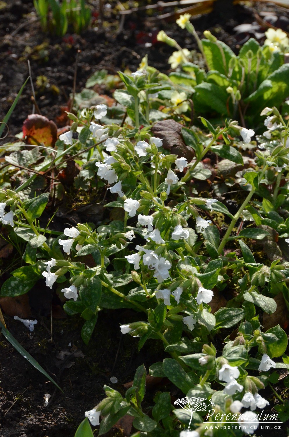 'Sissinghurst White', jak název napovídá, kvete čistě bílými květy. Listy jsou zelené s bílým mramorováním nebo tečkováním. Není tak bujně rostoucí jako modro- a růžovokvěté kultivary. Může být náchylný na padlí. Občas je zaměňován za podobně bíle kvetoucí P. officinalis 'White Wings', který má však růžové oko a neroste tak bujně. Kultivar byl množen a distribuován v zahradě Sissinghurst Castle, ale nepochází odsud.