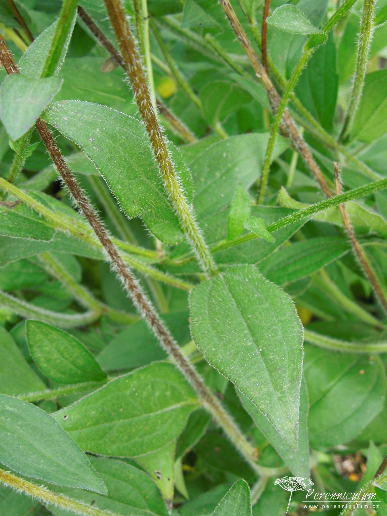 Habitus se může pohybovat od 40 cm do 1 metru výšky a stejně tak v olistění můžeme najít určitou různorodost. Statný kořenový systém se pomalu šíří pomocí krátkých oddenků. Spodní listy jsou dlouze řapíkaté, vejčité až kopinaté, po okraji zubaté či vroubkované, pýřité. Lodyžní listy jsou přisedlé se třemi výraznými žilkami. Tvar, barva, ochlupení a vroubkování se výrazně liší podle jednotlivých variet. Květenství mají až 10 cm v průměru. Výrazný, tmavě hnědý až černavý homolovitý střed obklopuje sytě oranžovožlutý paprsek. Všechny variety a kultivary jsou velmi spolehlivé v kvetení. Kvete od konce července až do října.