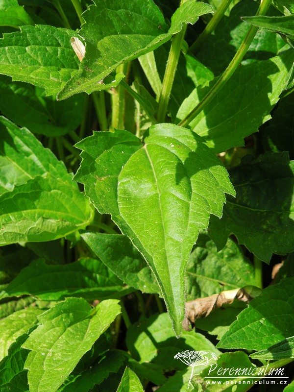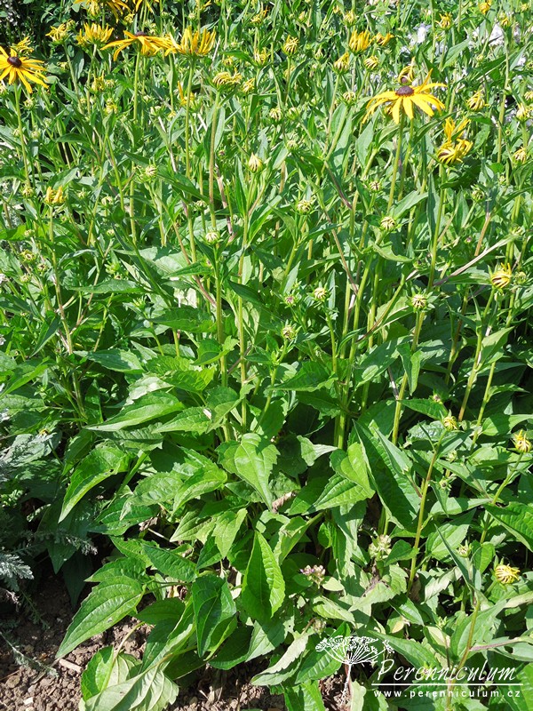 Habitus se může pohybovat od 40 cm do 1 metru výšky a stejně tak v olistění můžeme najít určitou různorodost. Statný kořenový systém se pomalu šíří pomocí krátkých oddenků. Spodní listy jsou dlouze řapíkaté, vejčité až kopinaté, po okraji zubaté či vroubkované, pýřité. Lodyžní listy jsou přisedlé se třemi výraznými žilkami. Tvar, barva, ochlupení a vroubkování se výrazně liší podle jednotlivých variet. Květenství mají až 10 cm v průměru. Výrazný, tmavě hnědý až černavý homolovitý střed obklopuje sytě oranžovožlutý paprsek. Všechny variety a kultivary jsou velmi spolehlivé v kvetení. Kvete od konce července až do října.