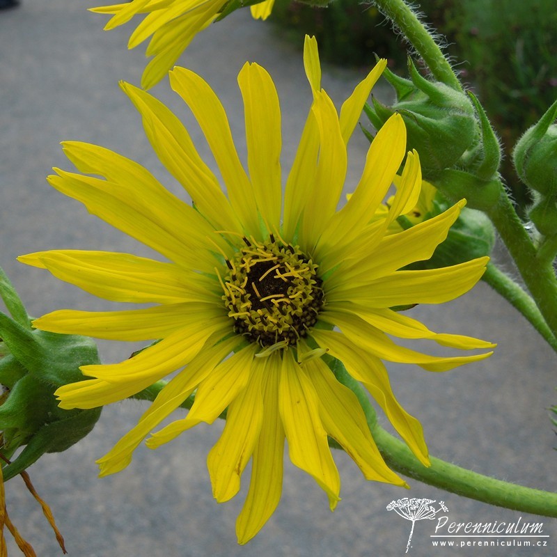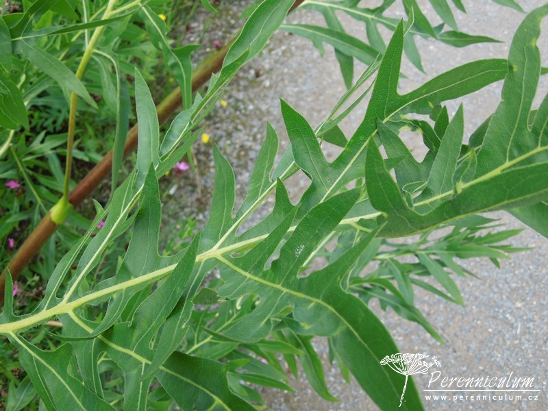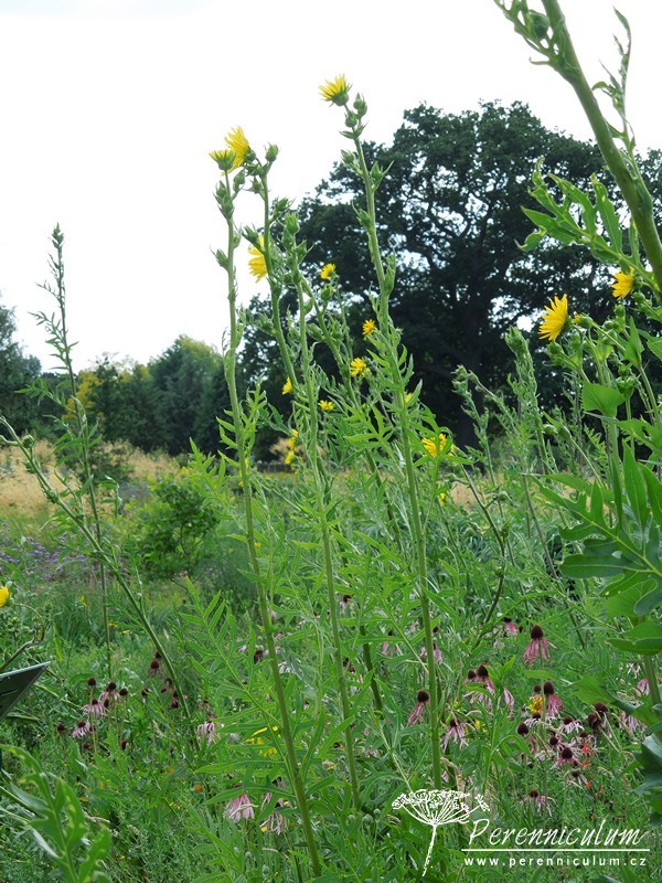 Silphium laciniatum pochází z jižní části Severní Ameriky, kde roste v prériích či na pasekách a mýtinách. Díky robustnímu, hlubokému kořenovému systému snáší i déle trvající sucho a nevadí jí chudá půda. Velké bazální listy dosahují délky až 60 cm, jsou hluboce laločnaté, tuhé, kožovité, na žilkách chlupaté. Čepele listů jsou vertikálně ve směru sever - jih, aby zmírnili odpar vody na přímému slunci během dne, proto se také této trvalce říká kompasová rostlina. Lodyžní listy jsou výrazně menší a méně laločnaté. Stonky jsou vzpřímené, u etablovaných rostlin mohou dosahovat až výšky 3 metrů. Silphium laciniatum vykvétá od července zhruba 10 cm velkými, zářivě žlutými květy. Výborně se hodí do prériových výsadeb, do pozadí perenového rabata, jako dominanta štěrkových záhonů nebo do přírodních sušších partií.