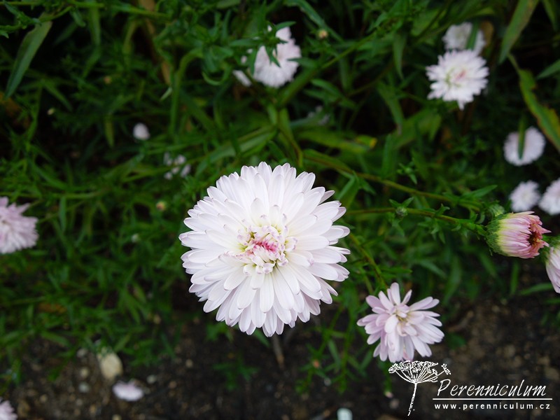 'Priory Blush' je pozdní kultivar kvetoucí malými, poloplnými, bílými květenstvími s nádechem do růžova. Bujné trsy se rychle rozrůstají a dosahují výšky okolo 1 metru. Habitus poněkud rozkladitý díky otevřenému větvení. Vyšlechtěn L. G. Chiswellem v roce 1961.