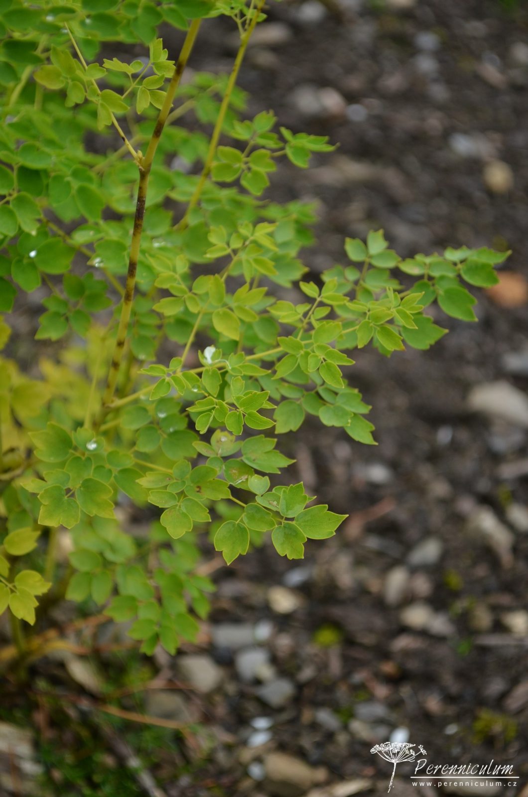 Thalictrum delavayi pochází ze severozápadní Číny, kde roste na alpinských loukách, vlhkých skalnatých útesech, v křovinách i jako doprovod vodních toků v nadmořských výškách od 1800 do 3400 m.n.m. Dosahuje zde výšky až 2 metrů. Až 40 cm velké listy jsou opakovaně dělené (3 až 4 krát zpeřené). Lístky jsou 0,5 až 2 cm malé, kulaté až elipčité, modrozelené až sivozelené. Jemně dělené listy dodávají trvalce spolu s květy něžný, rozevlátý habitus. Květy jsou uspořádány v rozvolněné, až 40 cm velké vrcholové latě. Zhruba 2 cm velké květy postrádají korunní plátky, hlavní efekt zajišťují lila růžové, kališní plátky s velkým množstvím pastelově žlutých tyčinek.