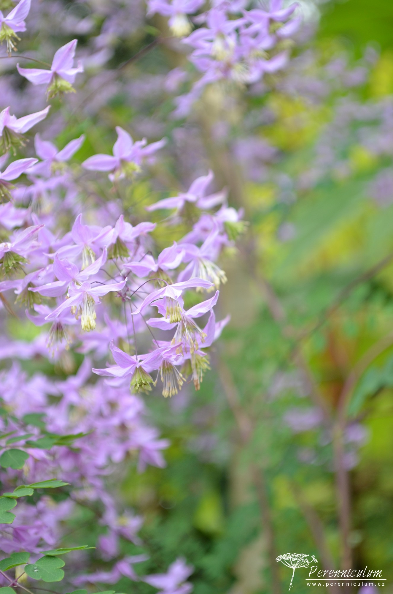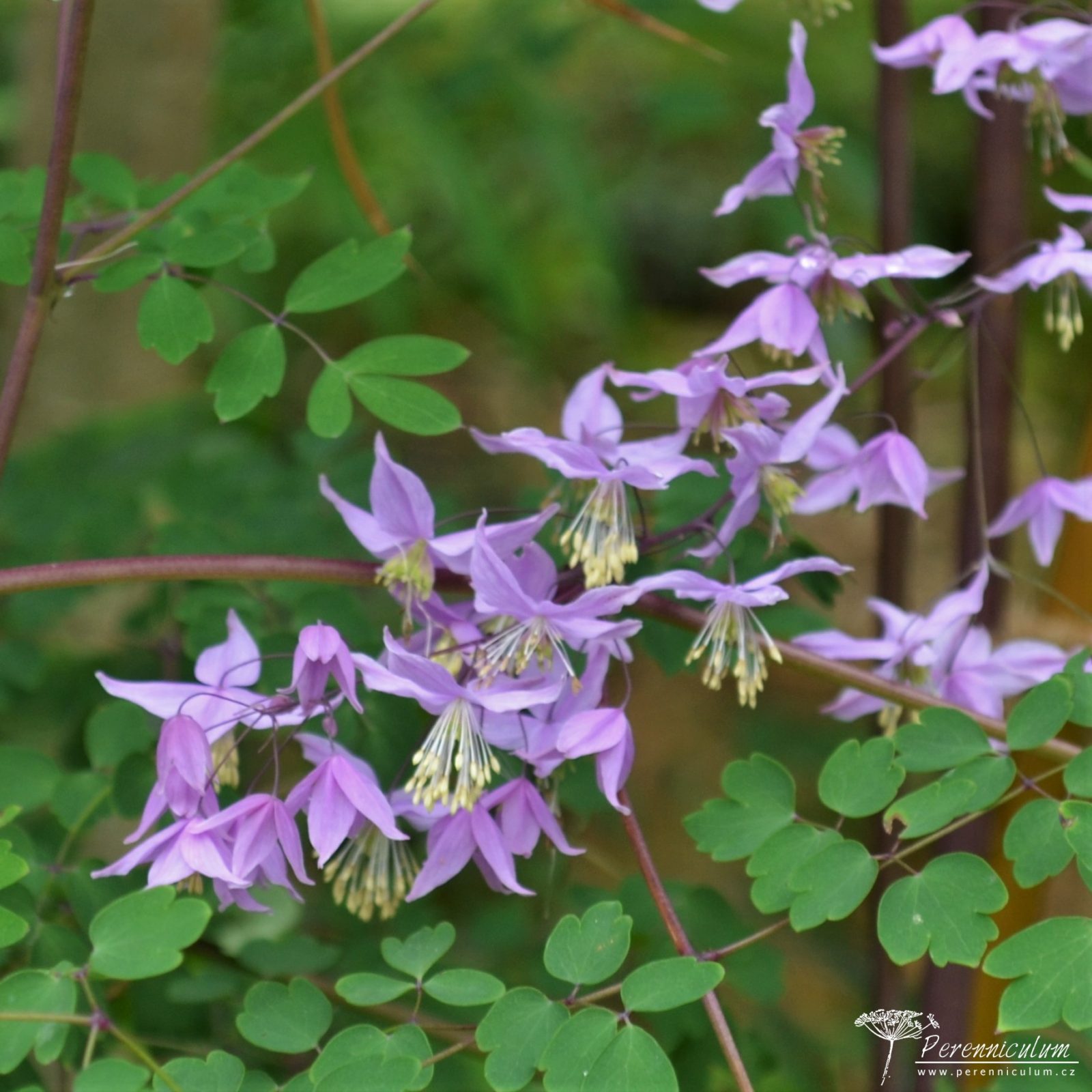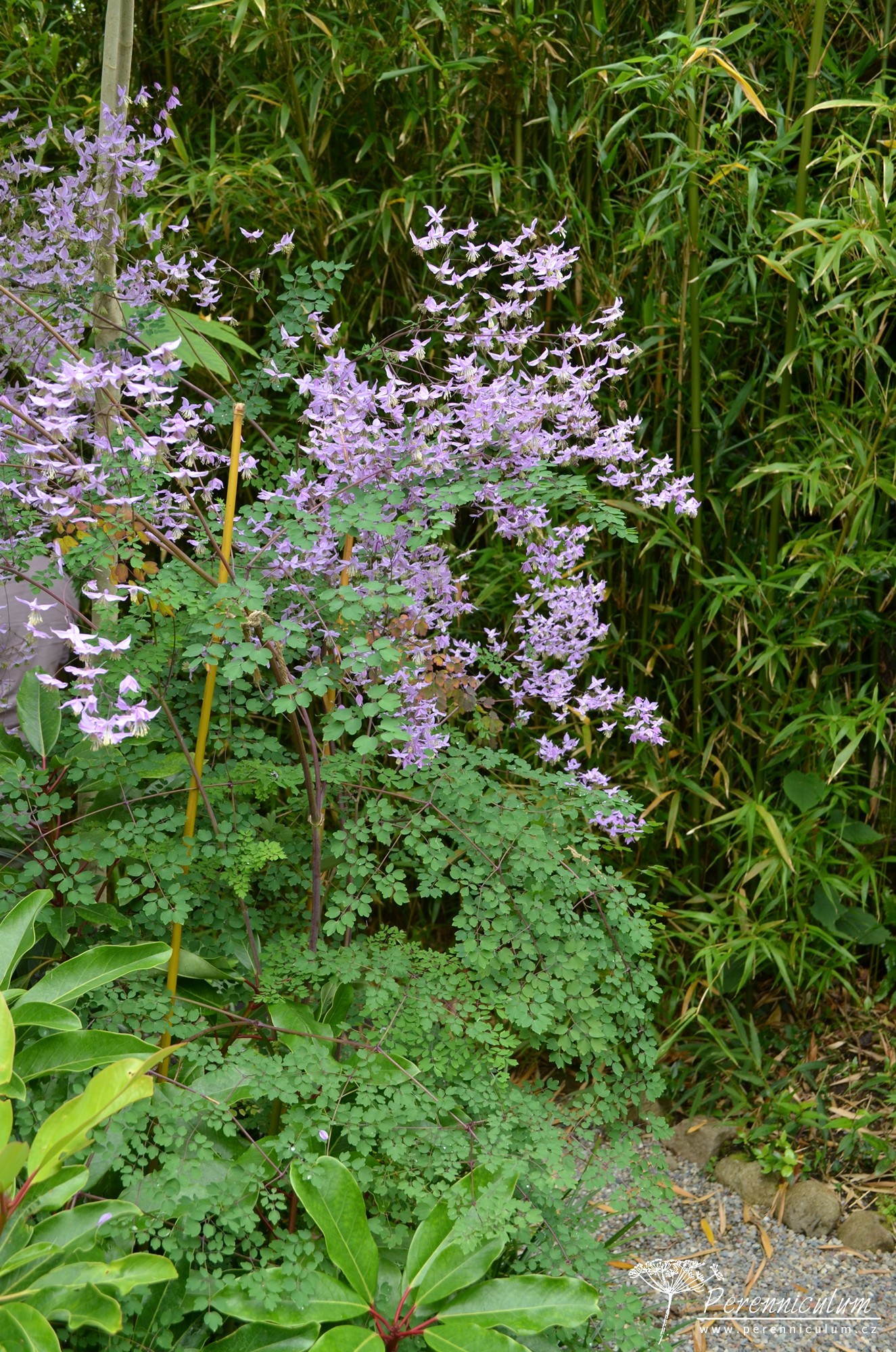 Thalictrum delavayi pochází ze severozápadní Číny, kde roste na alpinských loukách, vlhkých skalnatých útesech, v křovinách i jako doprovod vodních toků v nadmořských výškách od 1800 do 3400 m.n.m. Dosahuje zde výšky až 2 metrů. Až 40 cm velké listy jsou opakovaně dělené (3 až 4 krát zpeřené). Lístky jsou 0,5 až 2 cm malé, kulaté až elipčité, modrozelené až sivozelené. Jemně dělené listy dodávají trvalce spolu s květy něžný, rozevlátý habitus. Květy jsou uspořádány v rozvolněné, až 40 cm velké vrcholové latě na tmavě purpurových stoncích. Zhruba 2 cm velké květy postrádají korunní plátky, hlavní efekt zajišťují lila růžové, kališní plátky s velkým množstvím pastelově žlutých tyčinek.