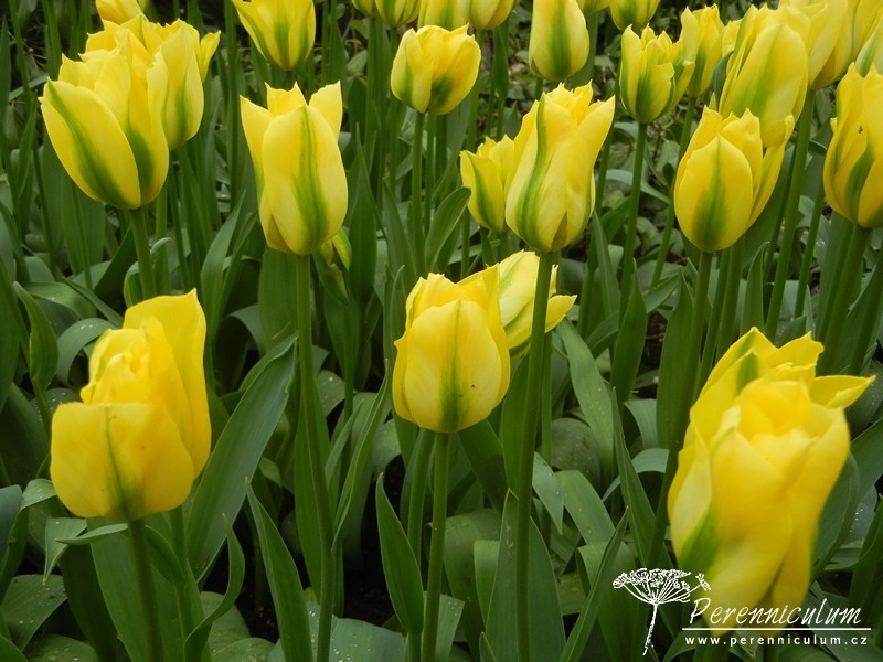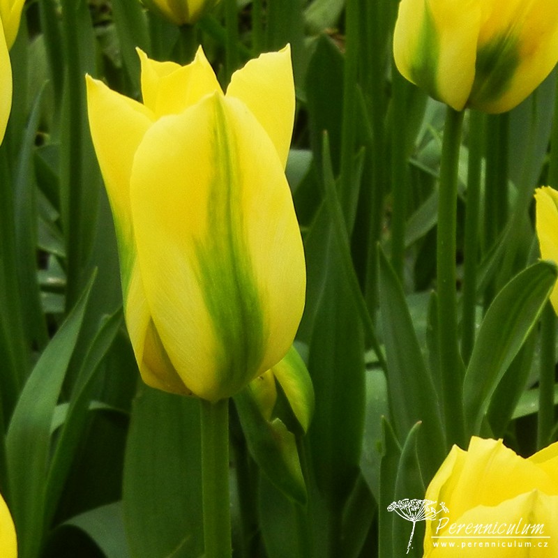 Tulipa 'Yellow Spring Green' kvete velmi světle sírově žlutými květy, jejich okvětní plátky jsou na vnější straně od báze zeleně žíhané. Kultivar byl uveden na trh v roce 1999.