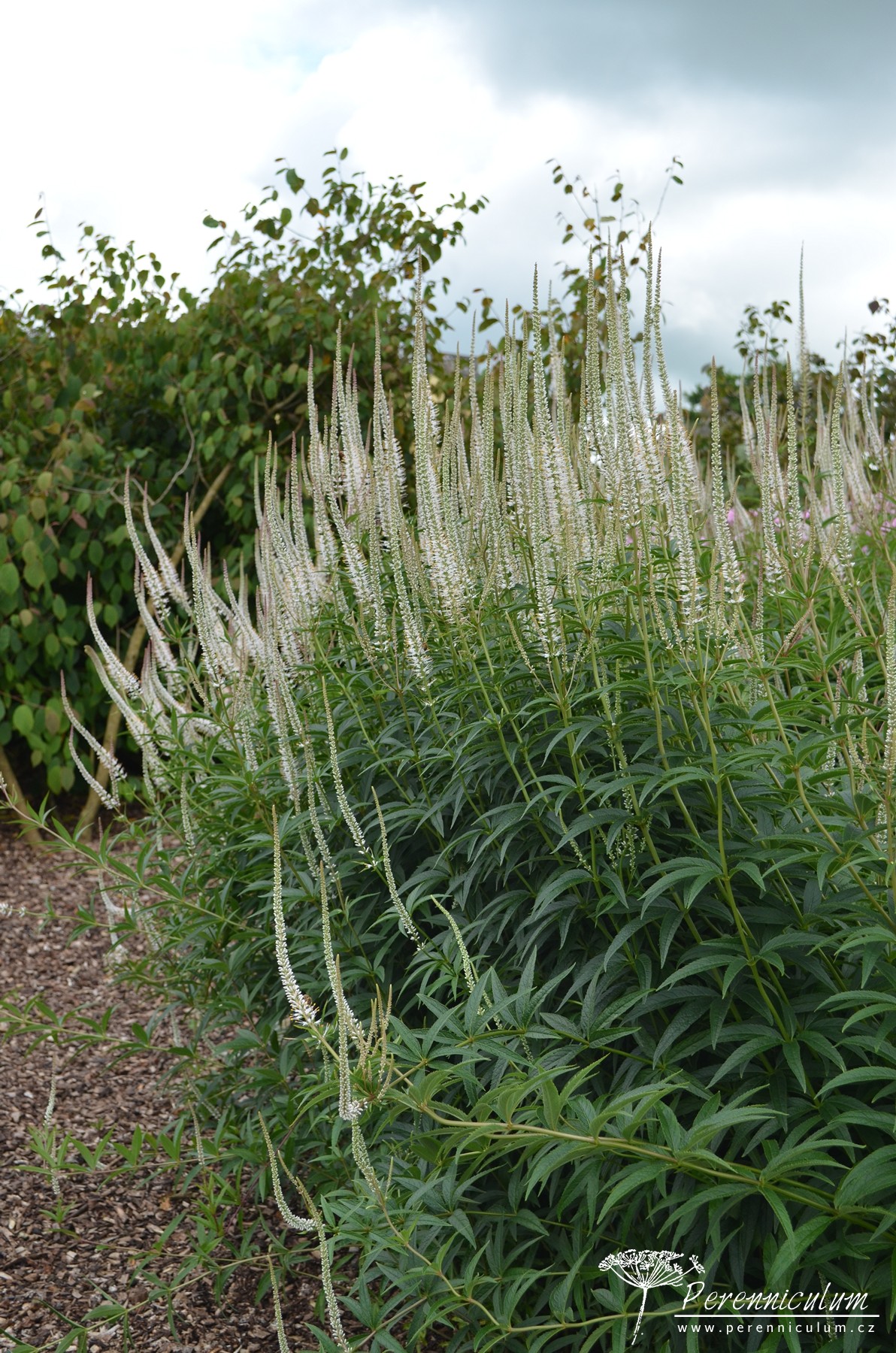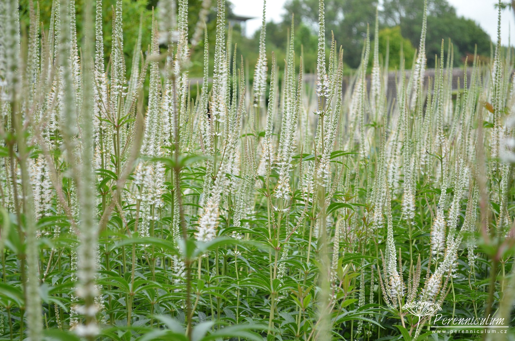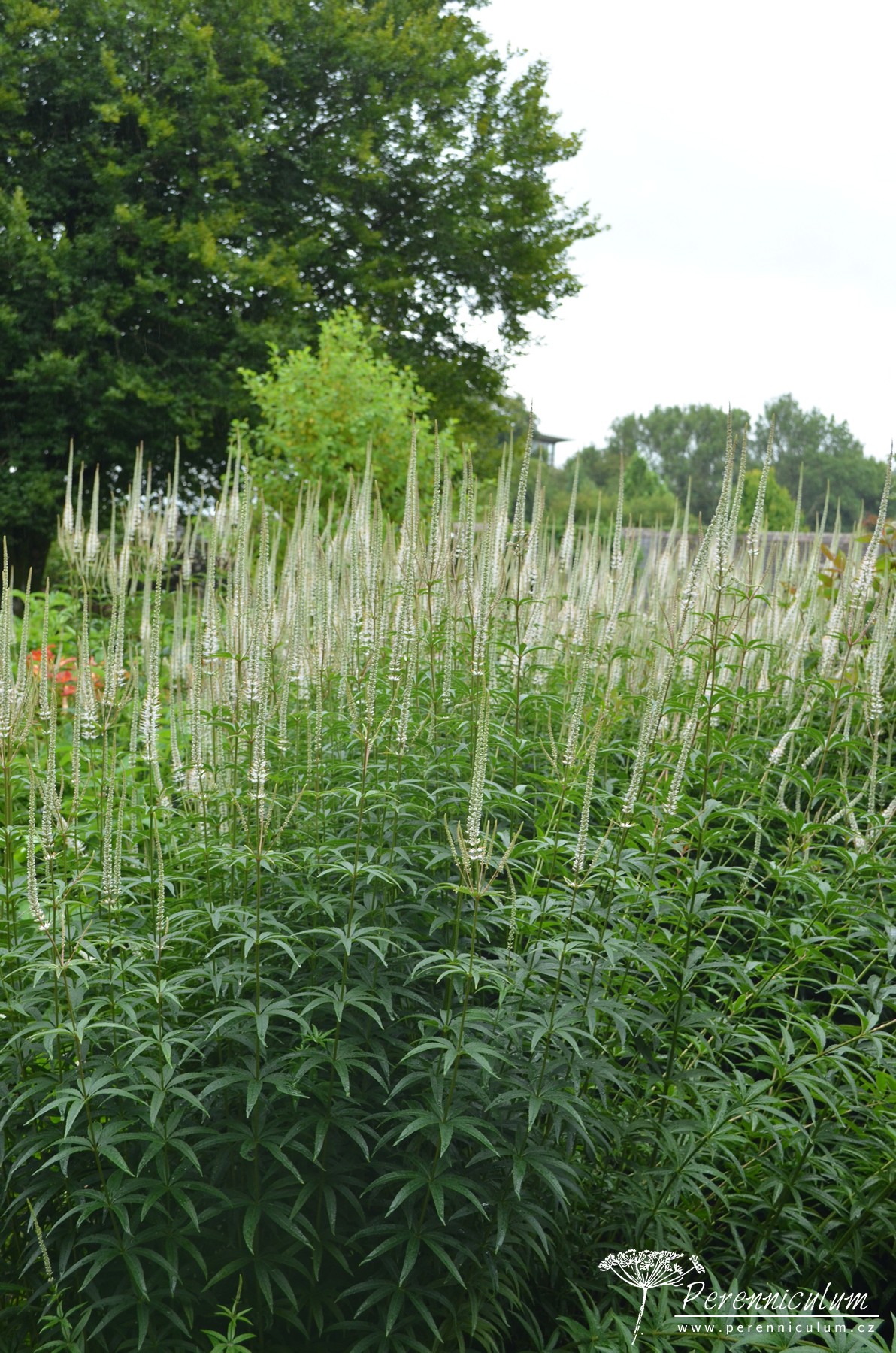 Veronicastrum virginicum je domácí trvalkou východní části Severní Ameriky, kde roste na loukách, prériích, ve světlých lesích a křovinách. Na vysokých přímých stoncích vyrůstají po 3 až 6 v přeslenech úzké, kopinaté, až 20 cm dlouhé listy. Nad posledním přeslenem listů se stonek obvykle větví, aby dal vznik několika hroznovitým, úzkým, špičatým květenstvím. Centrální (primární) hrozen se otevírá jako první a asi v půlce jeho kvetení začínají nakvétat sekundární hrozny, které jej v kruhu obklopují. Sekundární hrozny jsou obvykle kratší a užší. Květenství s poupaty se objevuje od června, ale naplno kvete až během července a srpna. Po odkvětu zůstává Veronicastrum virginicum atraktivní svými plodenstvími, která drží pohromadě (nerozpadají se) dlouho do zimy. Velmi dobře se kombinuje s vysokými trávami či trvalkami s kontrastním kulovitým květenstvím (např. Echinops ritro, Eryngium sp.). Díky své výšce se hodí spíše do pozadí perenového rabata.