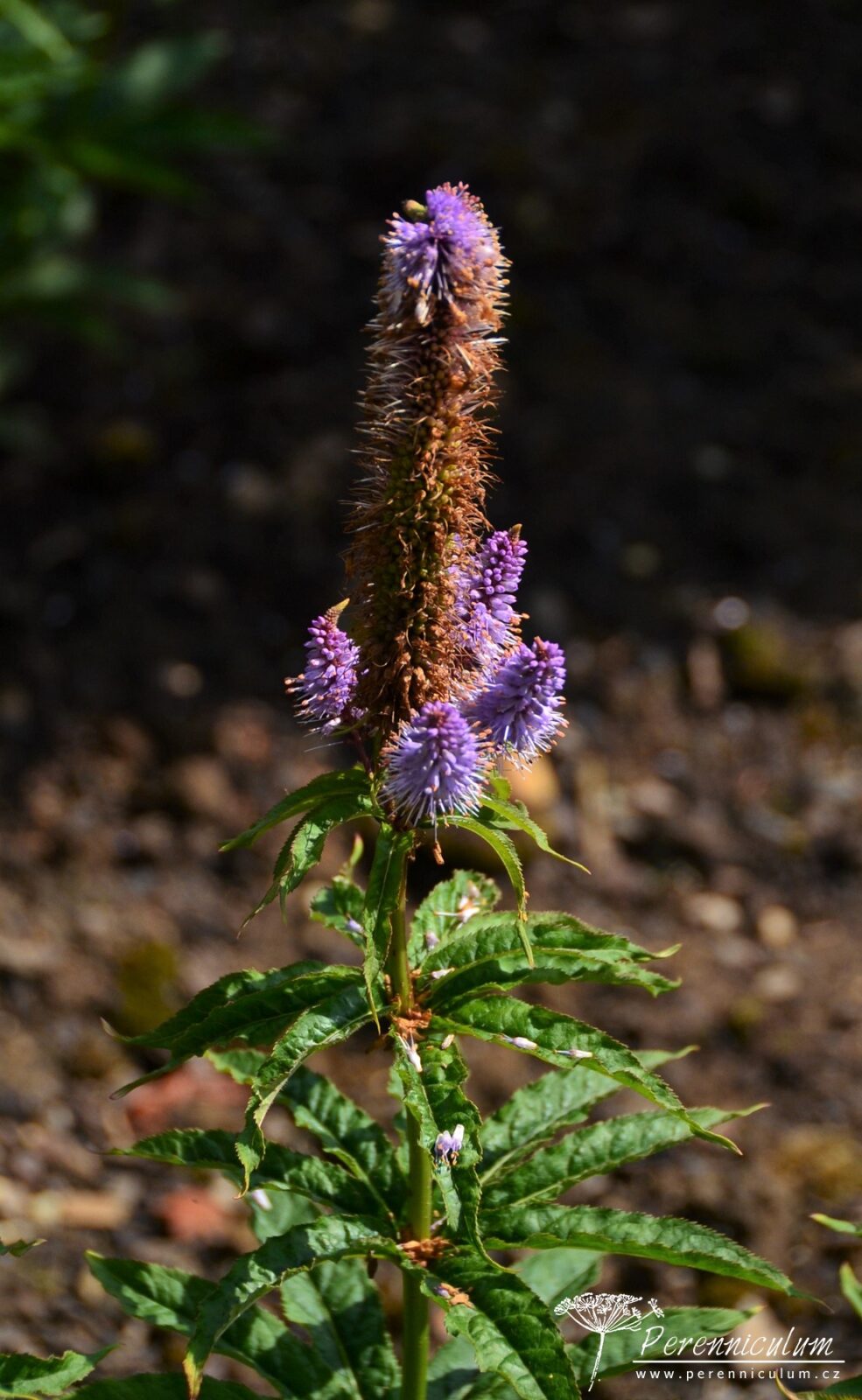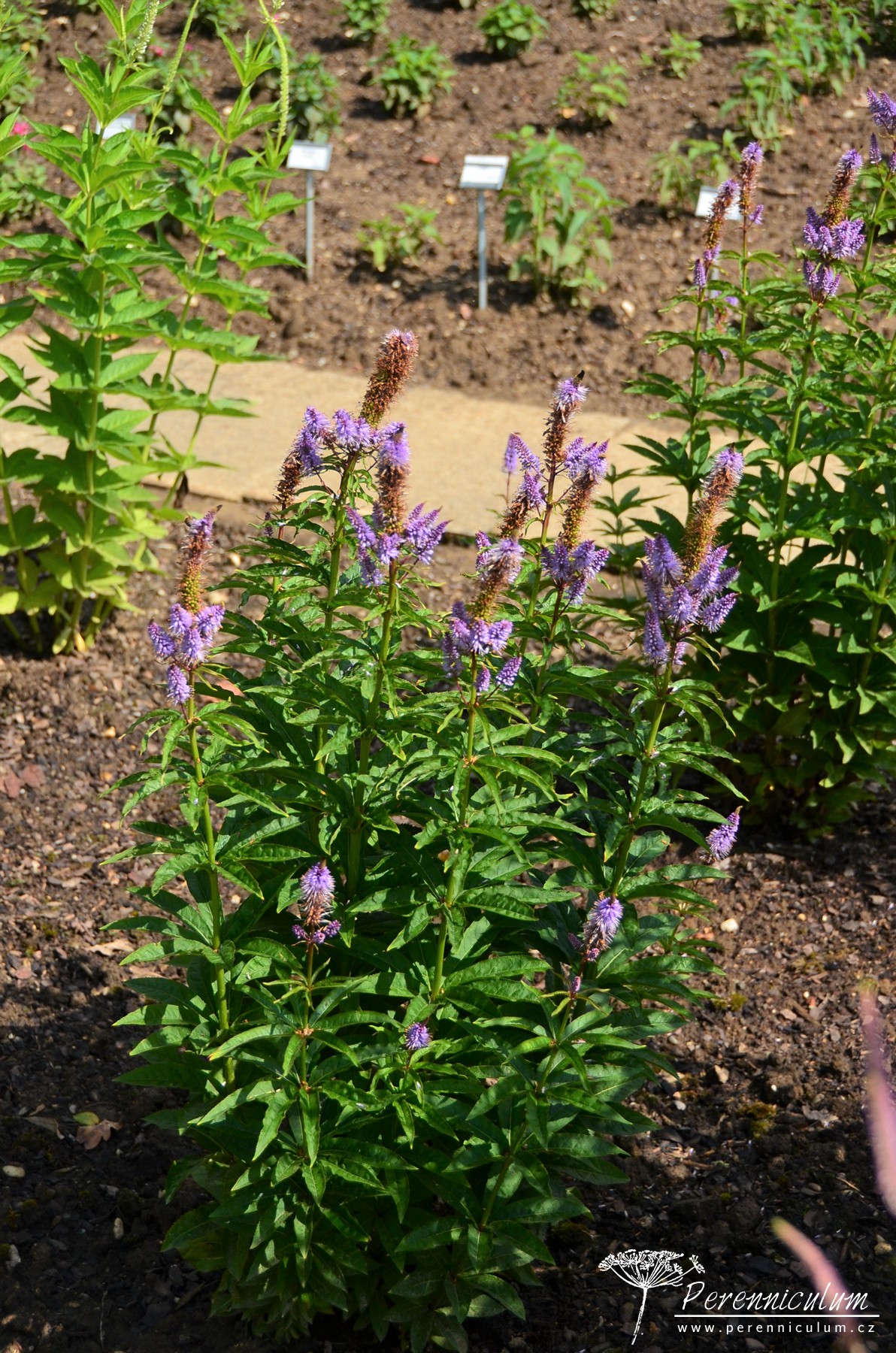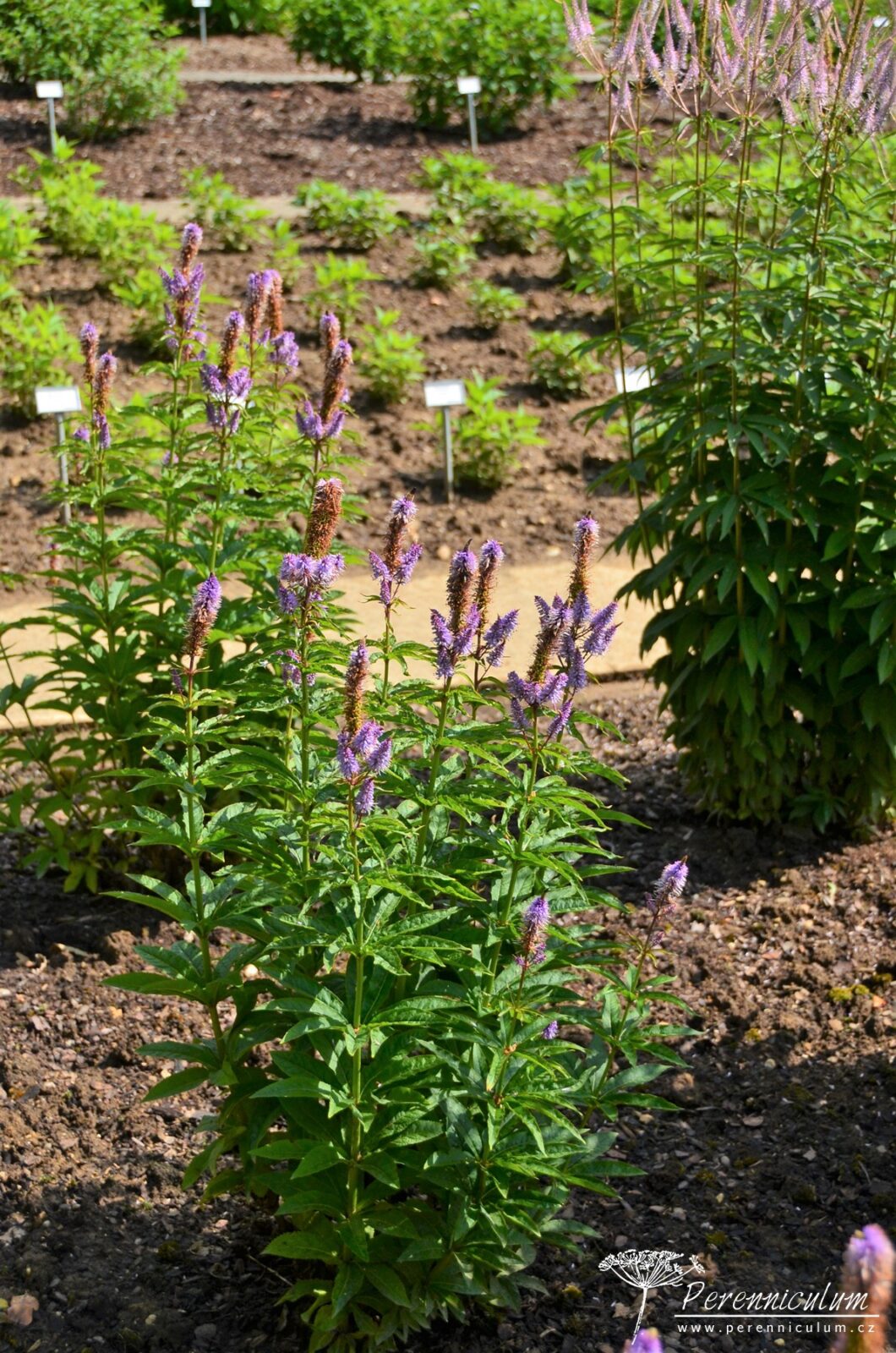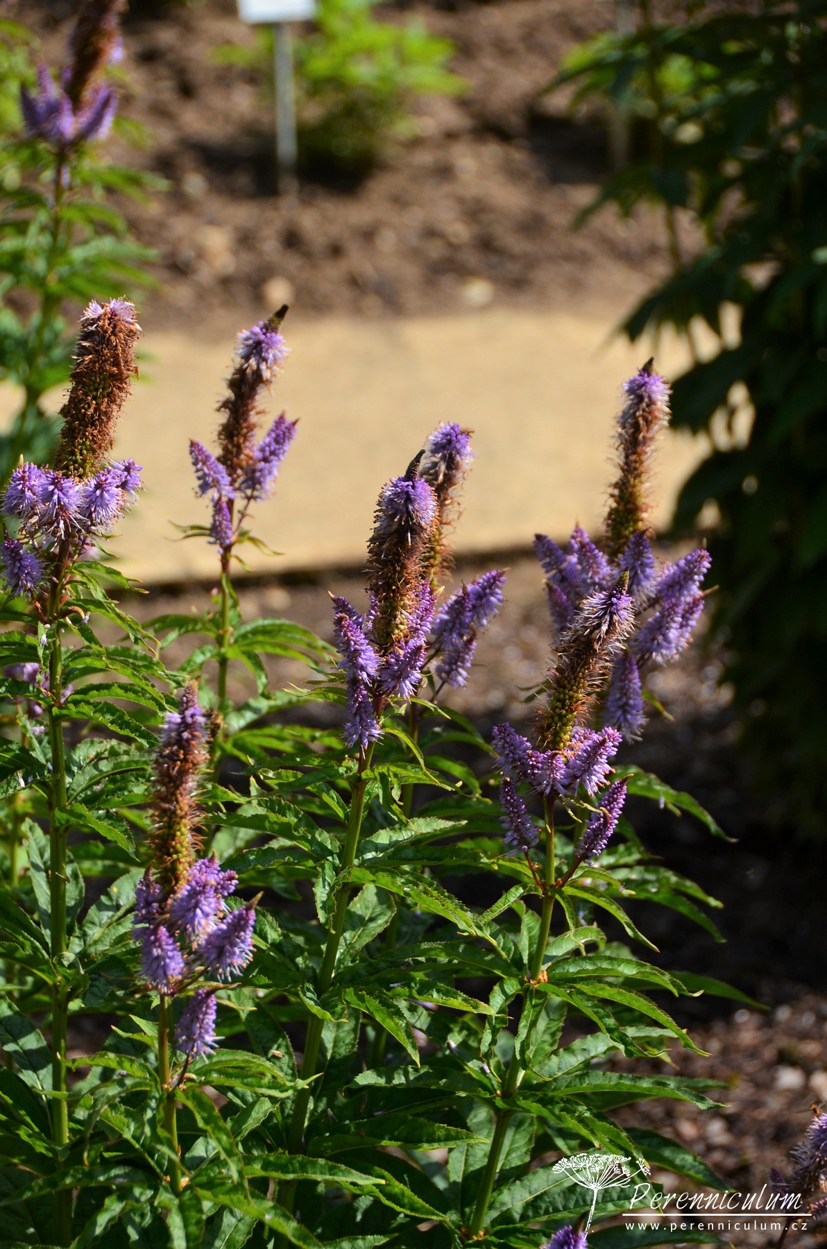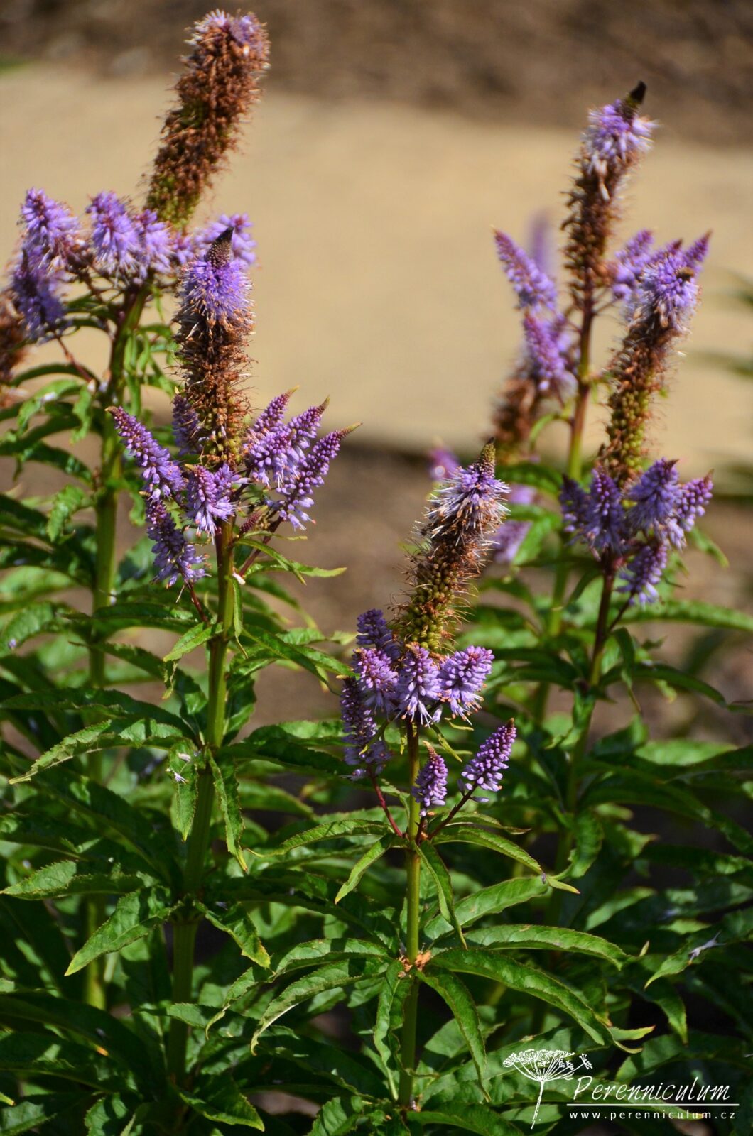 Veronicastrum virginicum je domácí trvalkou východní části Severní Ameriky, kde roste na loukách, prériích, ve světlých lesích a křovinách. Na vysokých přímých stoncích vyrůstají po 3 až 6 v přeslenech úzké, kopinaté, až 20 cm dlouhé listy. Nad posledním přeslenem listů se stonek obvykle větví, aby dal vznik několika hroznovitým, úzkým, špičatým květenstvím. Centrální (primární) hrozen se otevírá jako první a asi v půlce jeho kvetení začínají nakvétat sekundární hrozny, které jej v kruhu obklopují. Sekundární hrozny jsou obvykle kratší a užší. Květenství s poupaty se objevuje od června, ale naplno kvete až během července a srpna. Po odkvětu zůstává Veronicastrum virginicum atraktivní svými plodenstvími, která drží pohromadě (nerozpadají se) dlouho do zimy. Velmi dobře se kombinuje s vysokými trávami či trvalkami s kontrastním kulovitým květenstvím (např. Echinops ritro, Eryngium sp.). Díky své výšce se hodí spíše do pozadí perenového rabata.